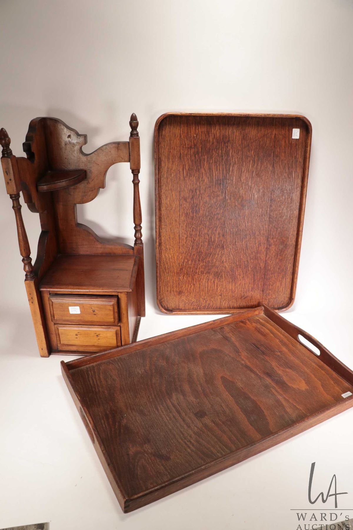 Antique Victorian dresser side converted to corner cabinet 22" H X 9" X 9.5" plus two wooden serving tray 22" X 16" and a 23" X 15 1/2: