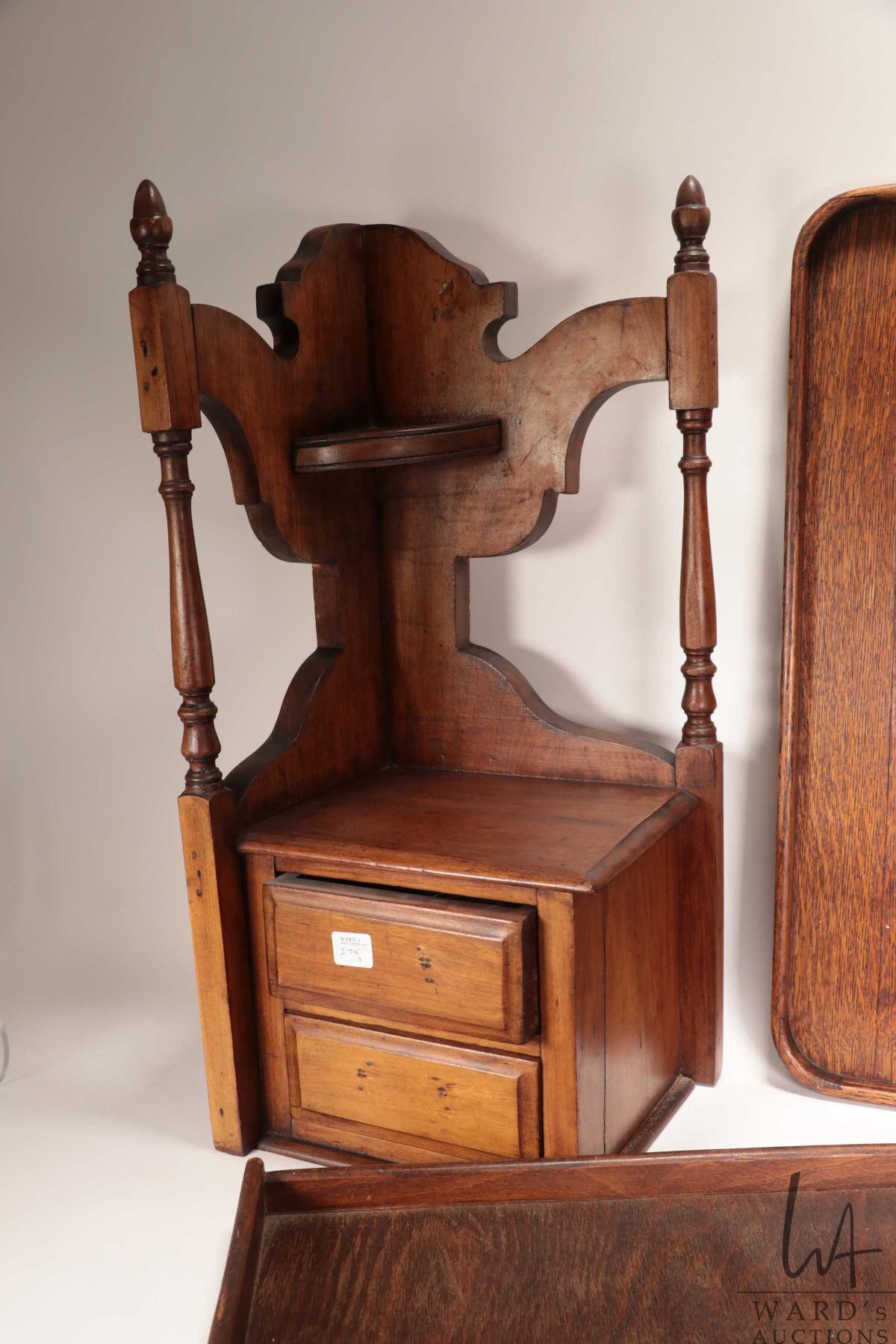 Lot 275 Antique Victorian dresser side converted to corner cabinet 22" H X 9" X 9.5" plus two wooden serving