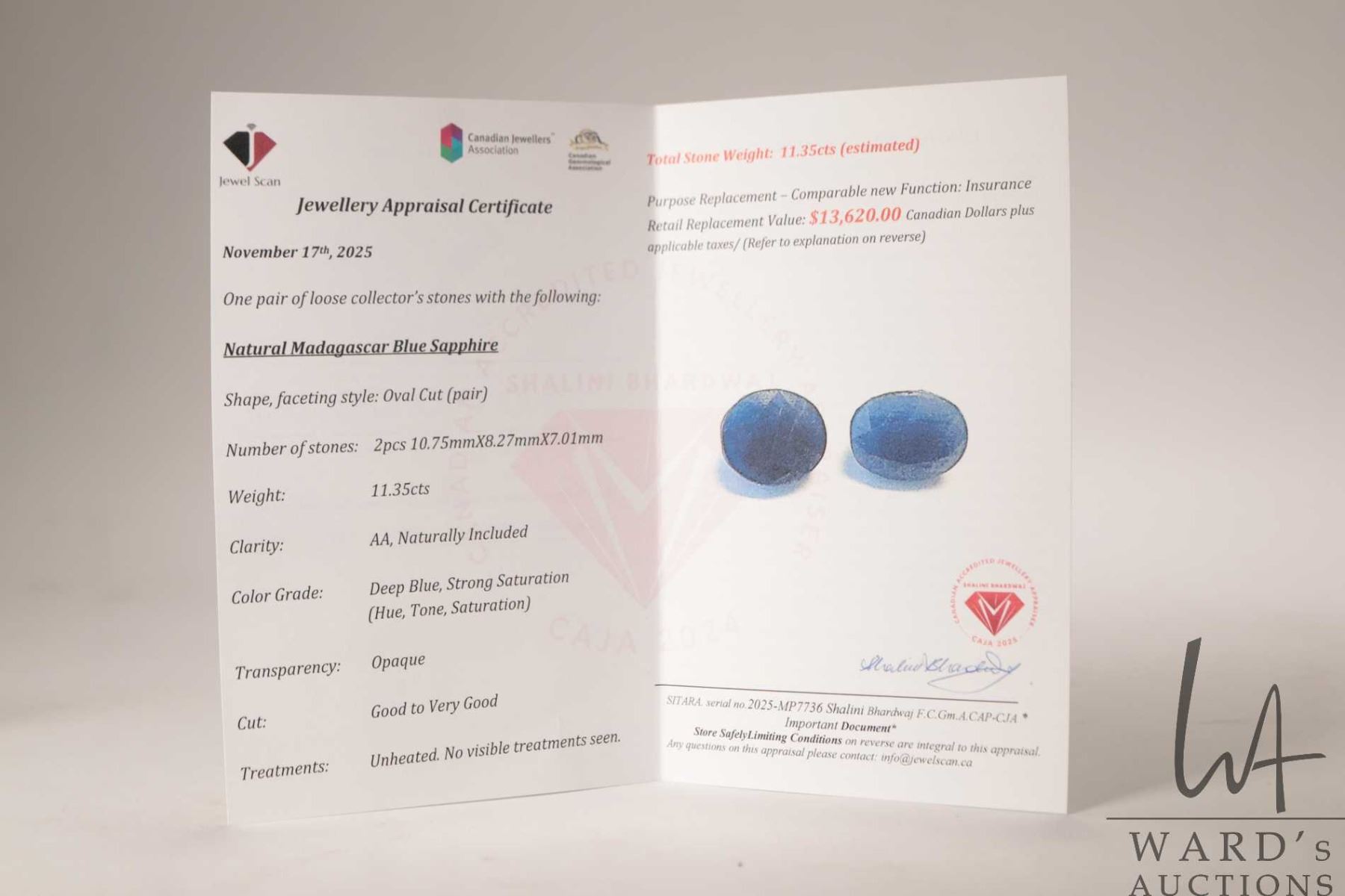 Pair of Madagascar blue sapphire oval cut gemstones, 11.35 cts. with certificate provided by consignor