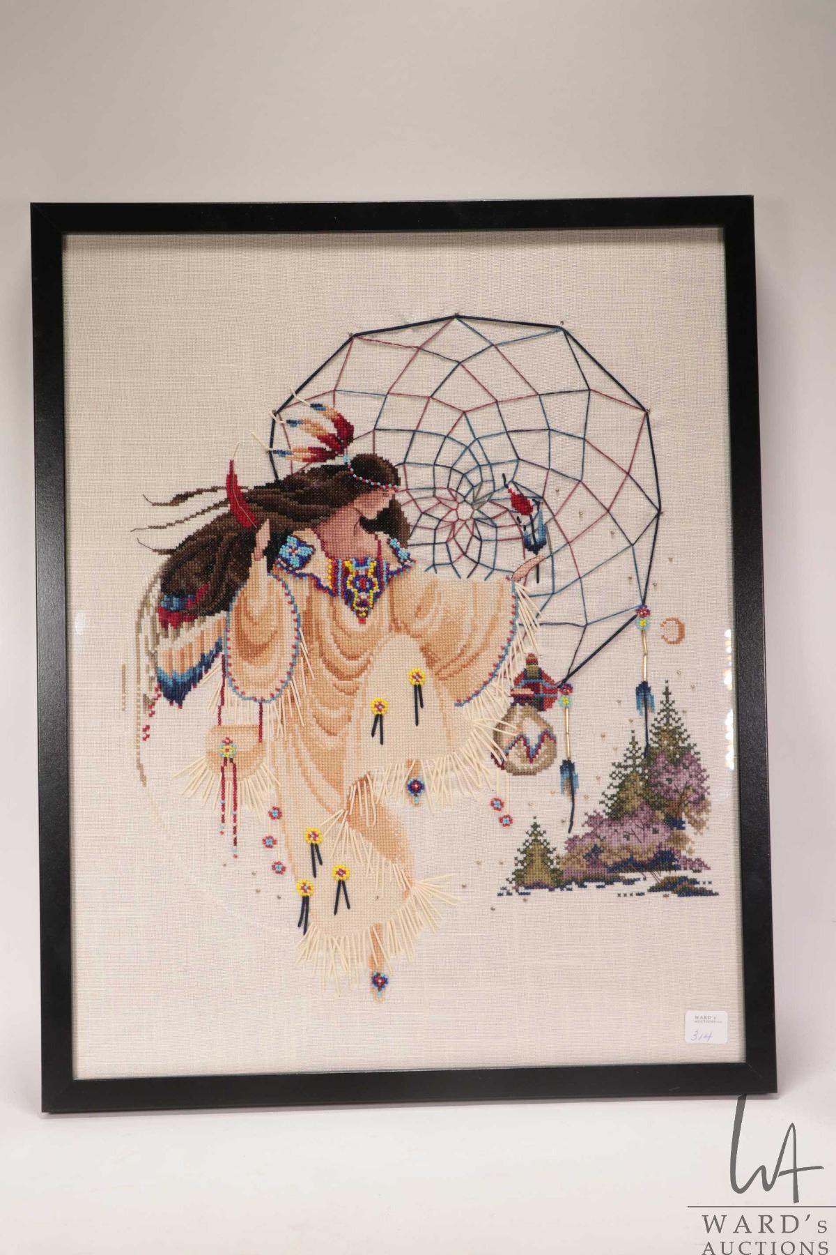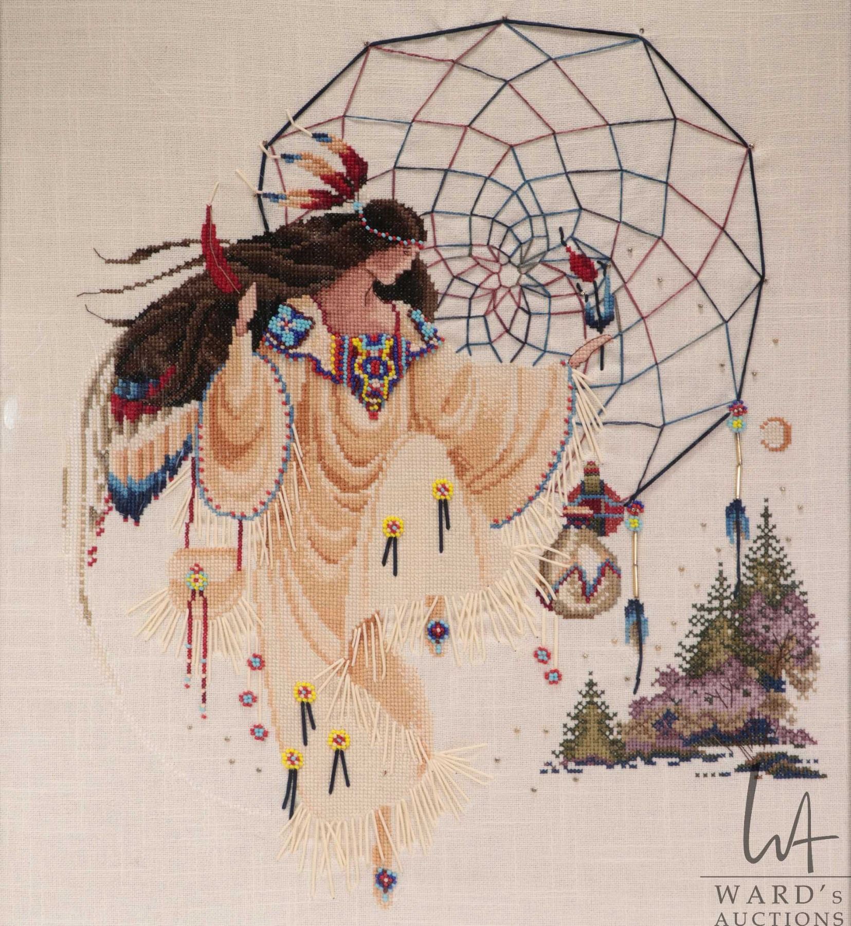 Lot 314 Framed needle and beadwork picture of a Indigenous woman and dream catcher, overall dimensions inclu