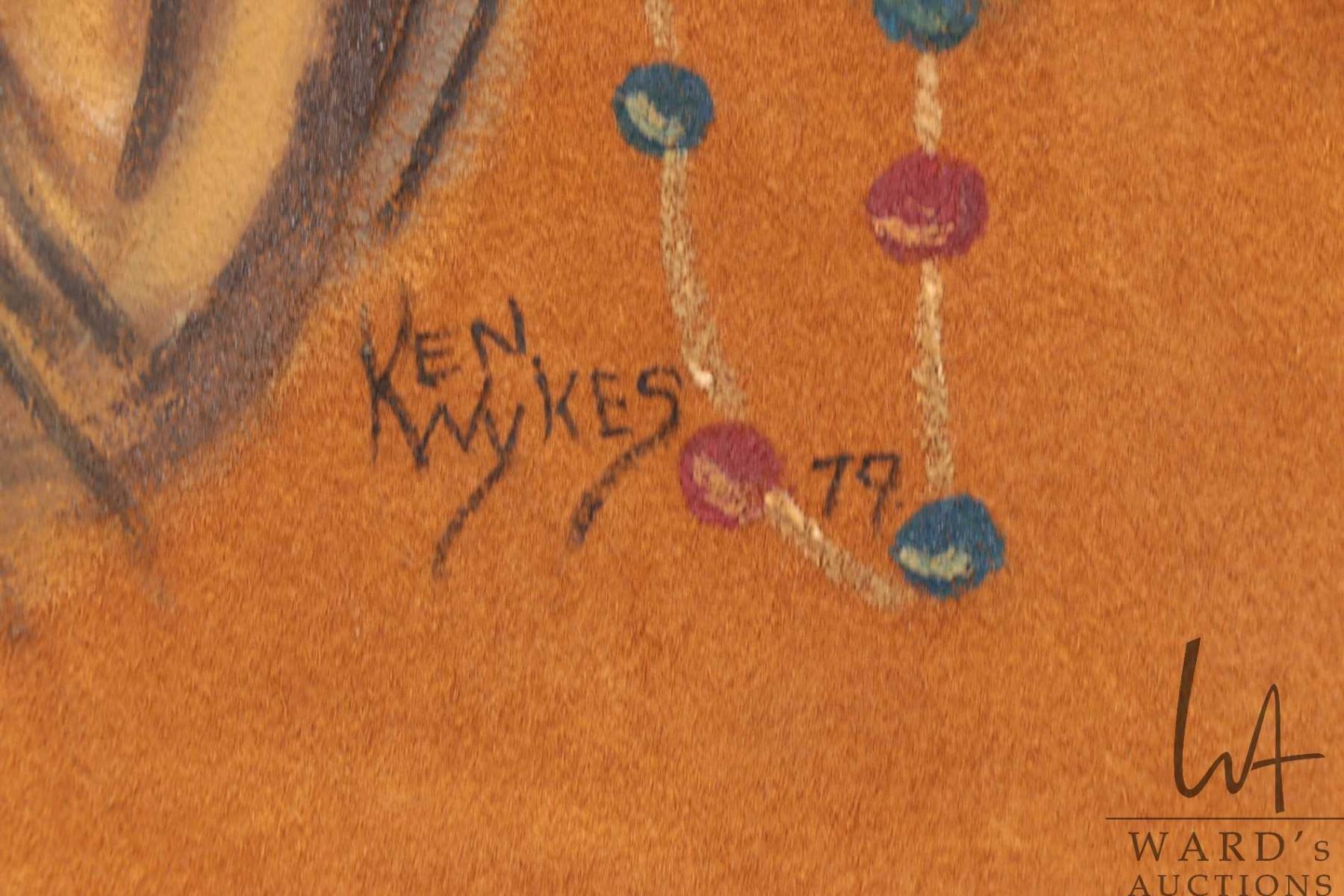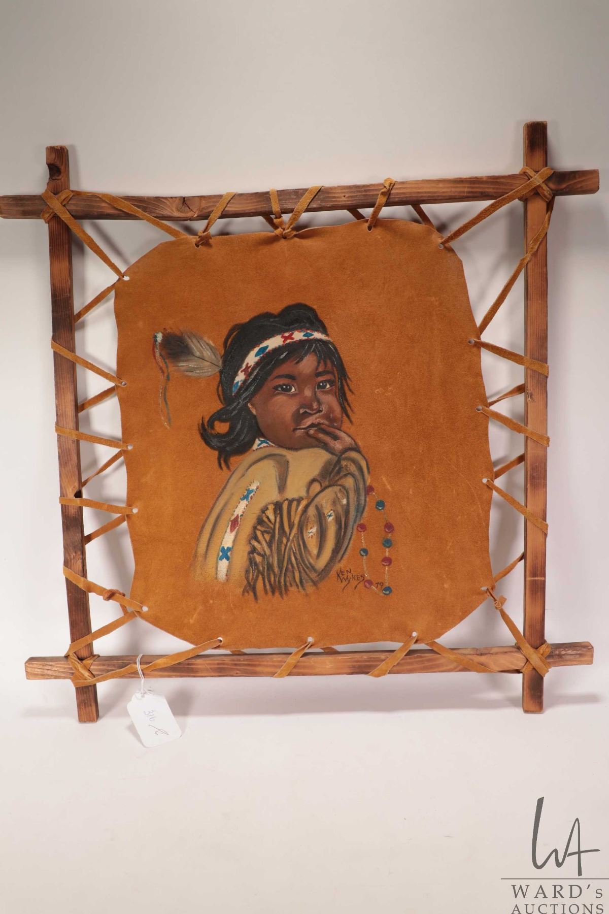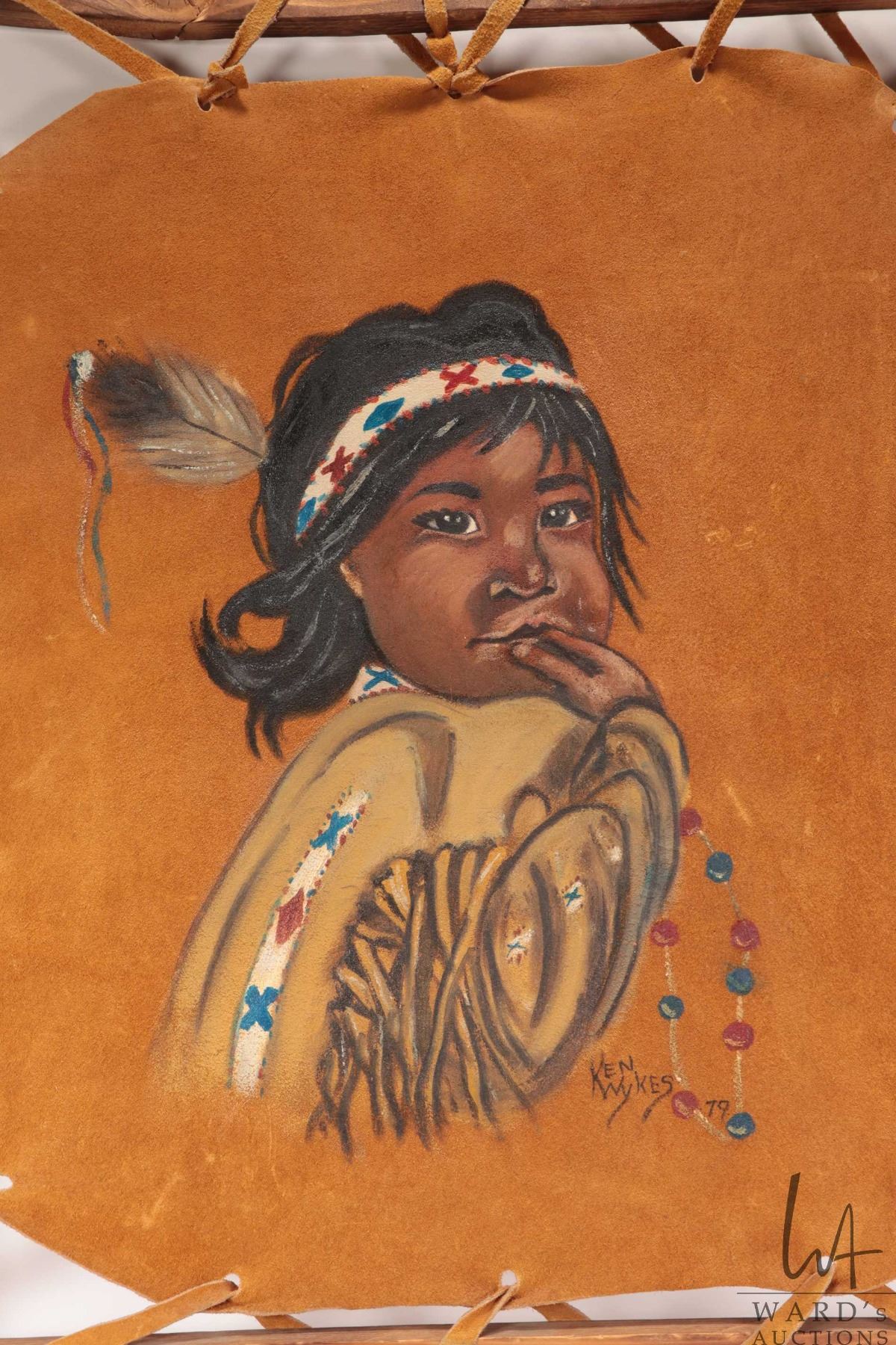 Lot 316 Ken Wykes, stretcher framed acrylic on buck skin painting of an Indigenous child, dated '79, overall