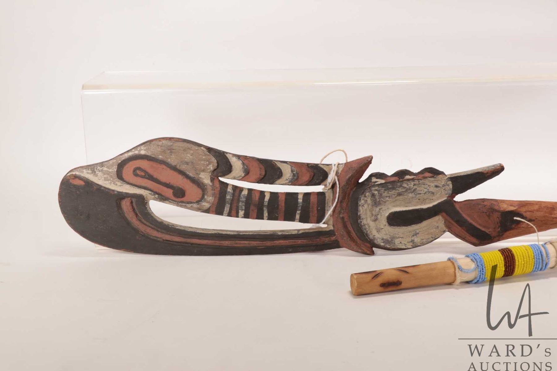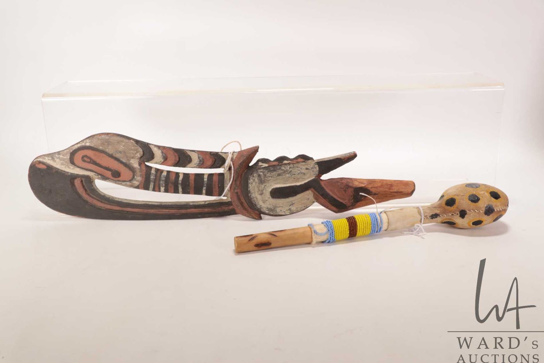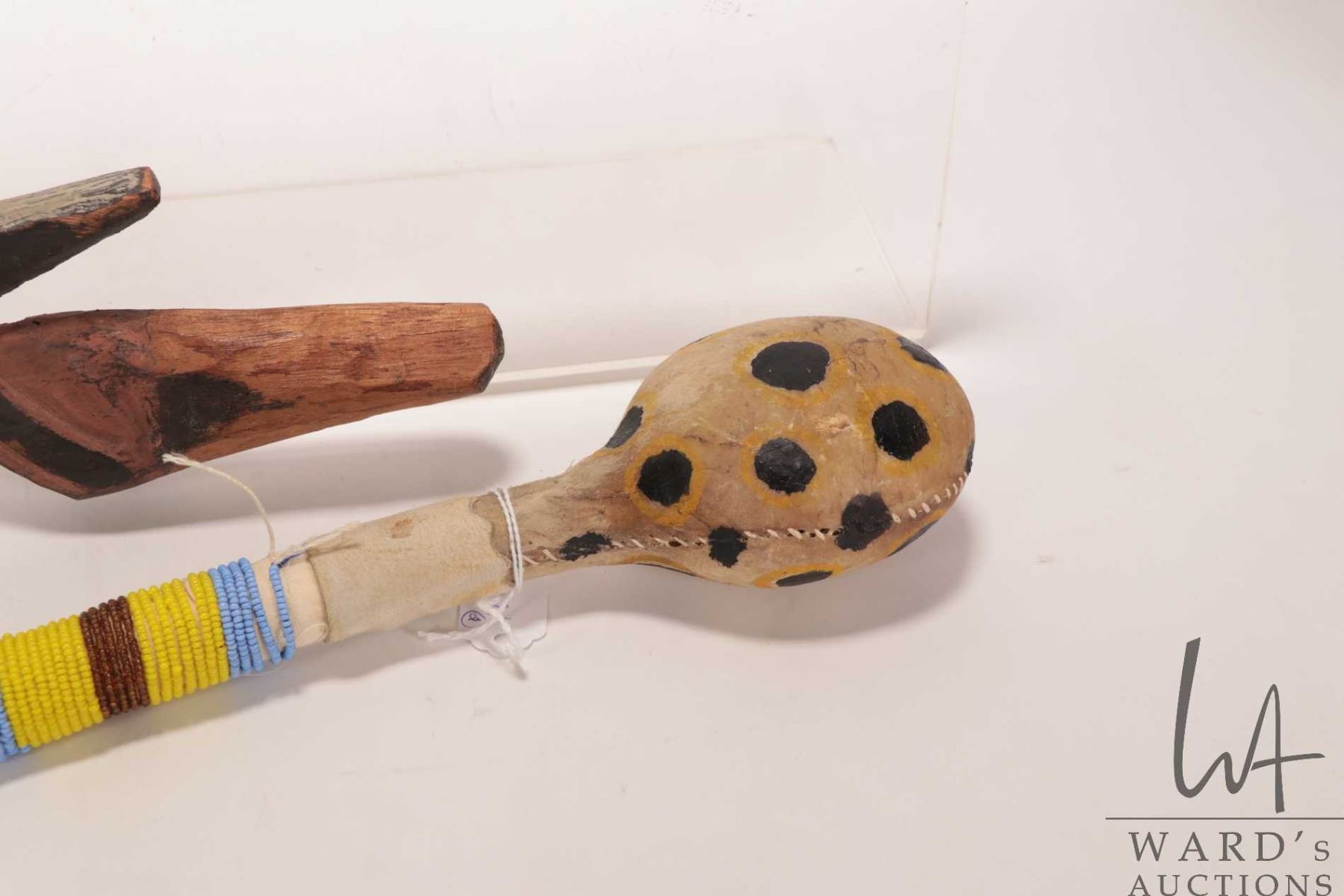 Lot 321 Hand painted east African cedar flute stopper and a rattle