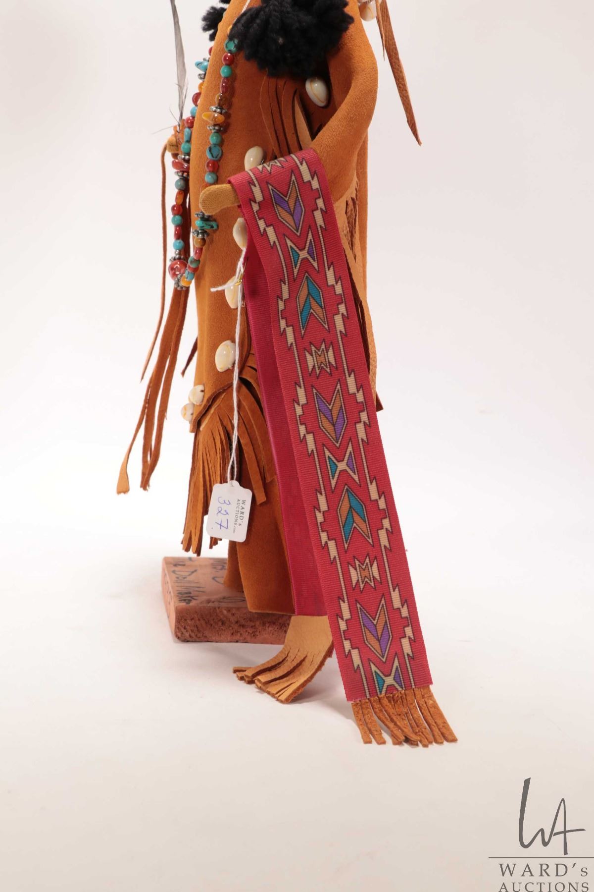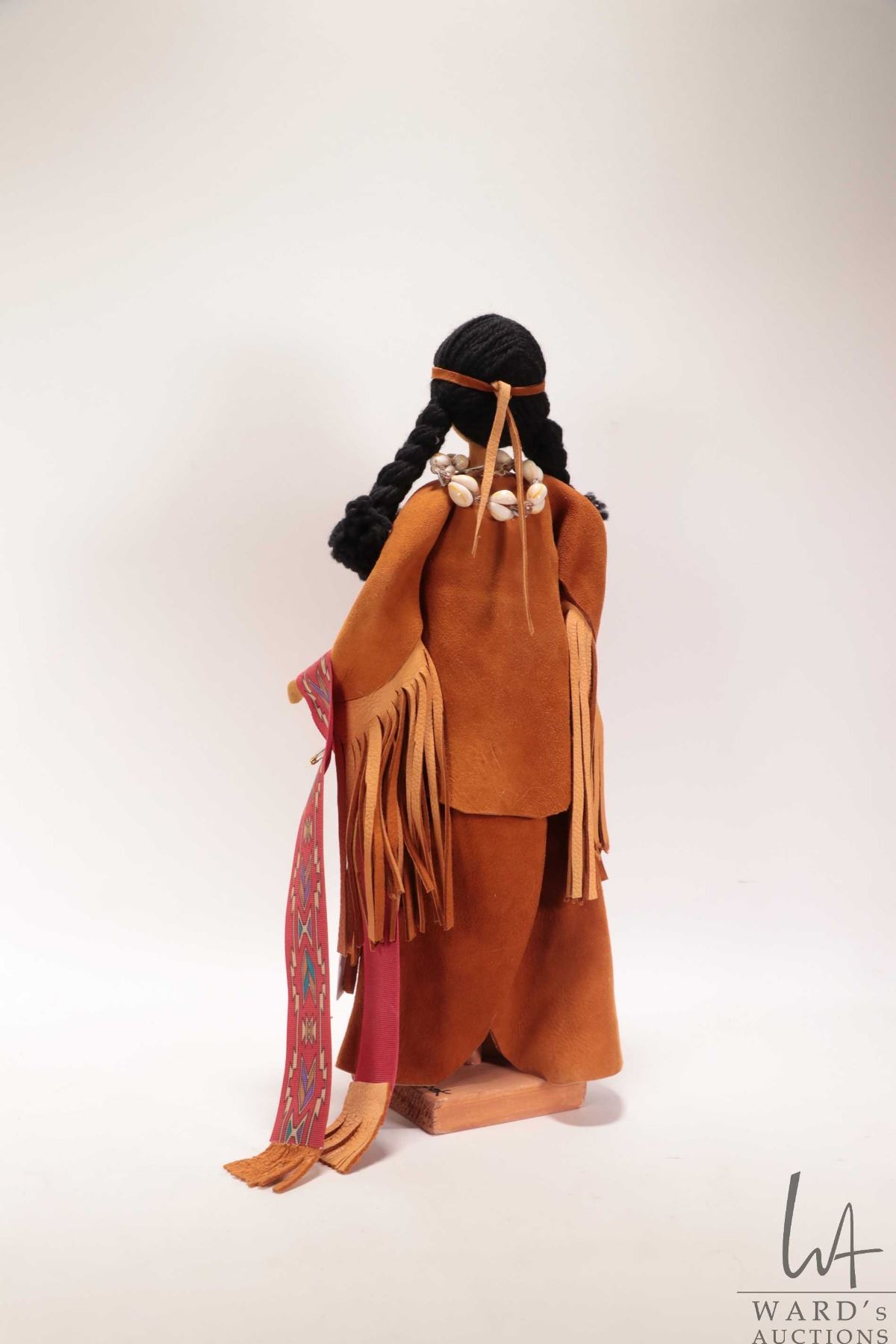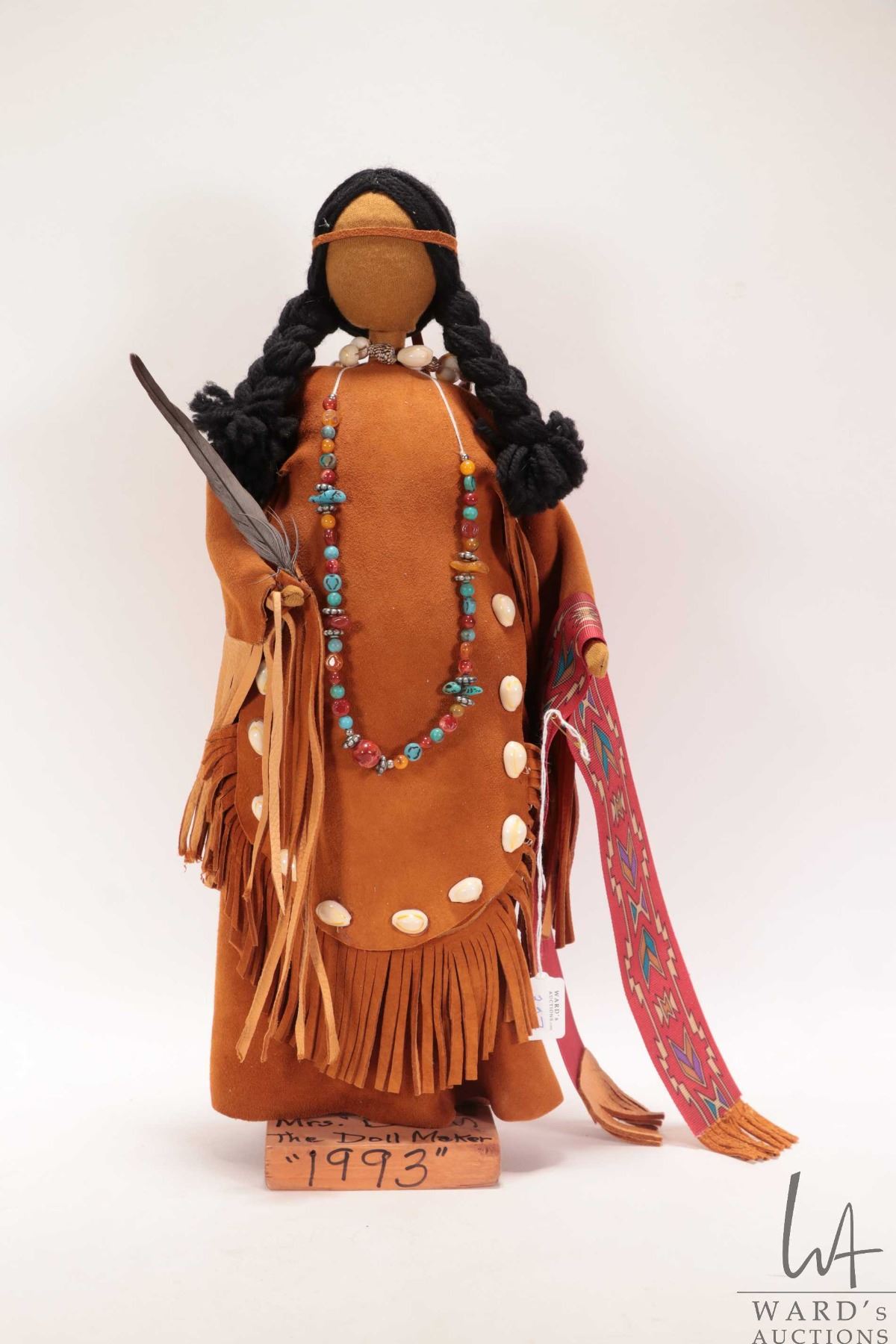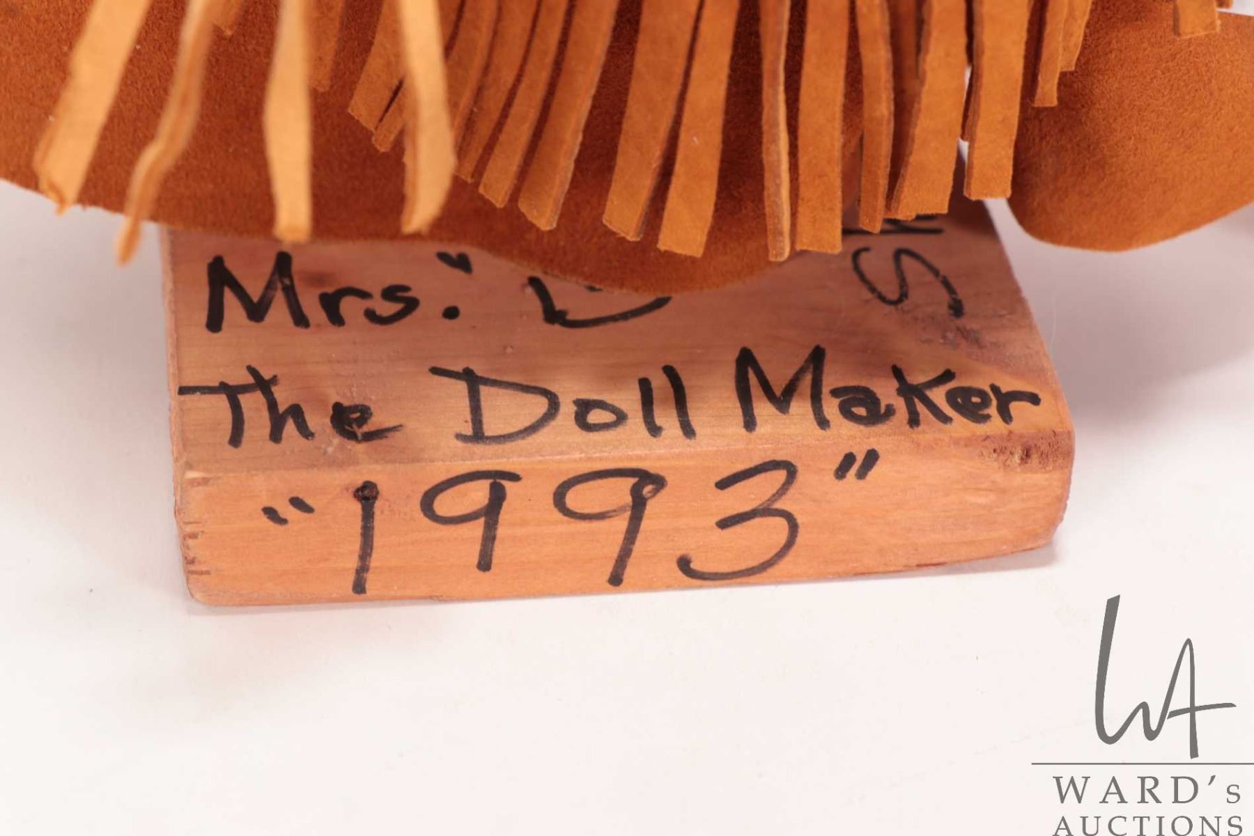 Lot 327 Mrs. B The Dollmarker, hand made doll in buck skin clothing on wooden plinth, dated 1993, 16" in hei