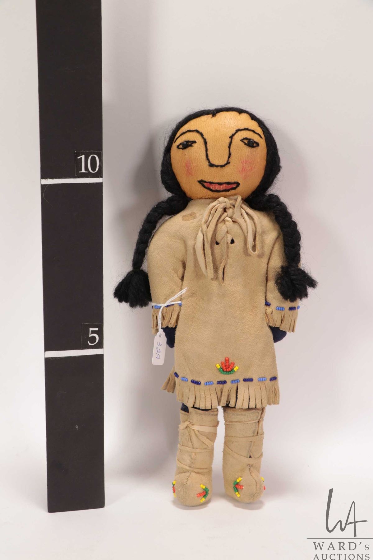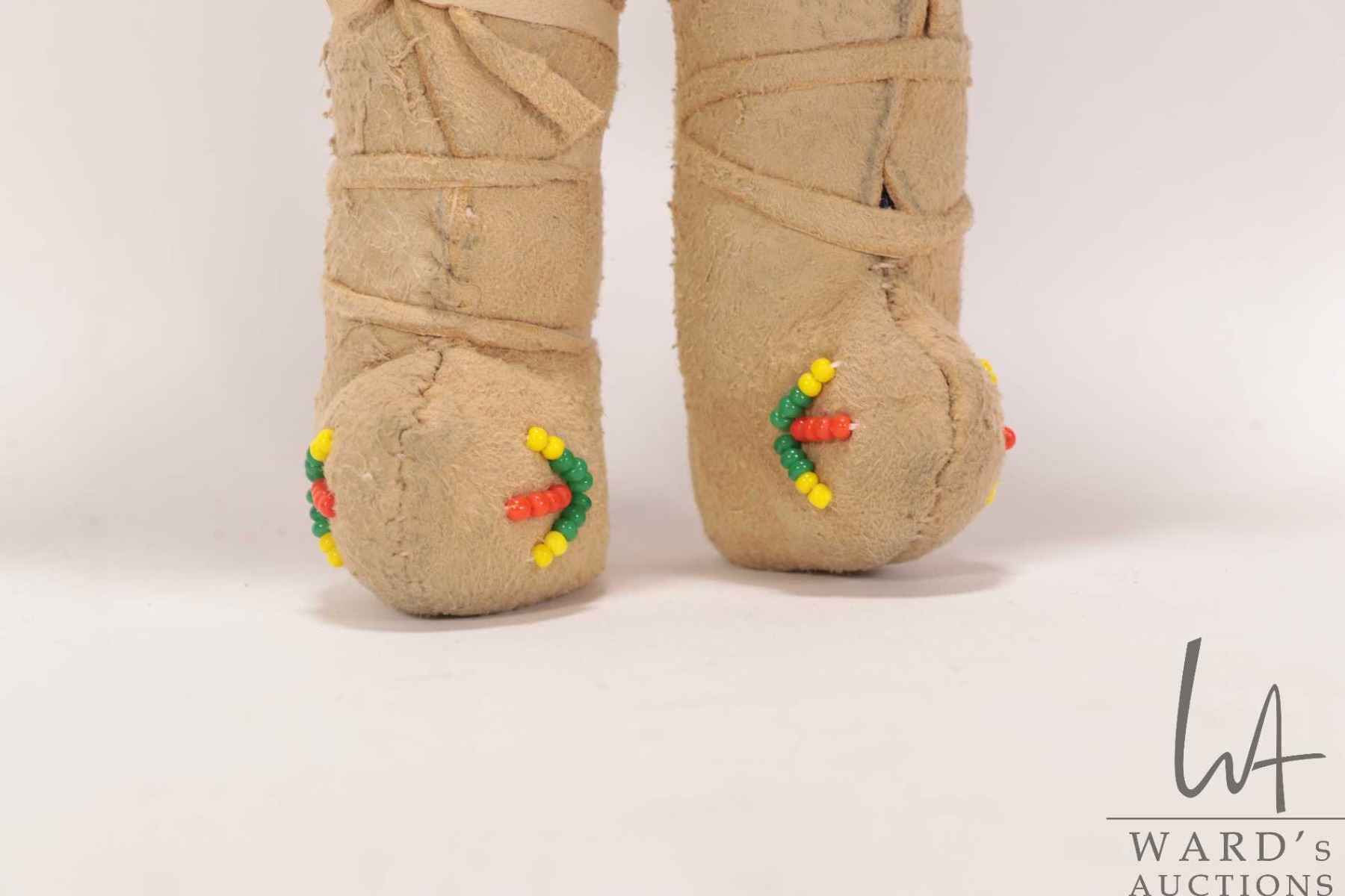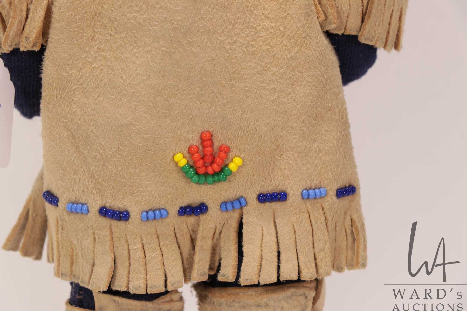 Lot 329 Hand made Indigenous buck skin doll with beaded dress and mukluks, 12" in height
