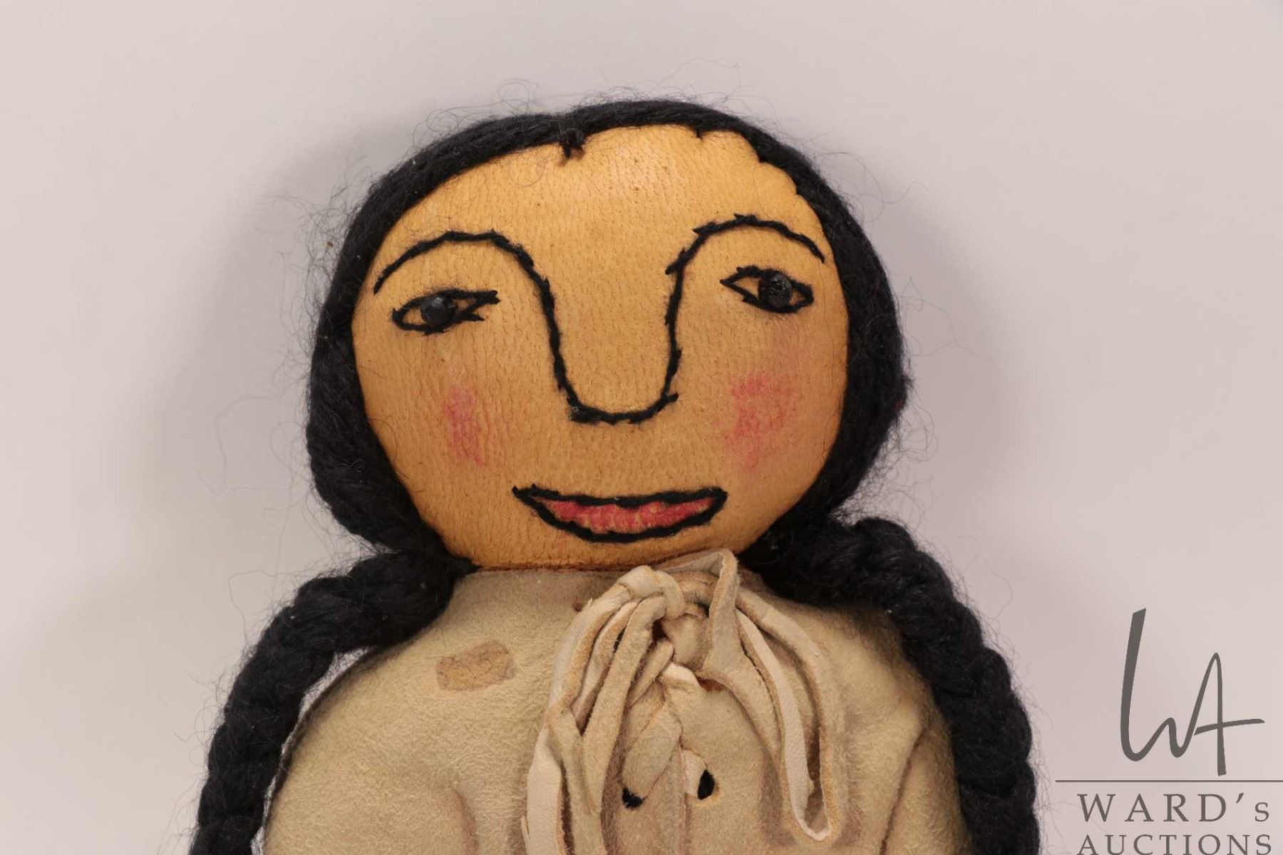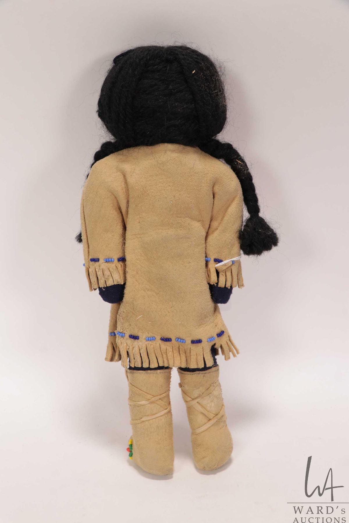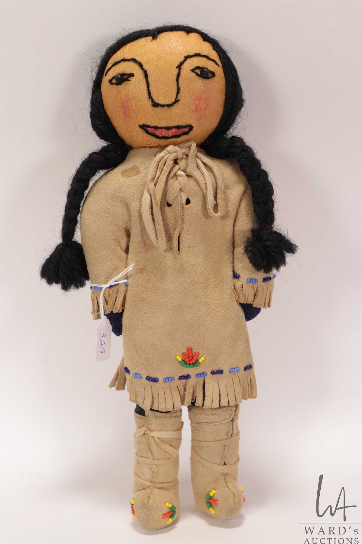 Lot 329 Hand made Indigenous buck skin doll with beaded dress and mukluks, 12" in height