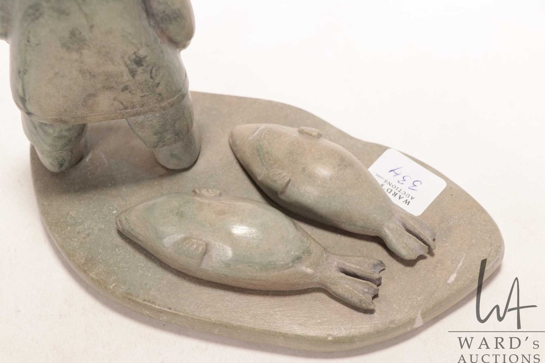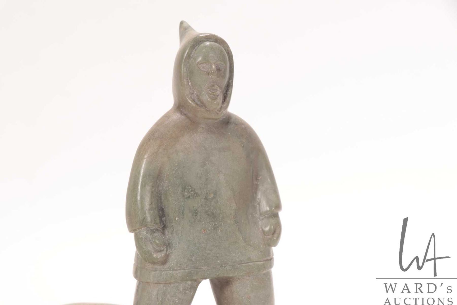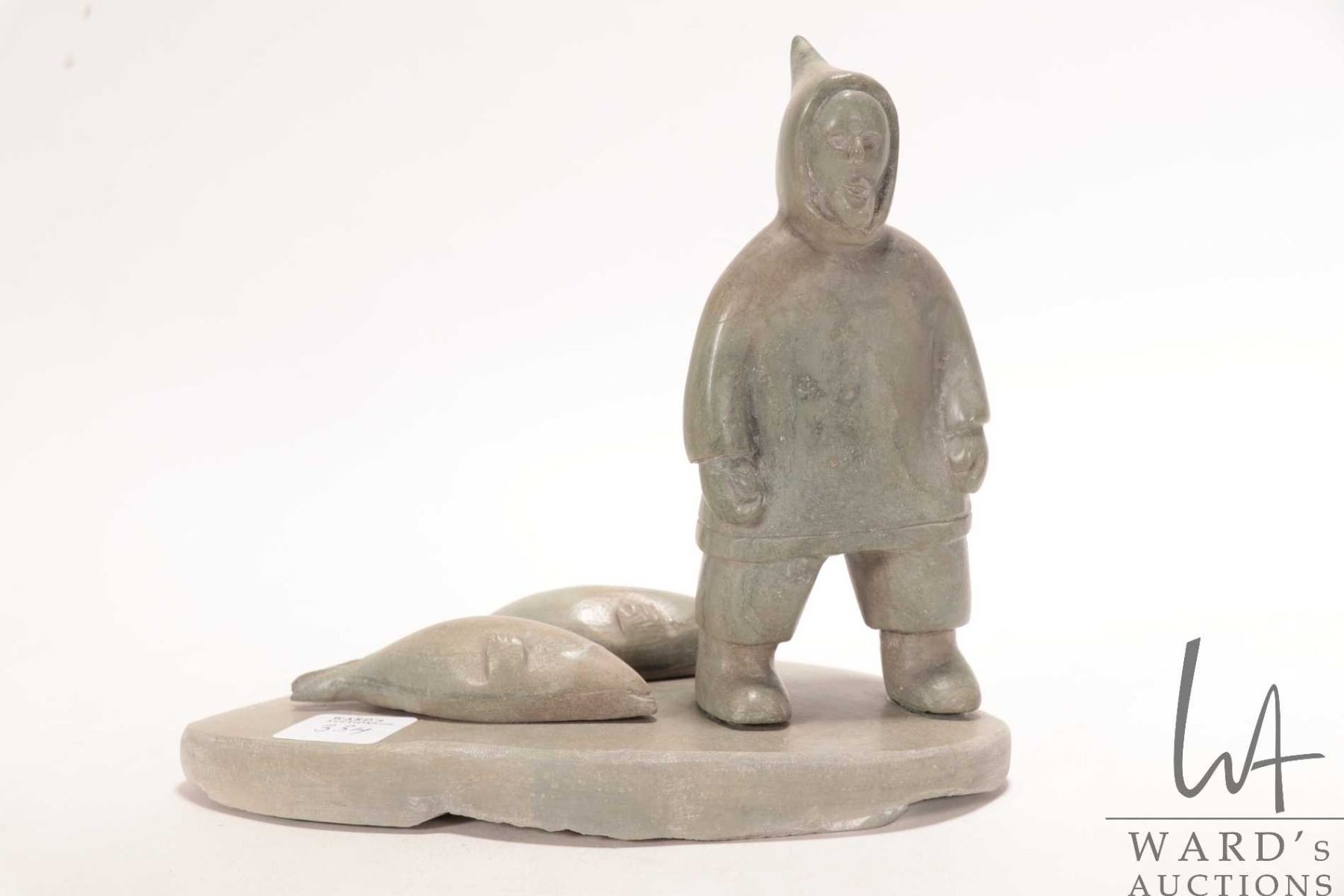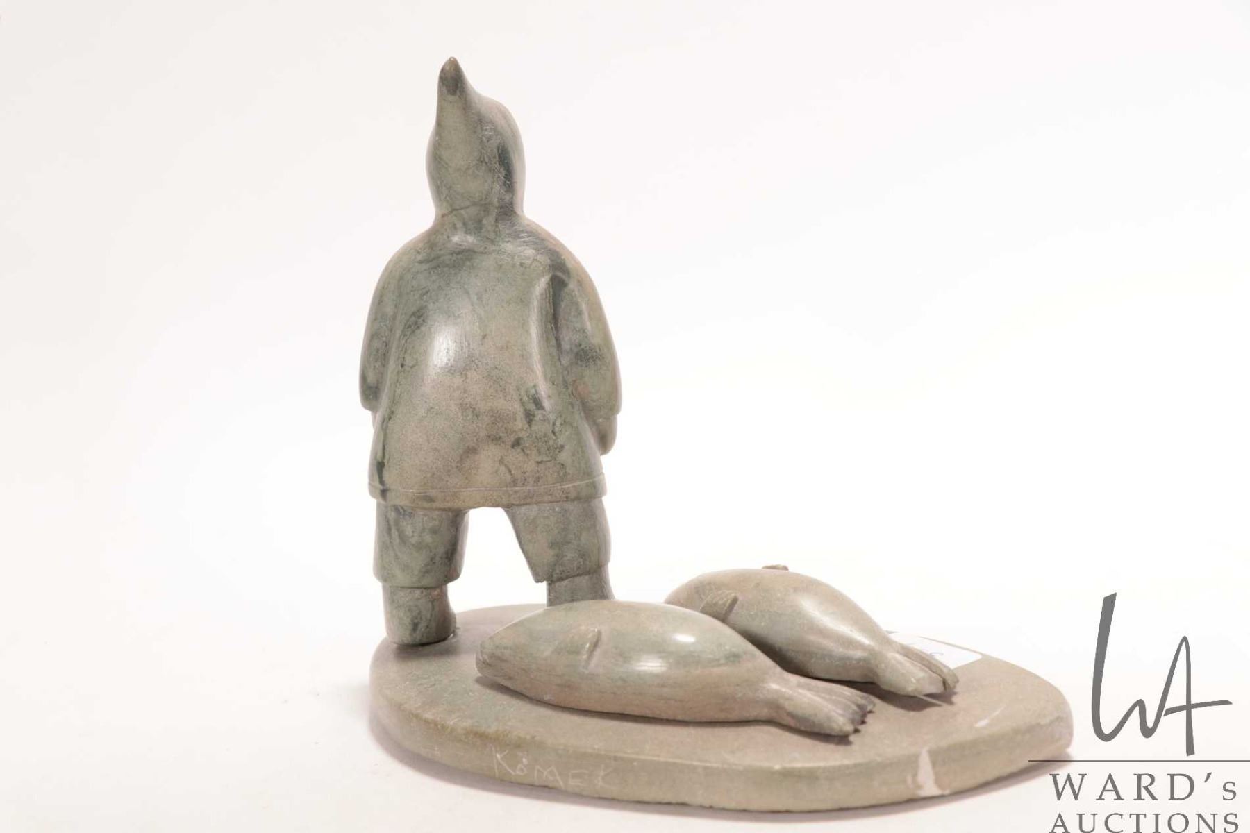 Lot 334 Komek ( Annie Komek Kigiuna?) signed hand carved soapstone hunter with two seals, 6 1/2" in height