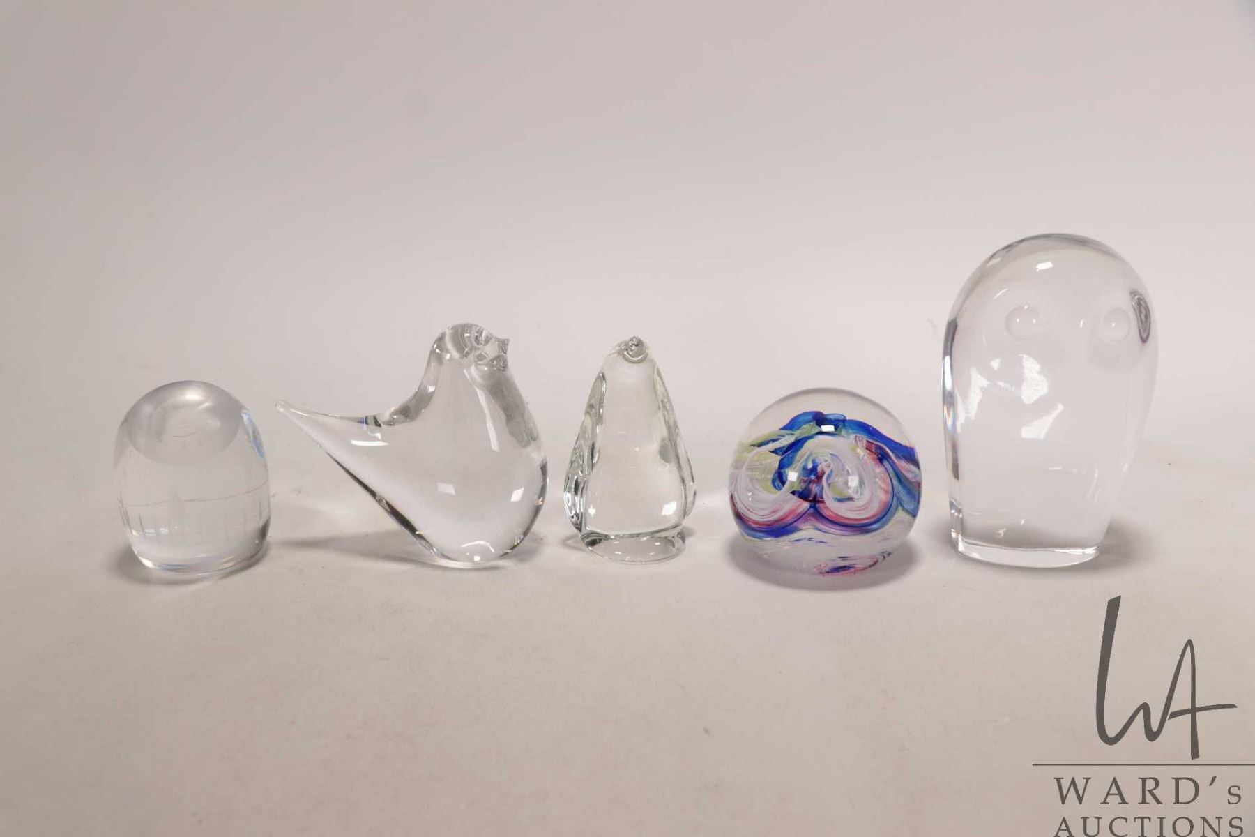 Five vintage decorative glass paperweights including Selkirkglass with colourful swirls, Goebel owl etc.