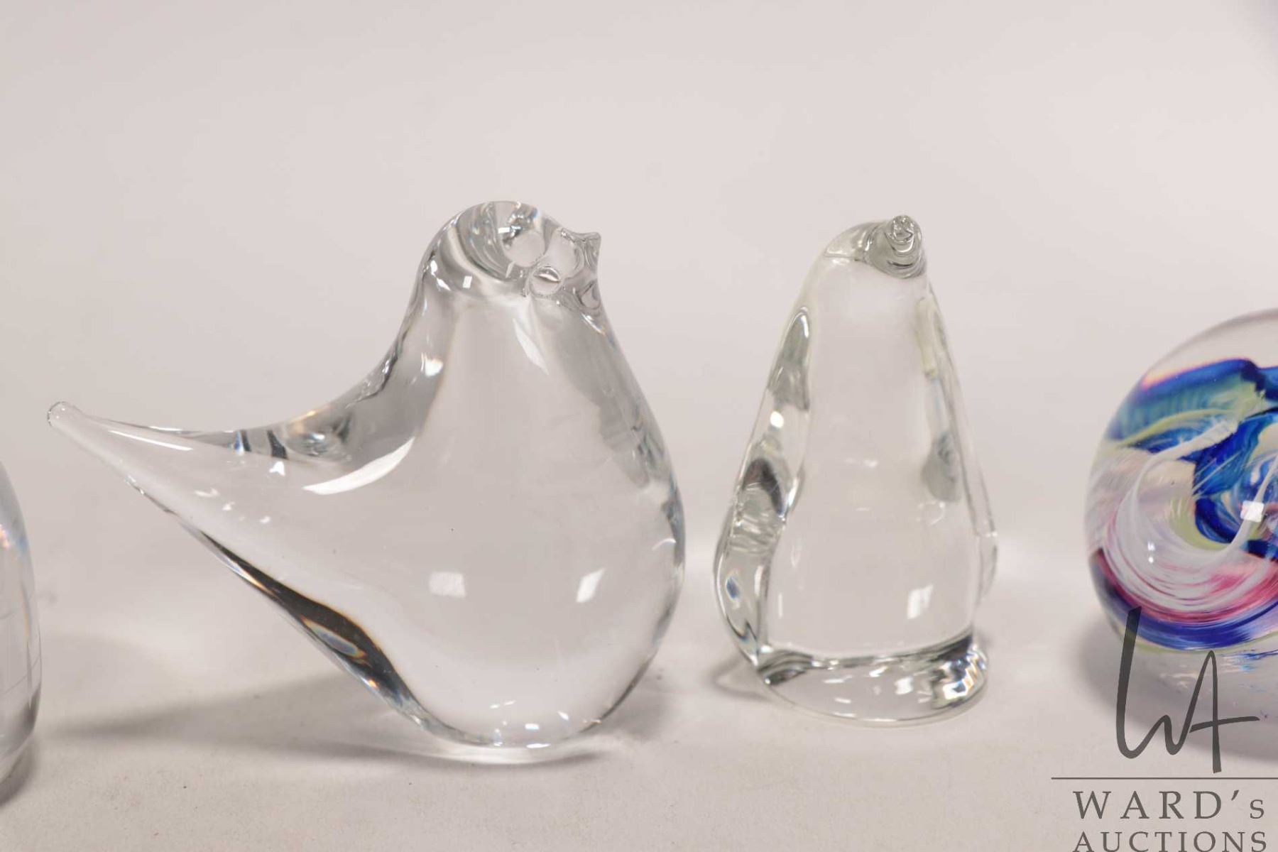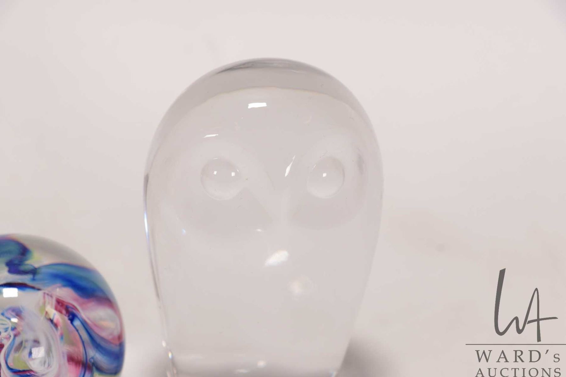 Lot 338 Five vintage decorative glass paperweights including Selkirkglass with colourful swirls, Goebel owl