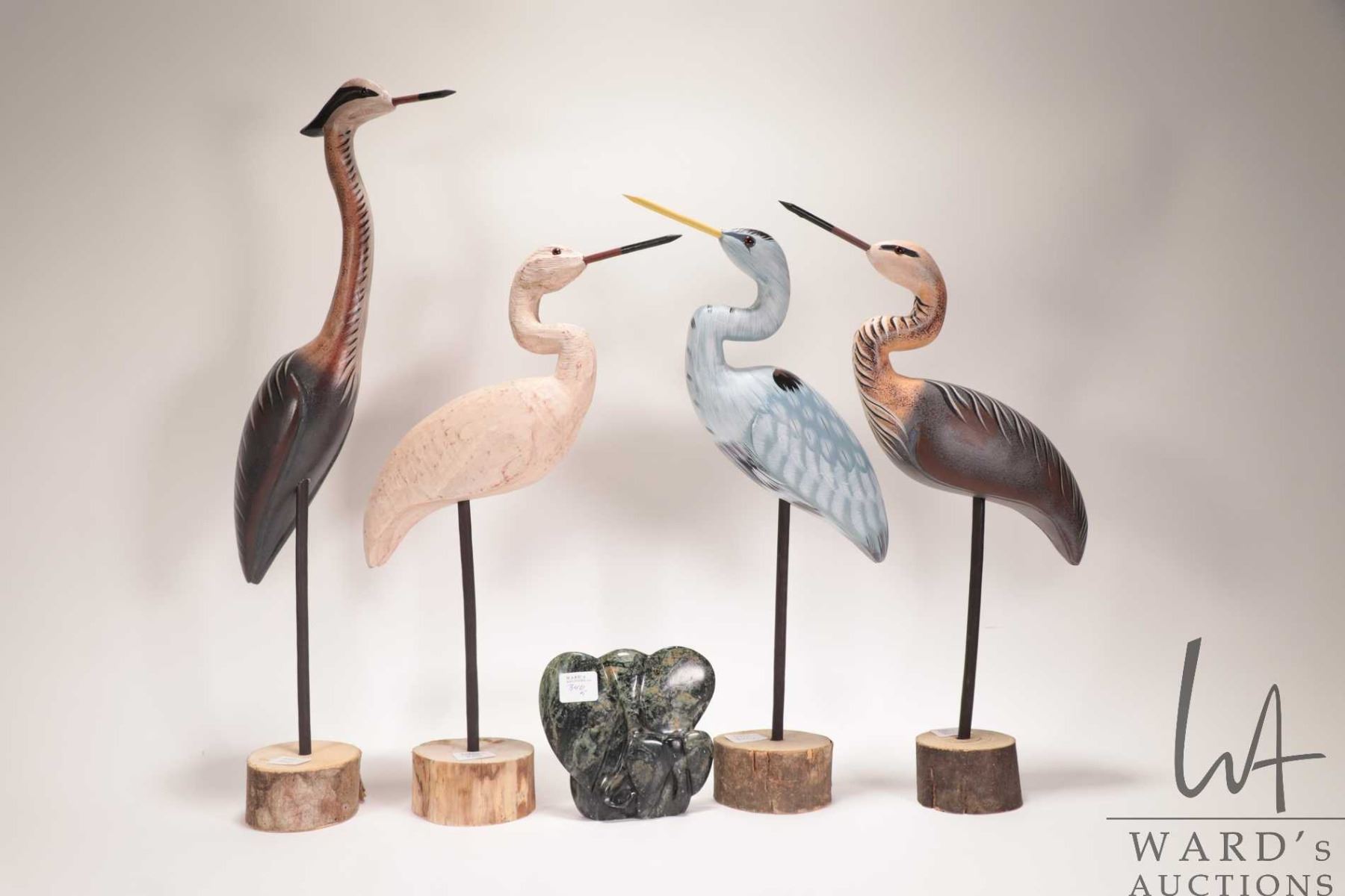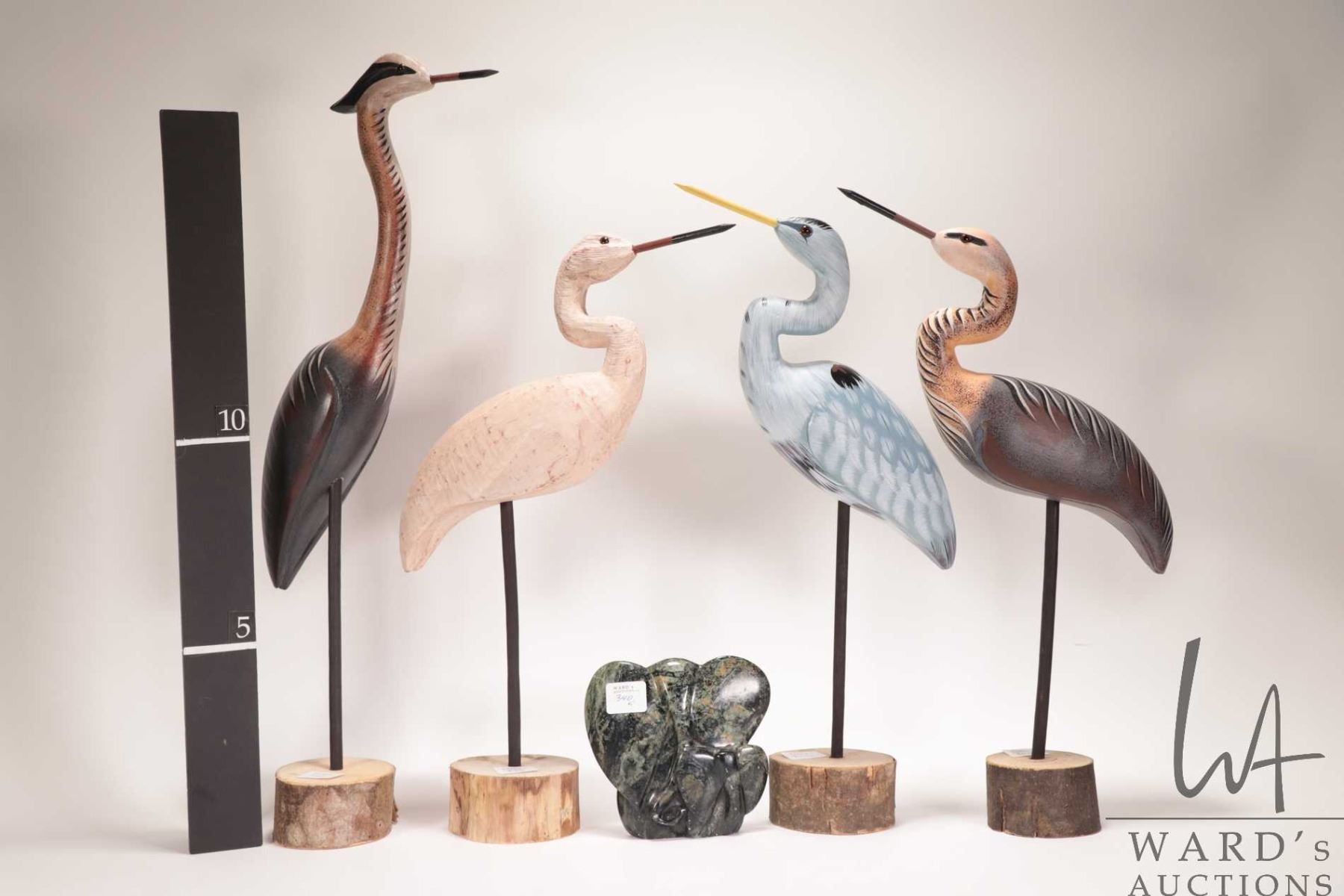 Lot 340 Four wooden carved cranes, ranging from 15"-21" in height plus a carved Zimbabwe stone elephant and