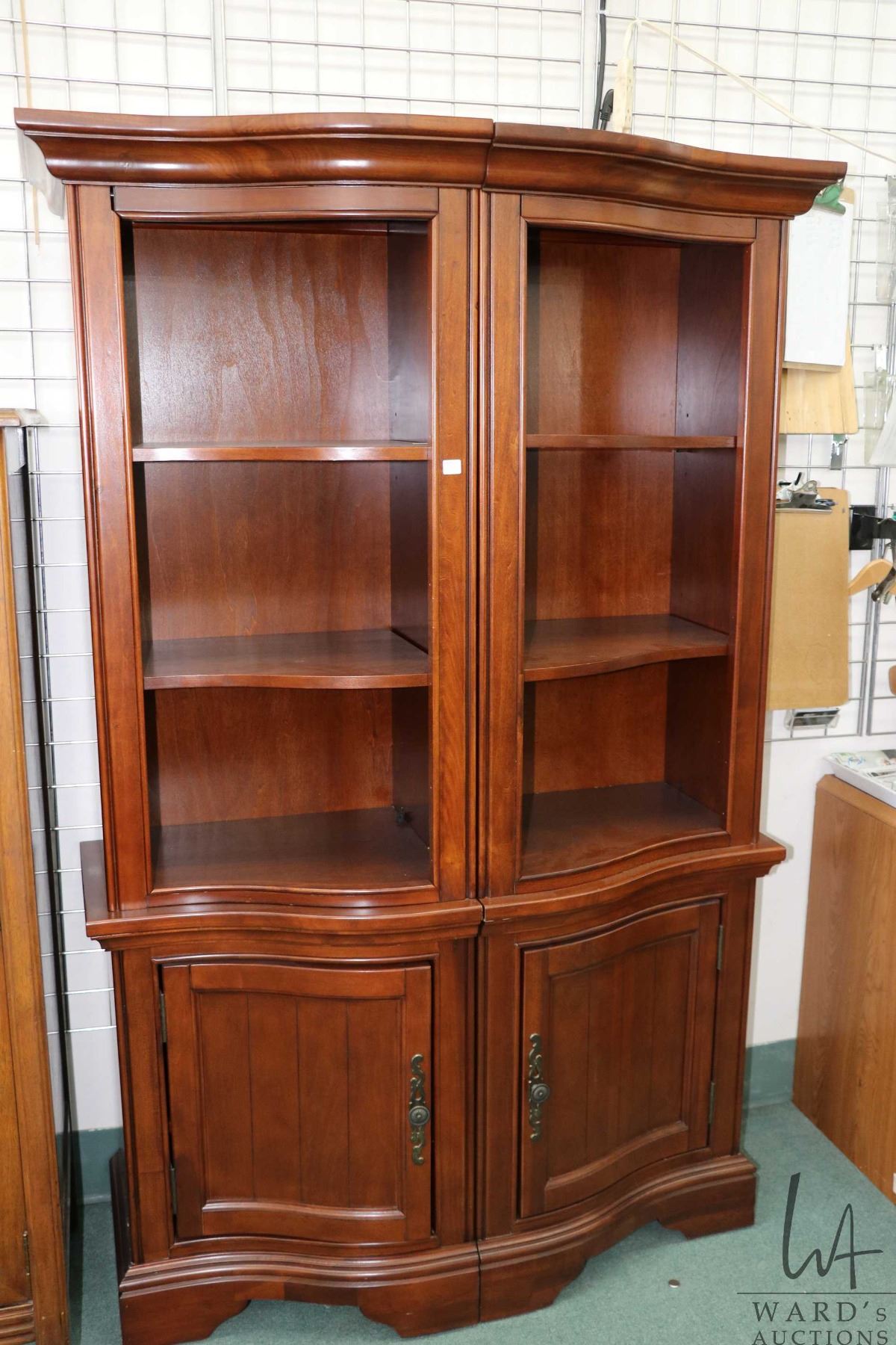Two piece curved front wall unit with lower drawers and upper display shelves, total measures of units 72" H X 45" W X 20" D