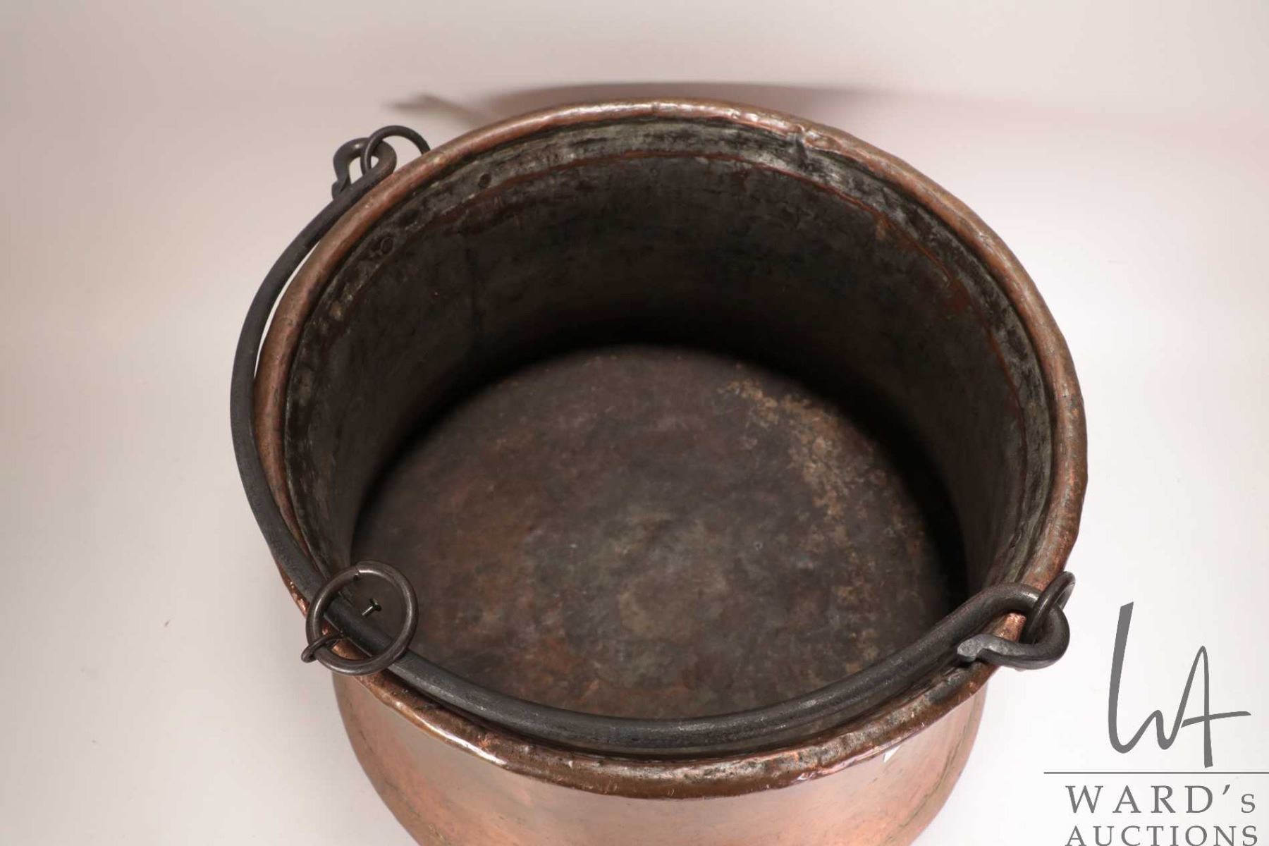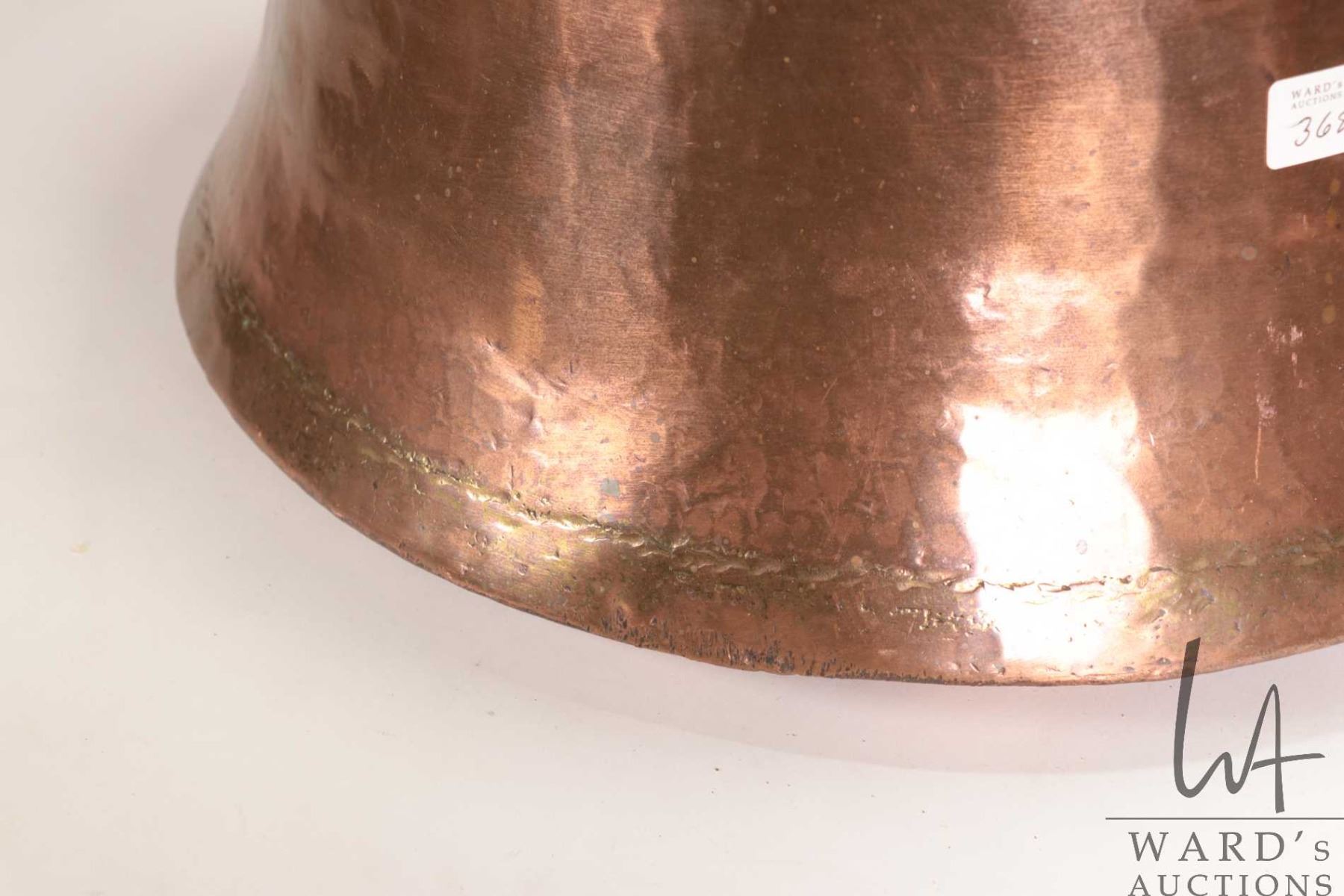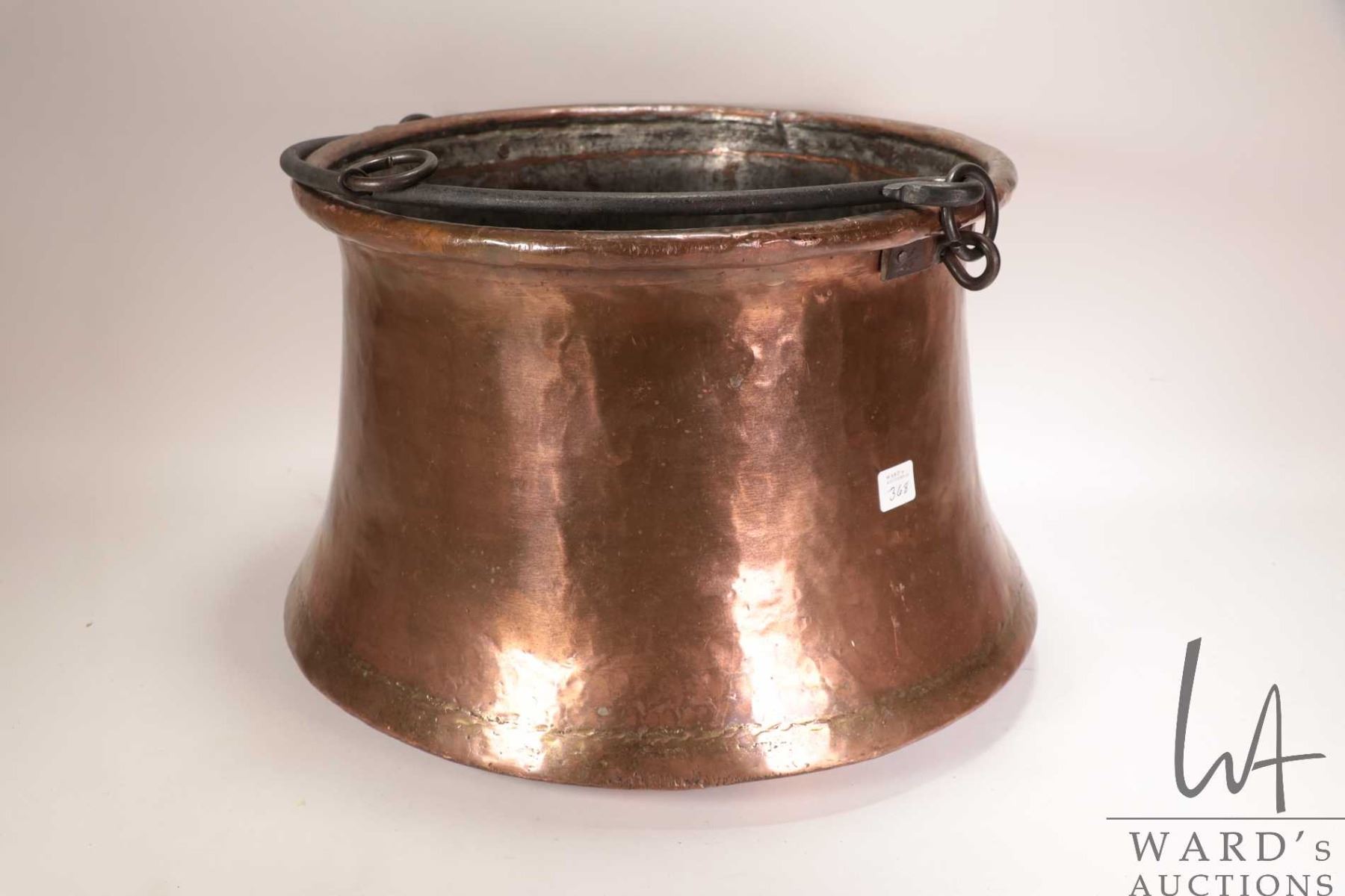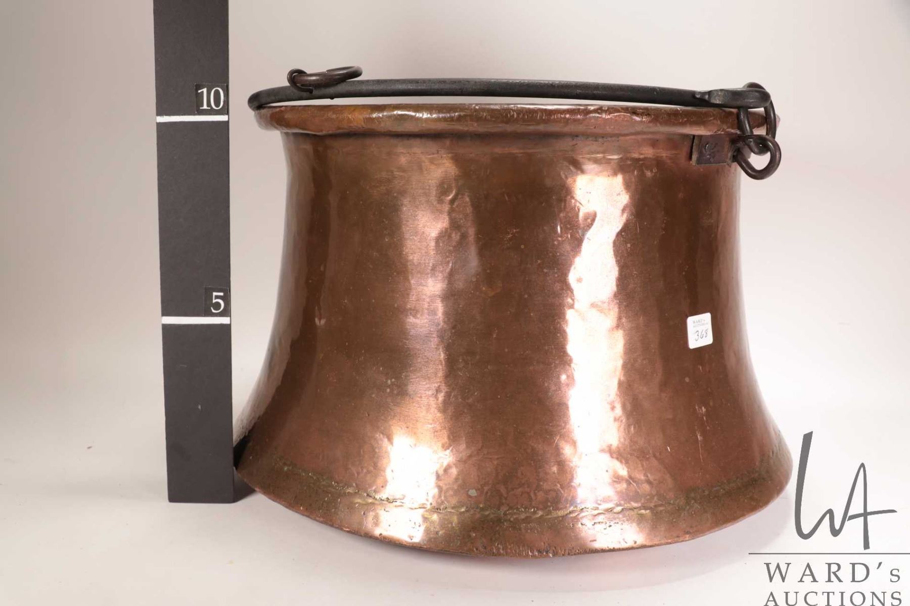 Lot 368 Large hand hammered copper kettle with wrought iron handles, 14 1/2" in diameter and 10 1/2" in heig