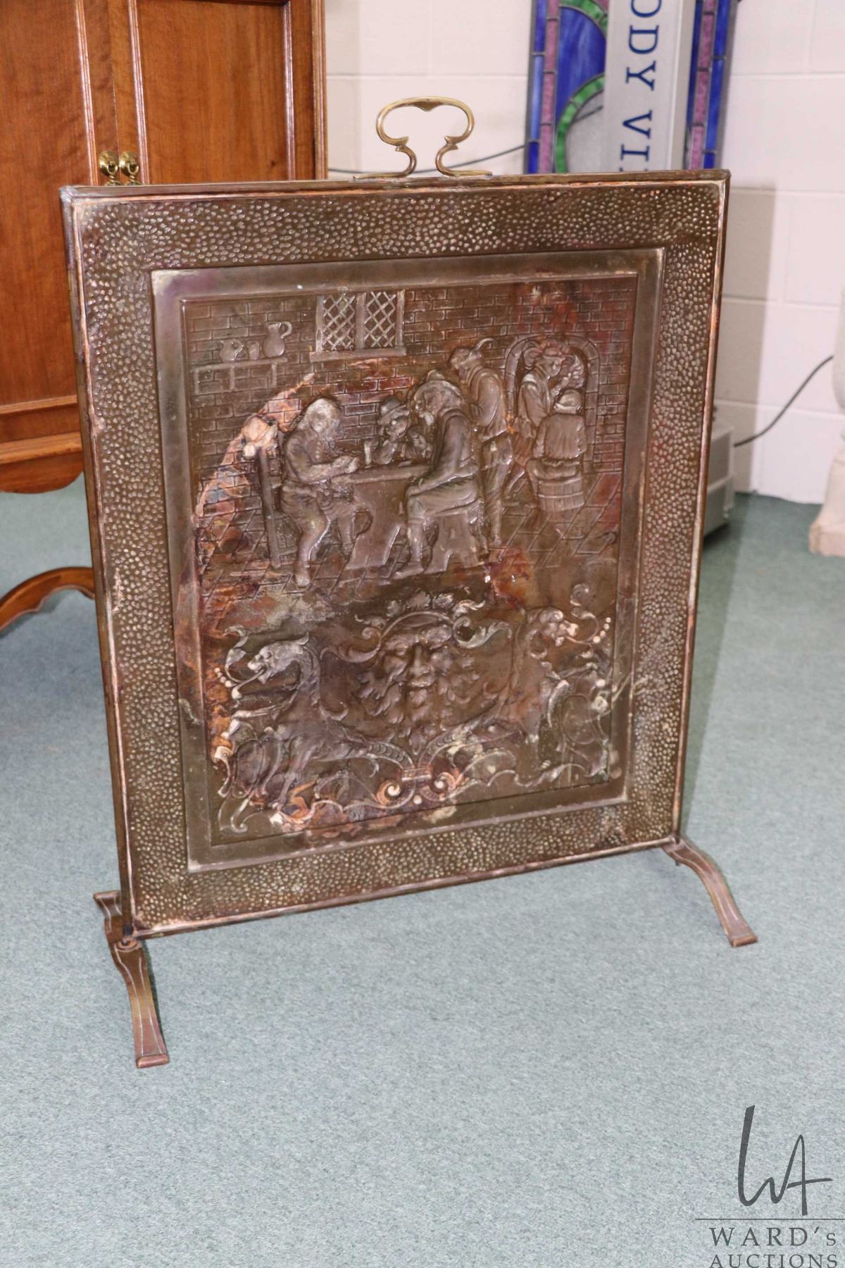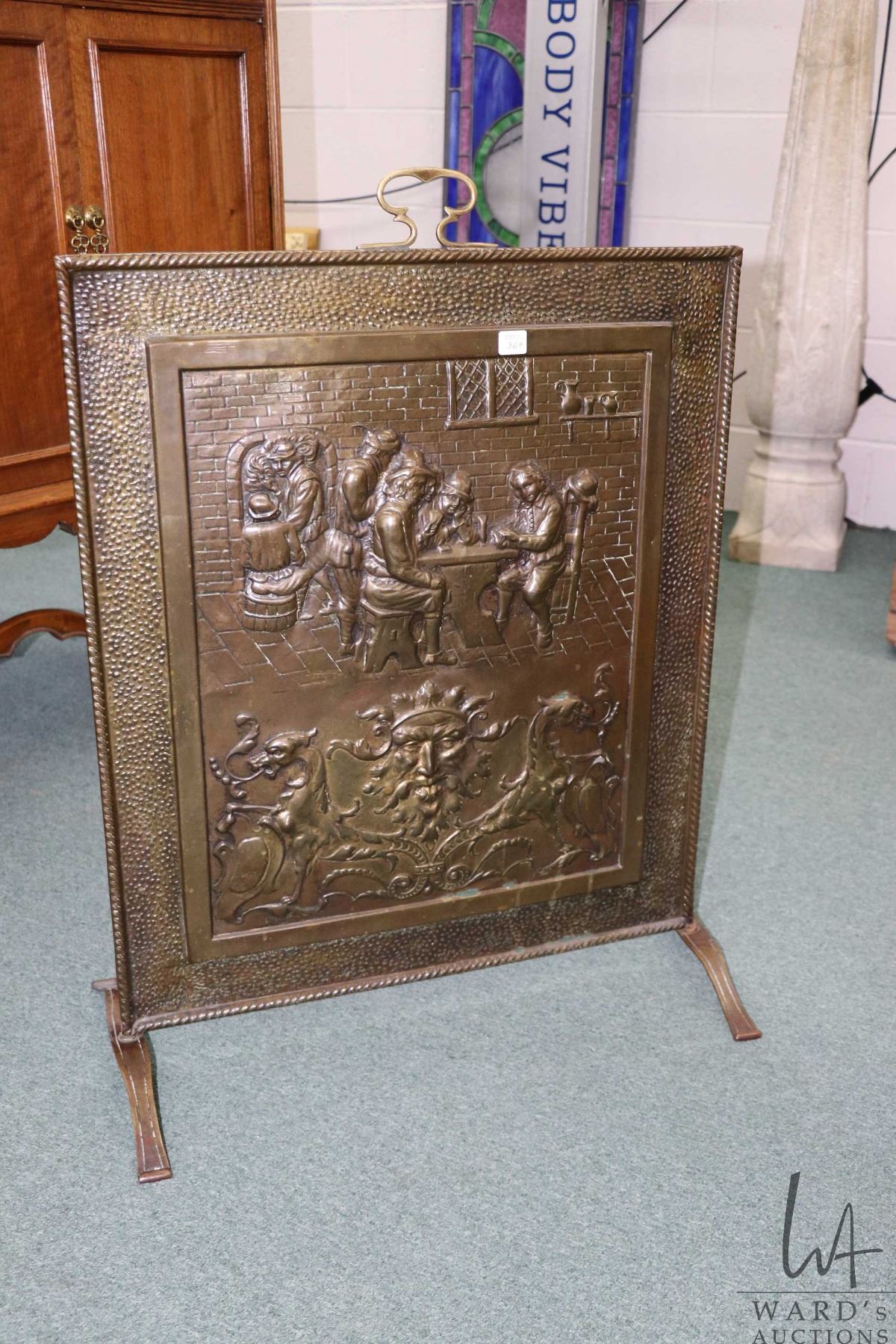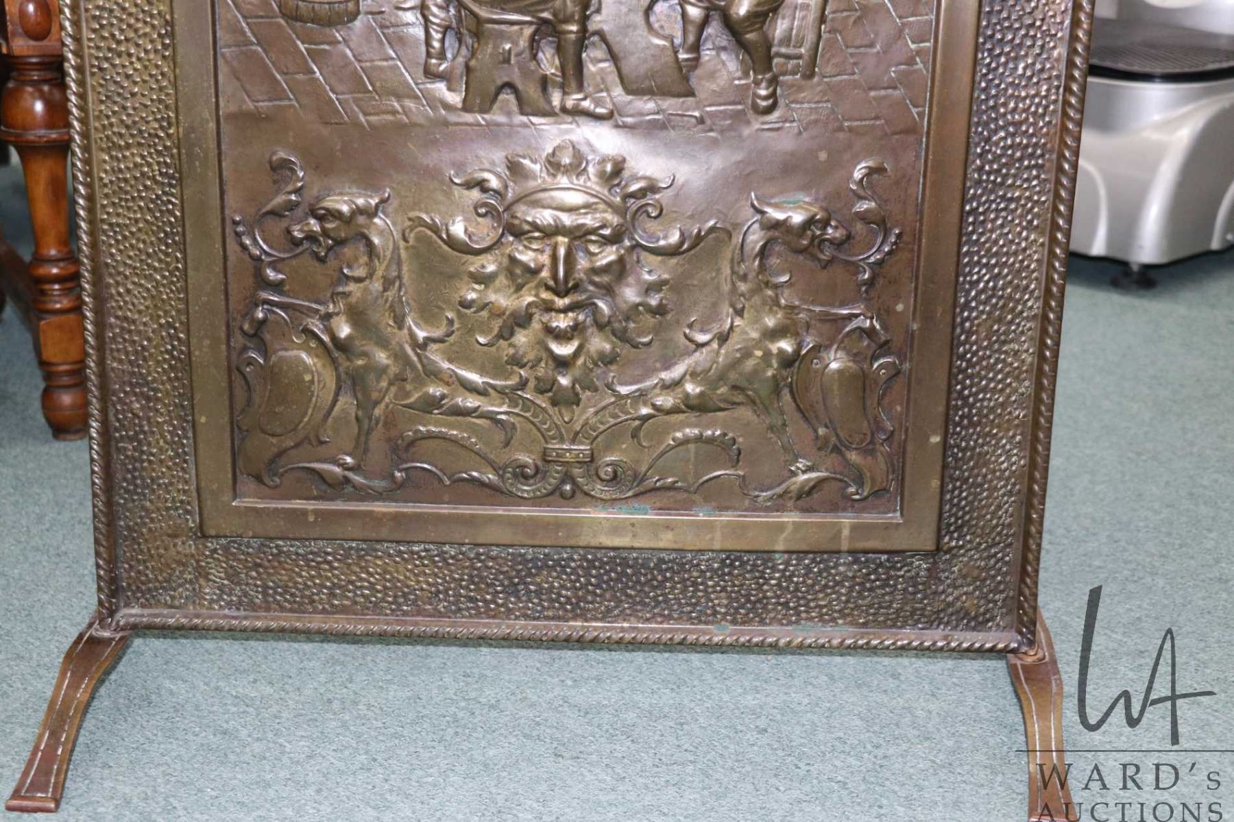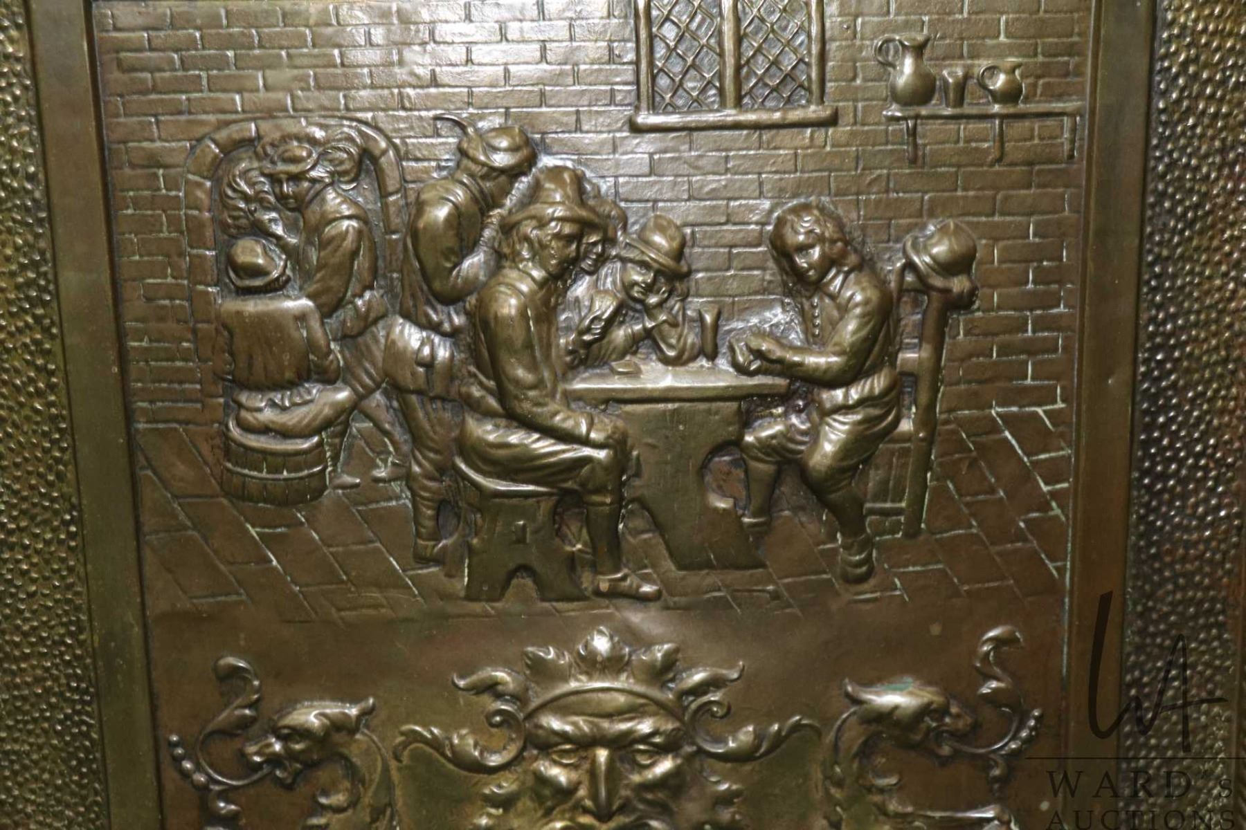 Lot 369 Vintage/ antique bas relief firescreen with tavern scene and Green Man and Griffons, 27" X 23" panel