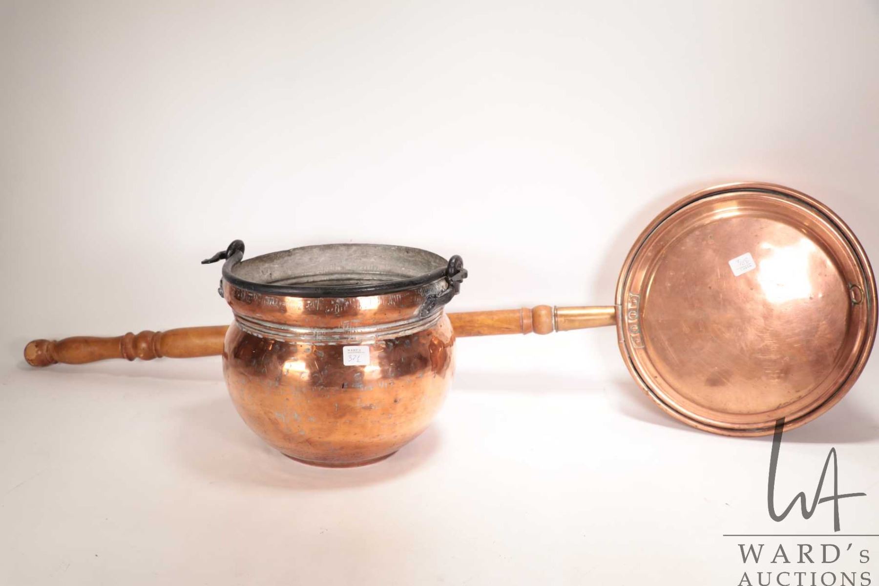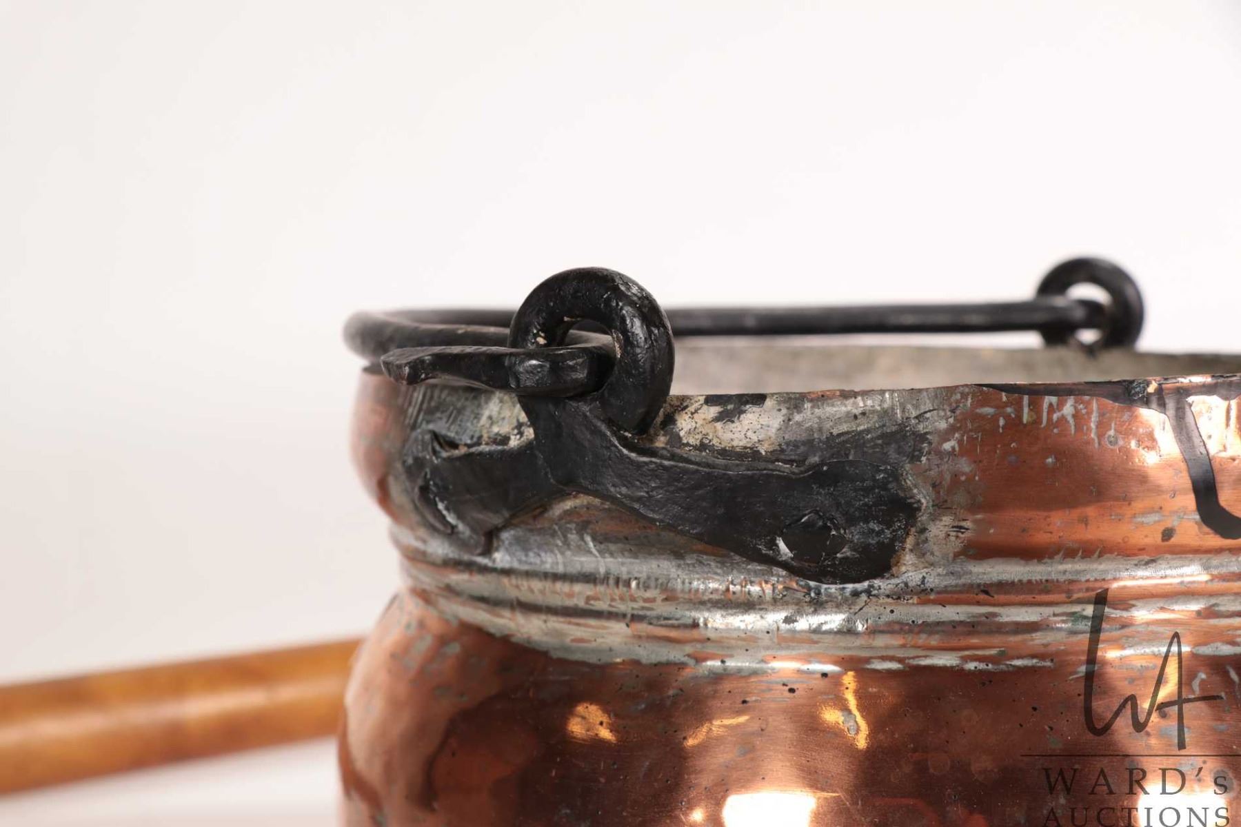 Vintage copper bed warmer with 30" wooden handle and a vintage copper pot, 9-1/2" wide, 8" tall