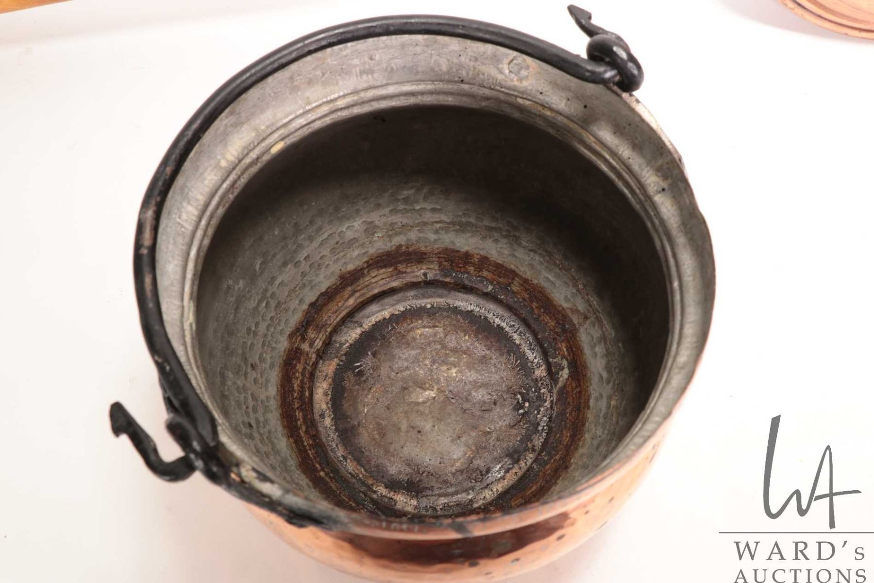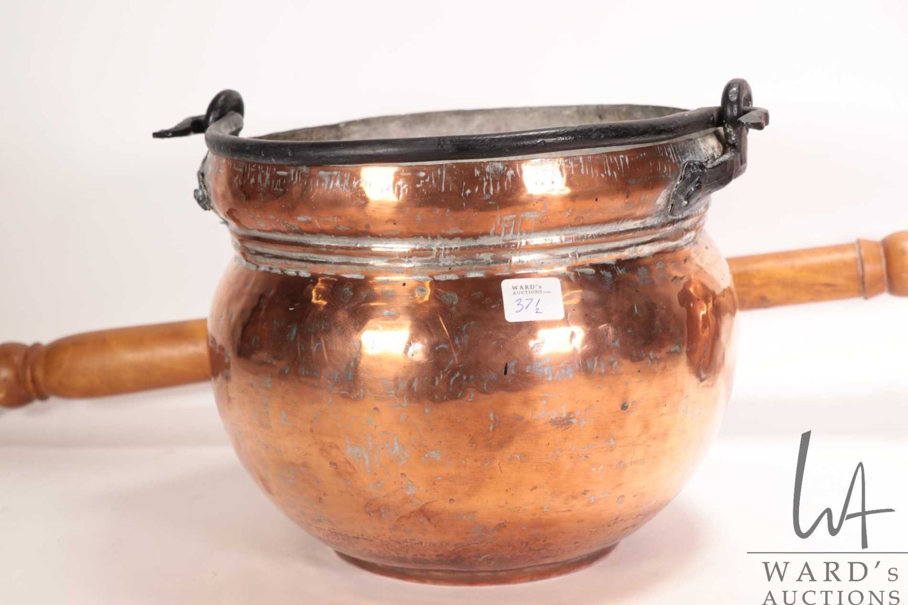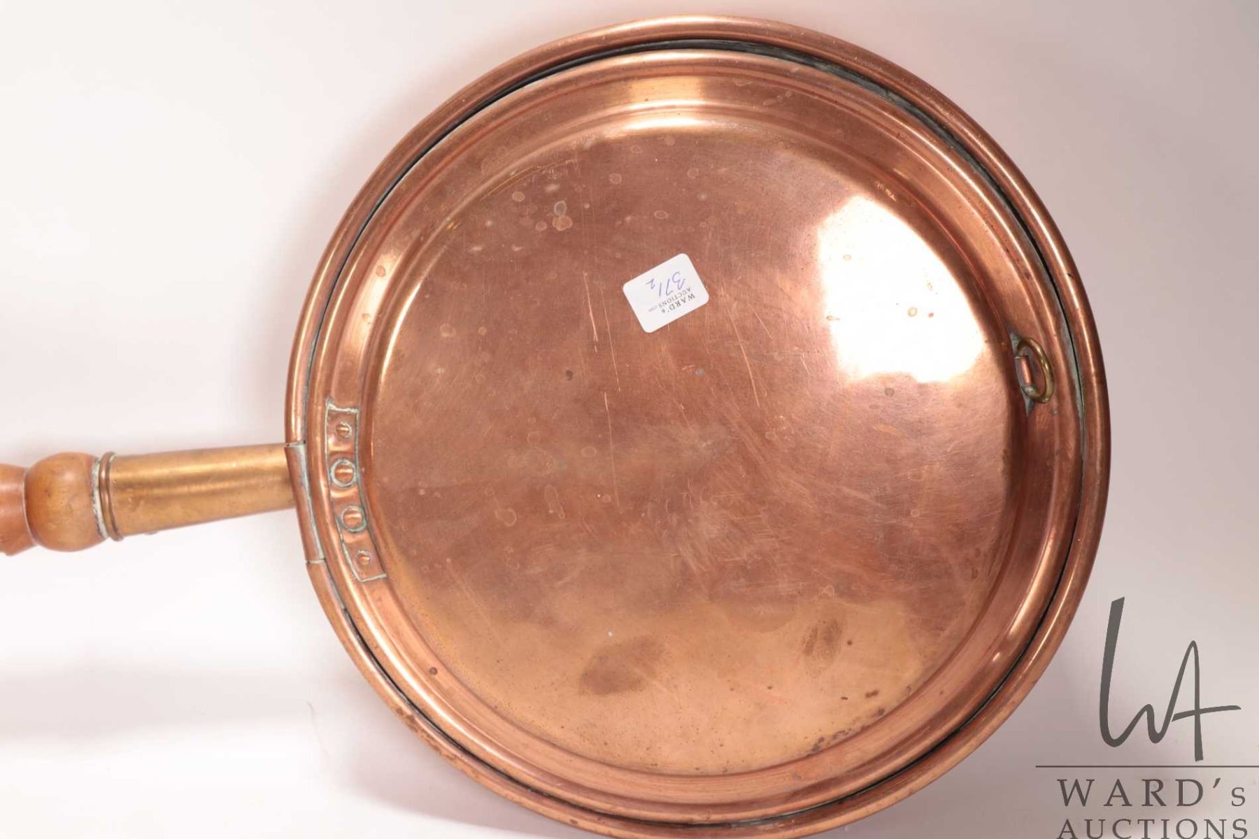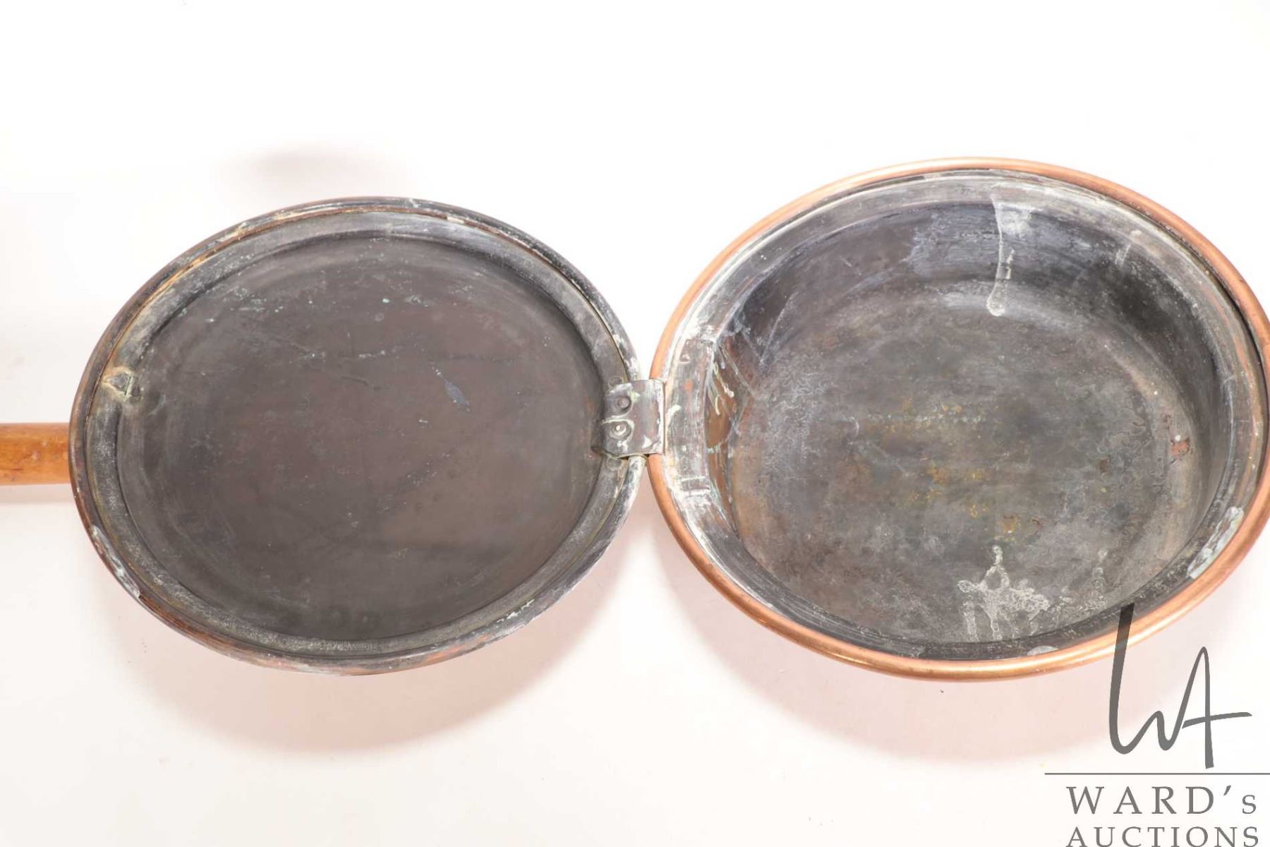 Lot 371 Vintage copper bed warmer with 30" wooden handle and a vintage copper pot, 9-1/2" wide, 8" tall