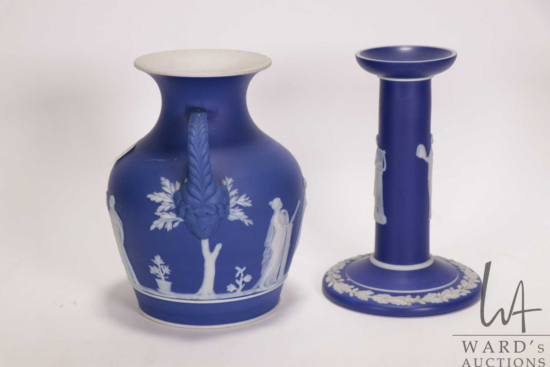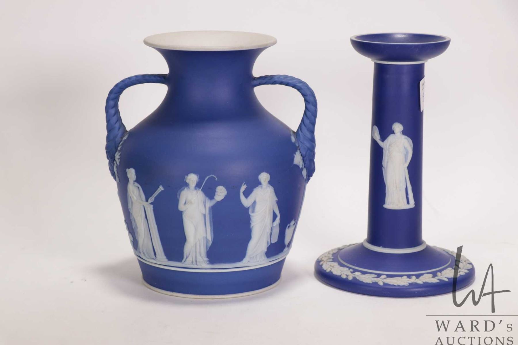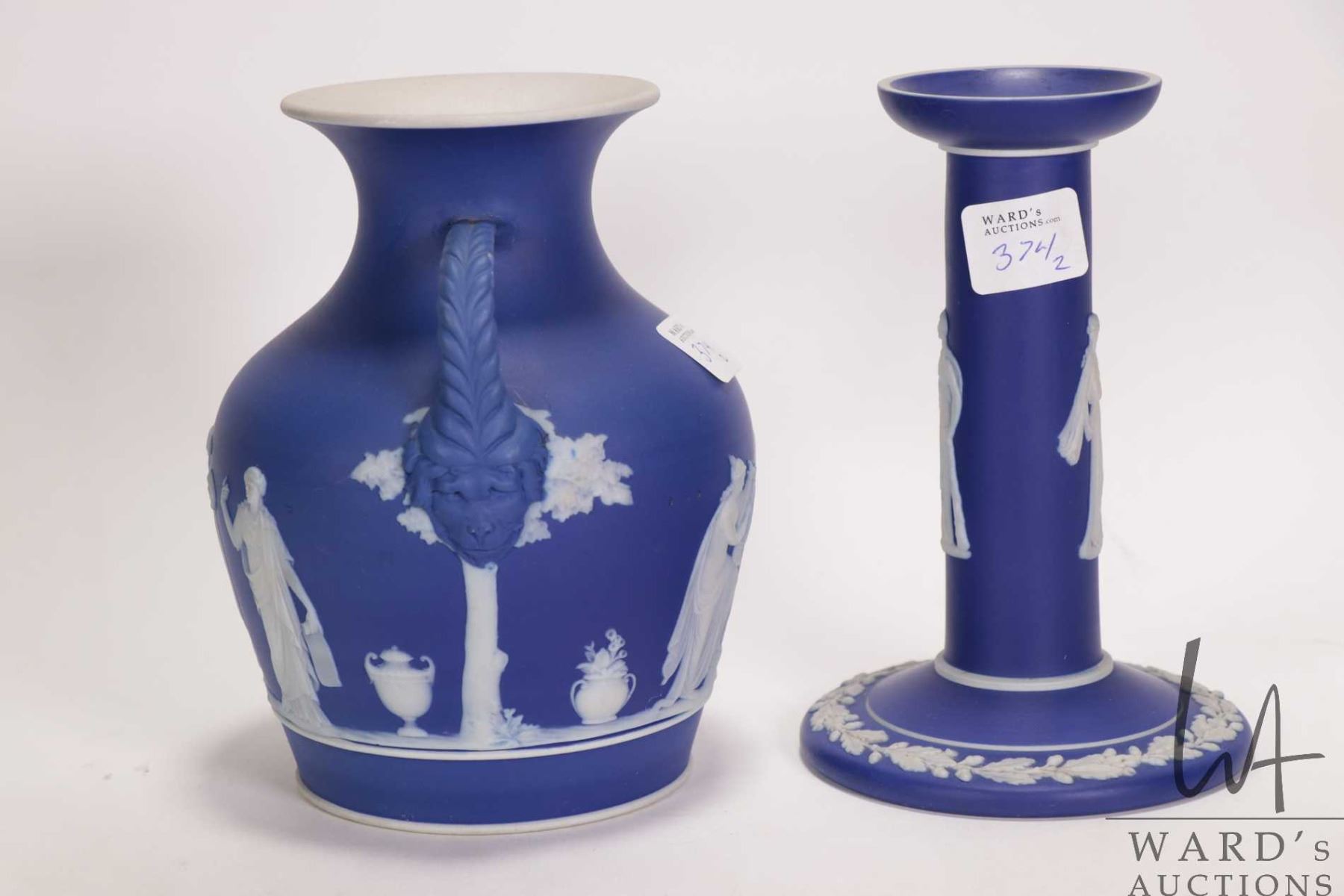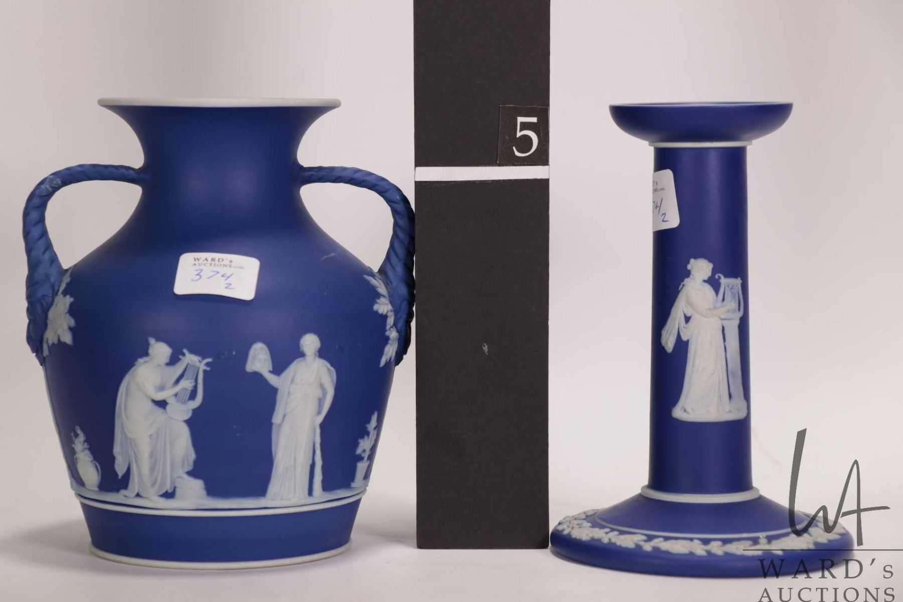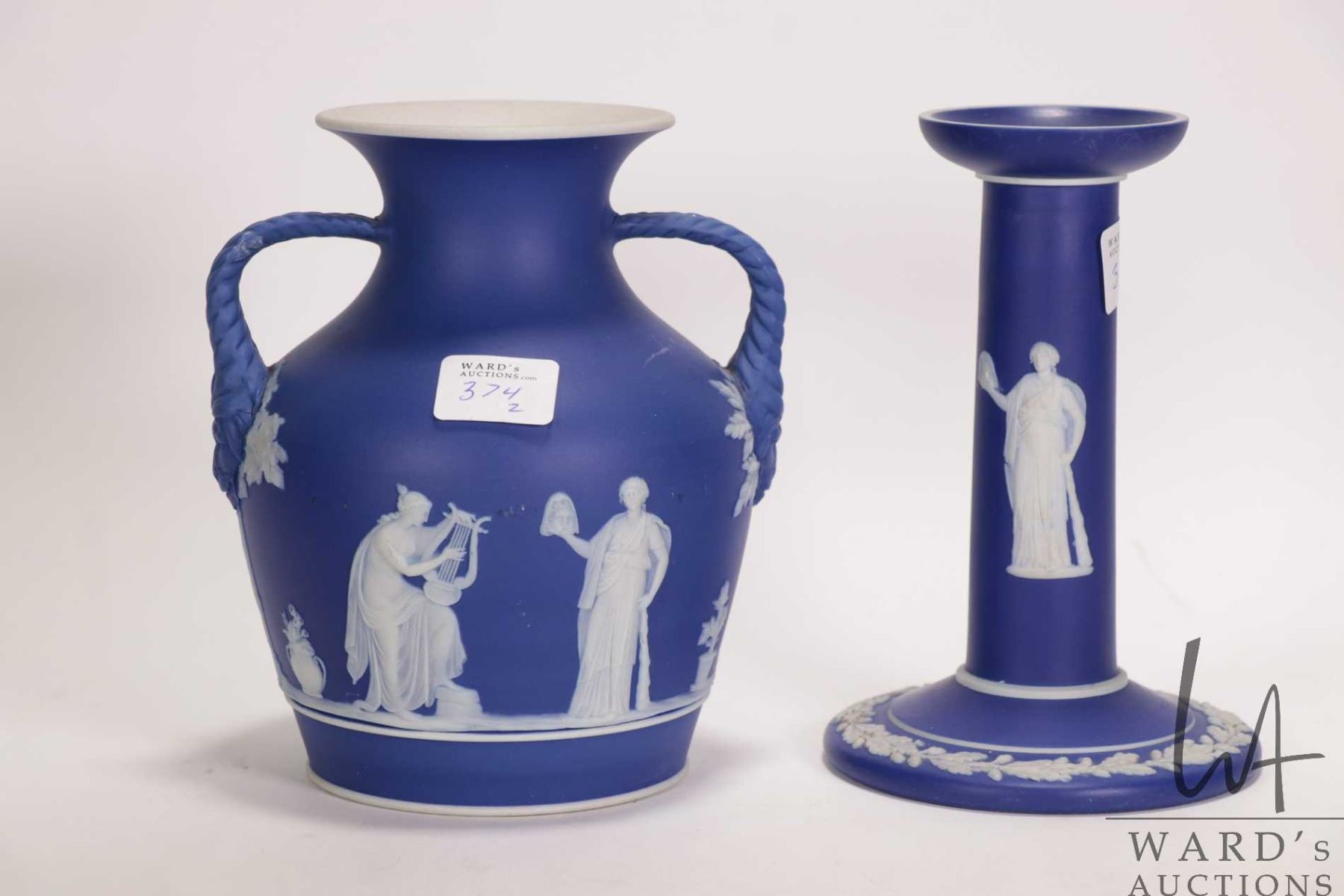 Lot 374 Two Pieces of Cobalt Blue Wedgwood Jasperware including 6" candle stick and a 6" Portland Vase