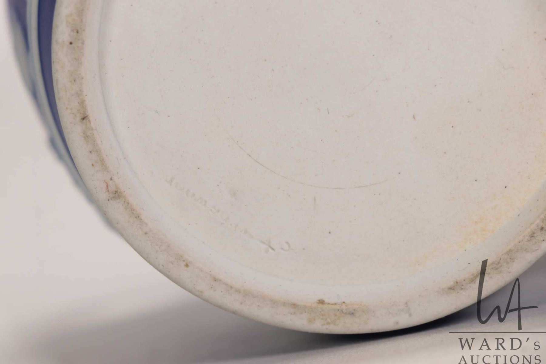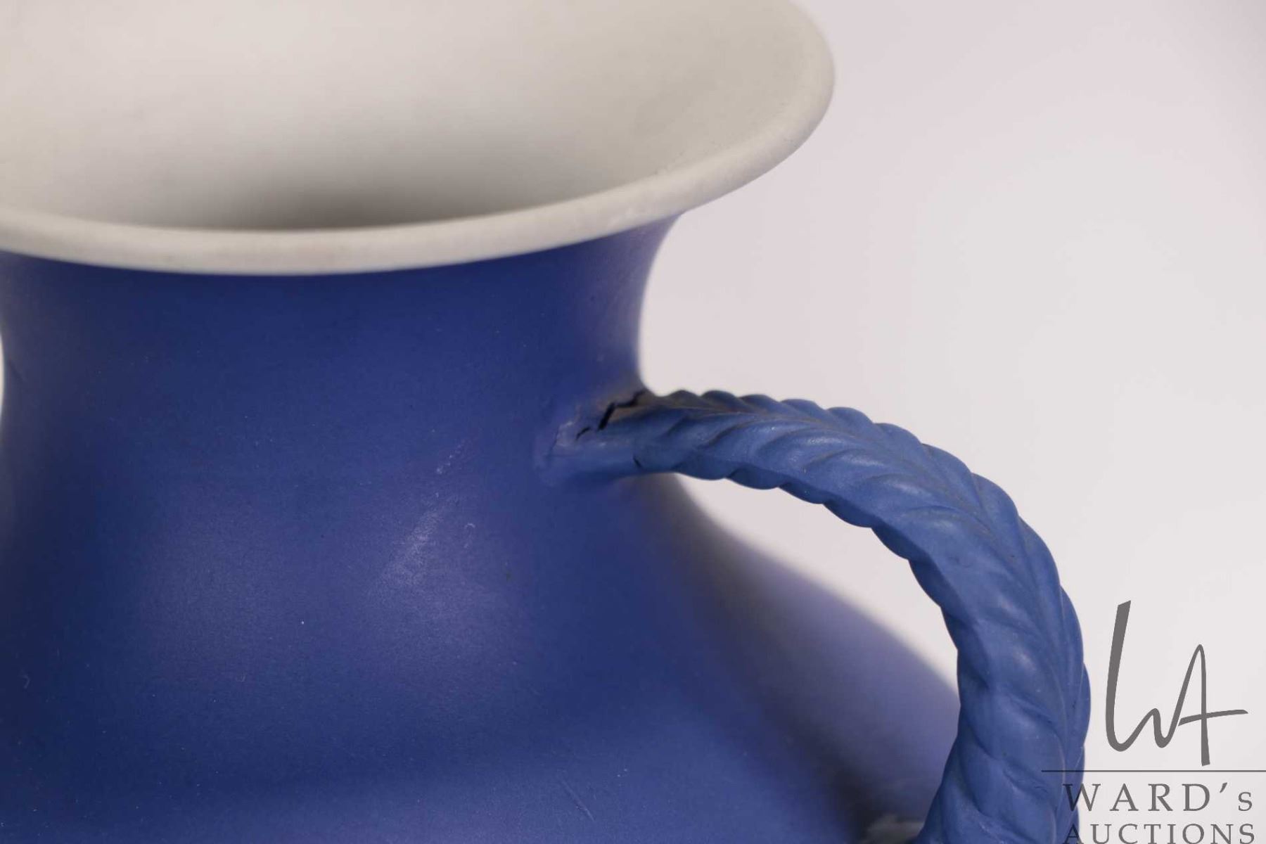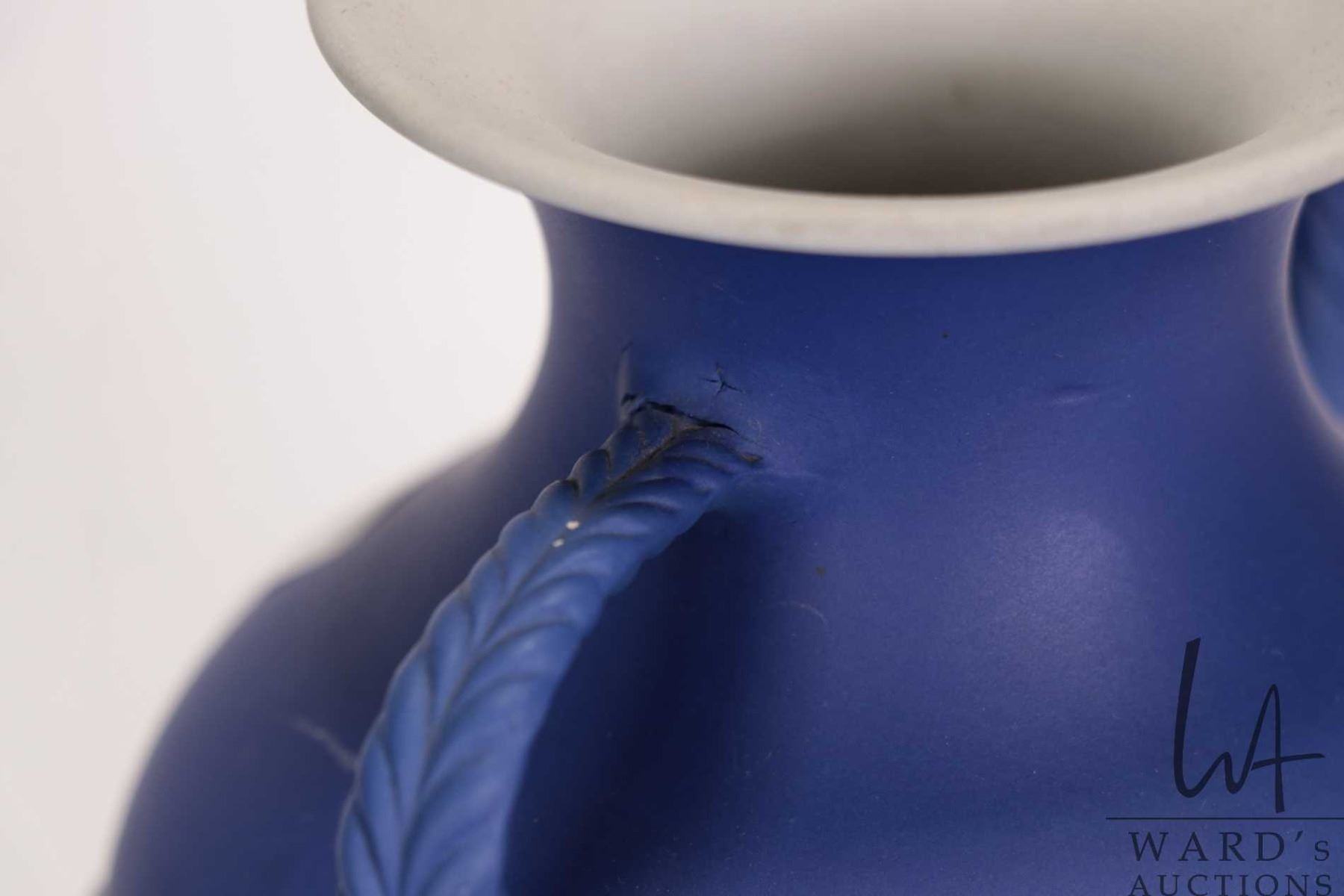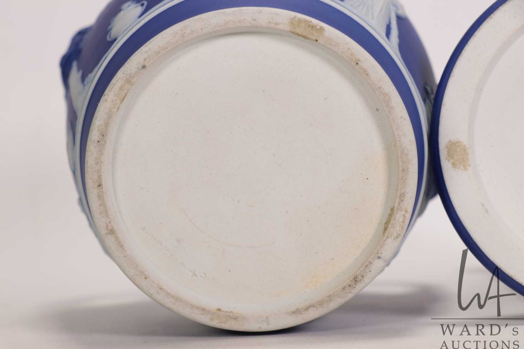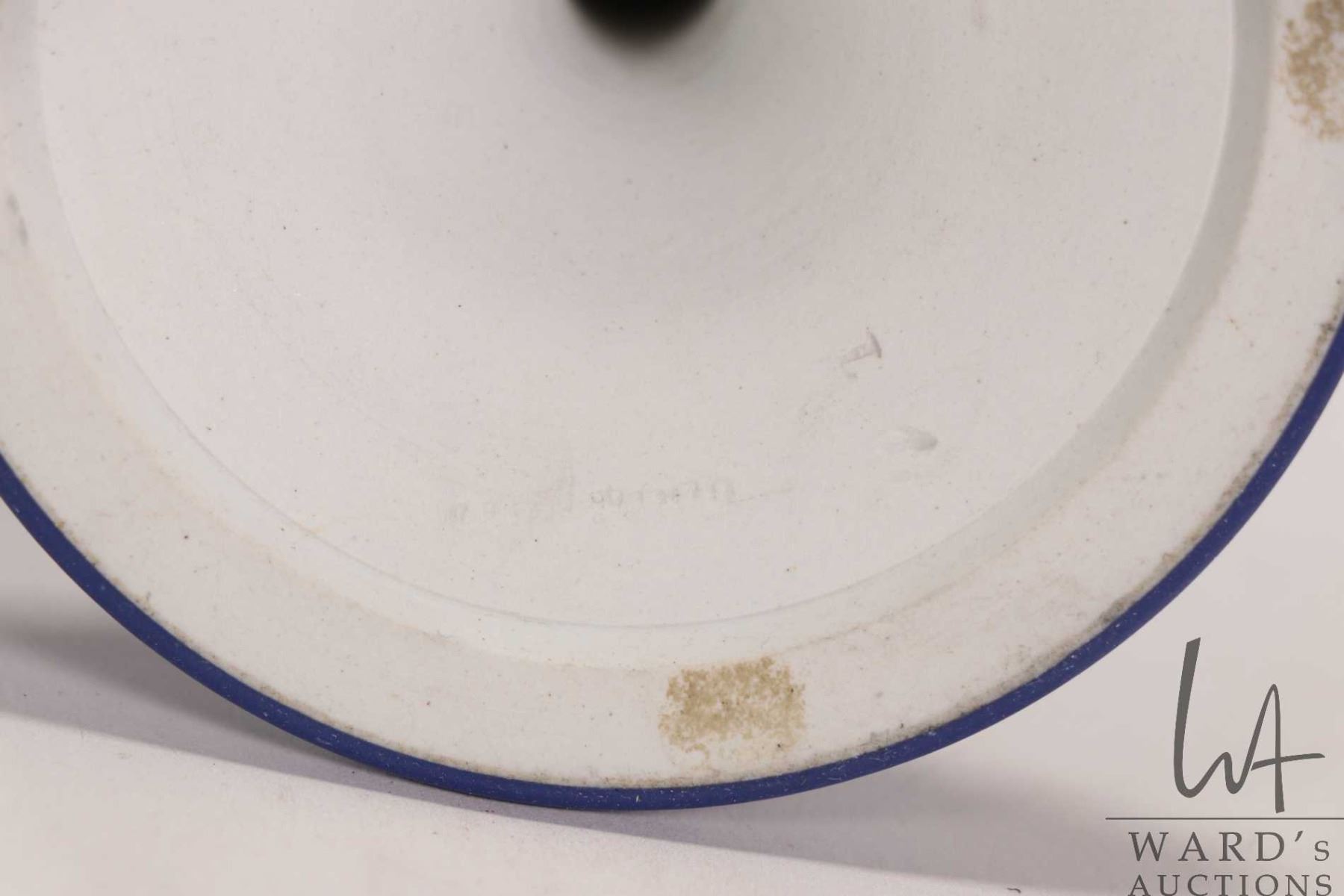 Lot 374 Two Pieces of Cobalt Blue Wedgwood Jasperware including 6" candle stick and a 6" Portland Vase