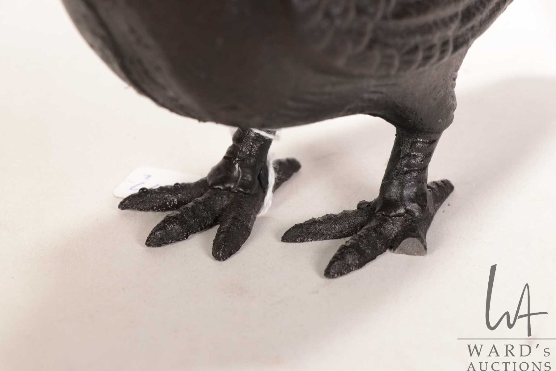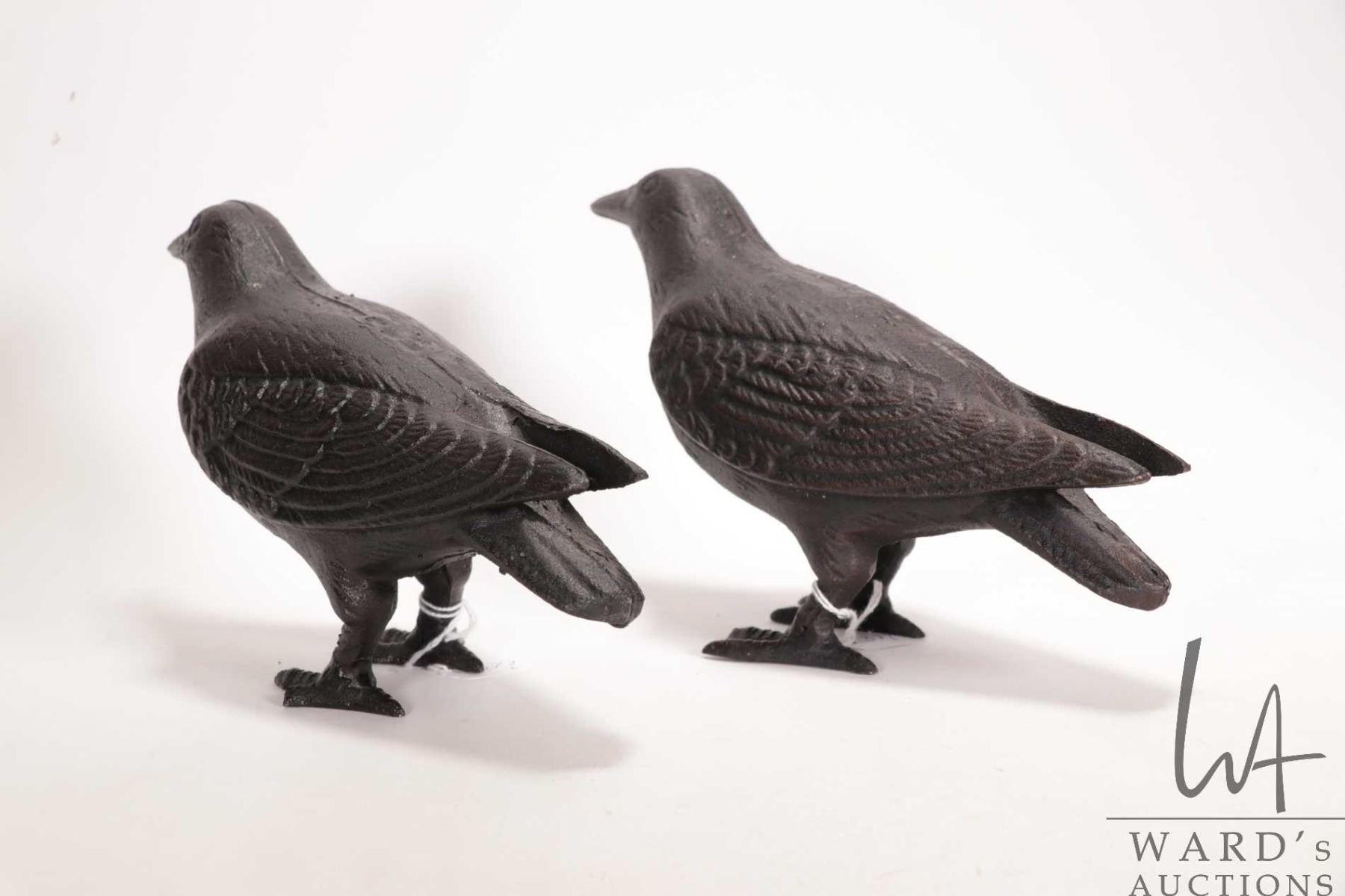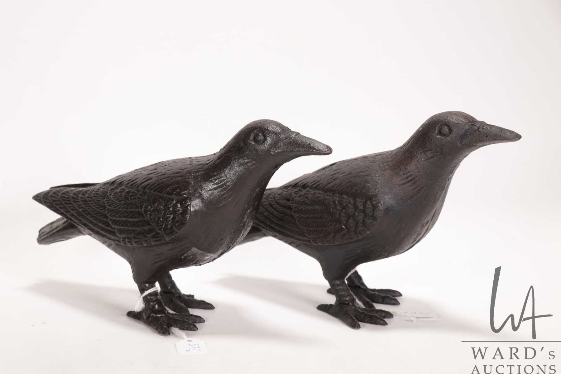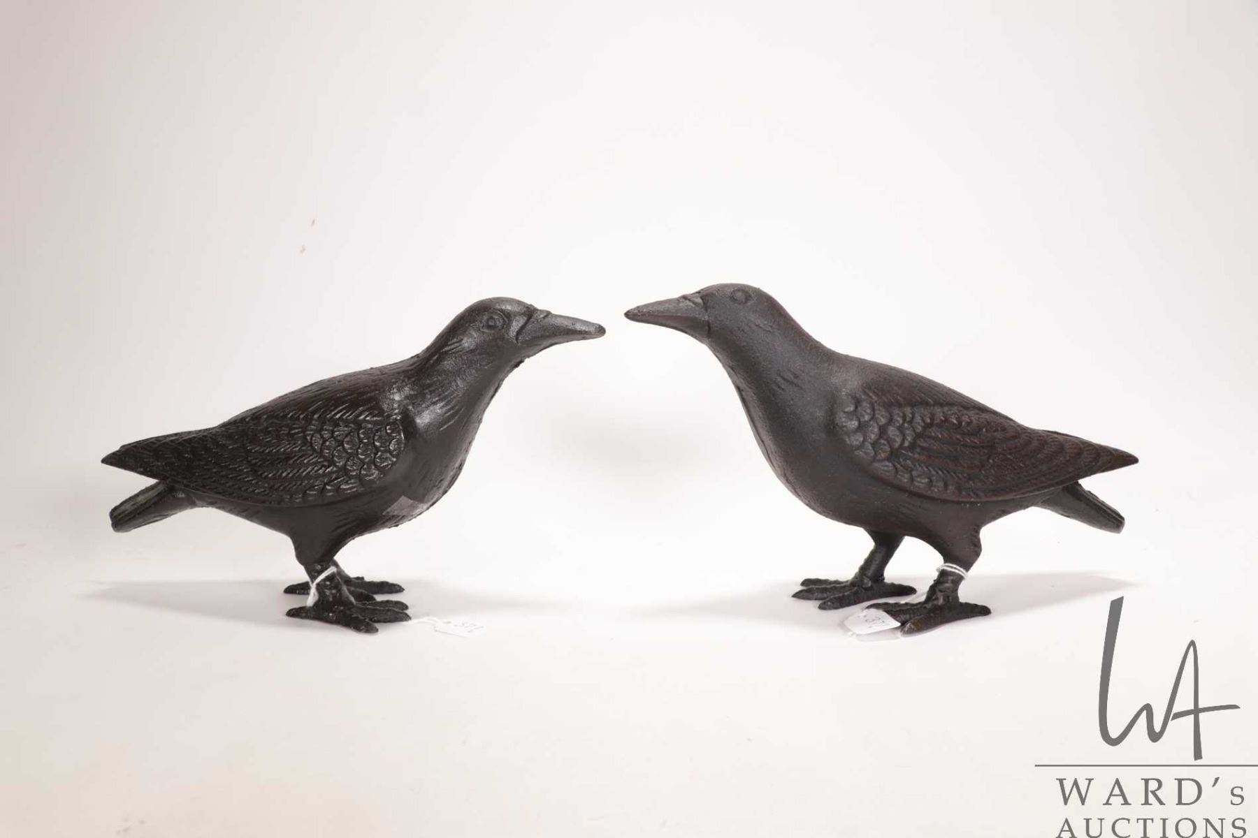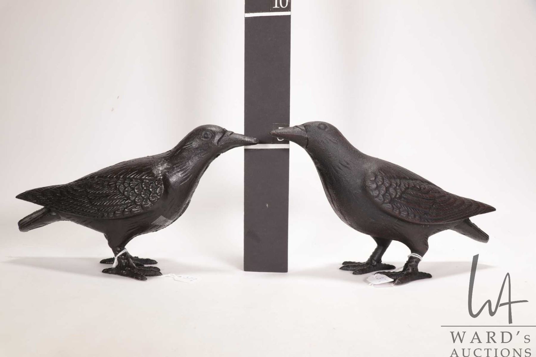 Lot 377 Two Cast Black Bird Door Stops. Measure 10" across and 6" tall. Note, one has a broken toe