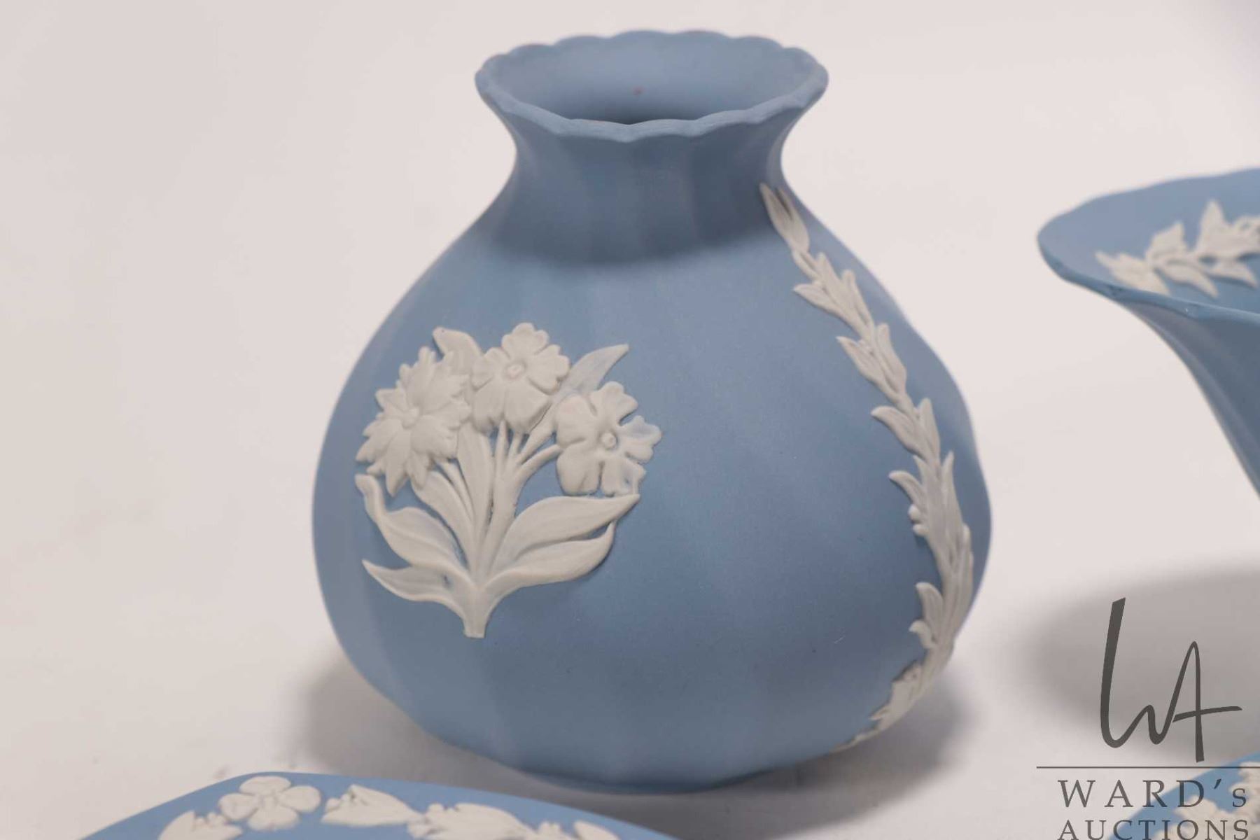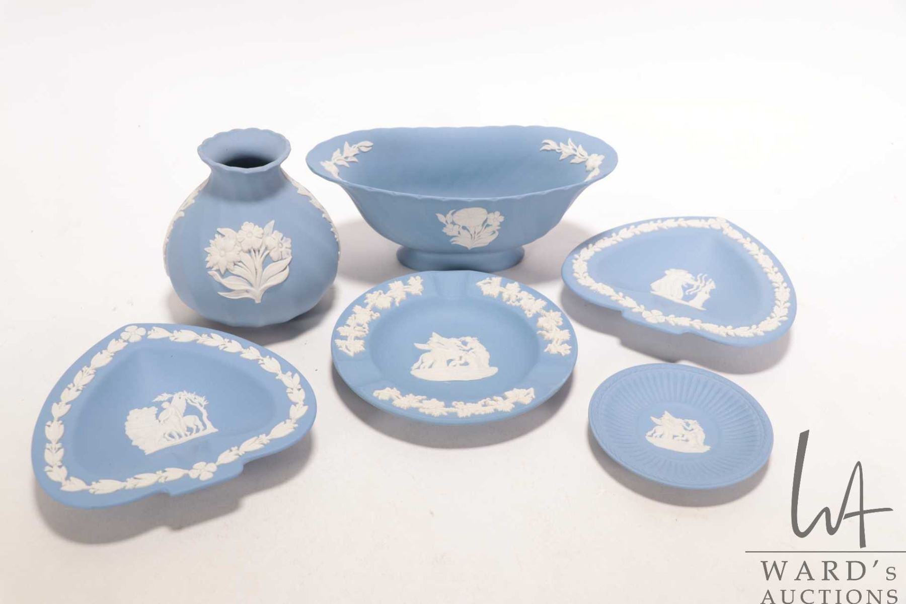 Selection of Wedgwood Jasperware including three small pin trays, miniature 3" dish, footed dish and a small vase