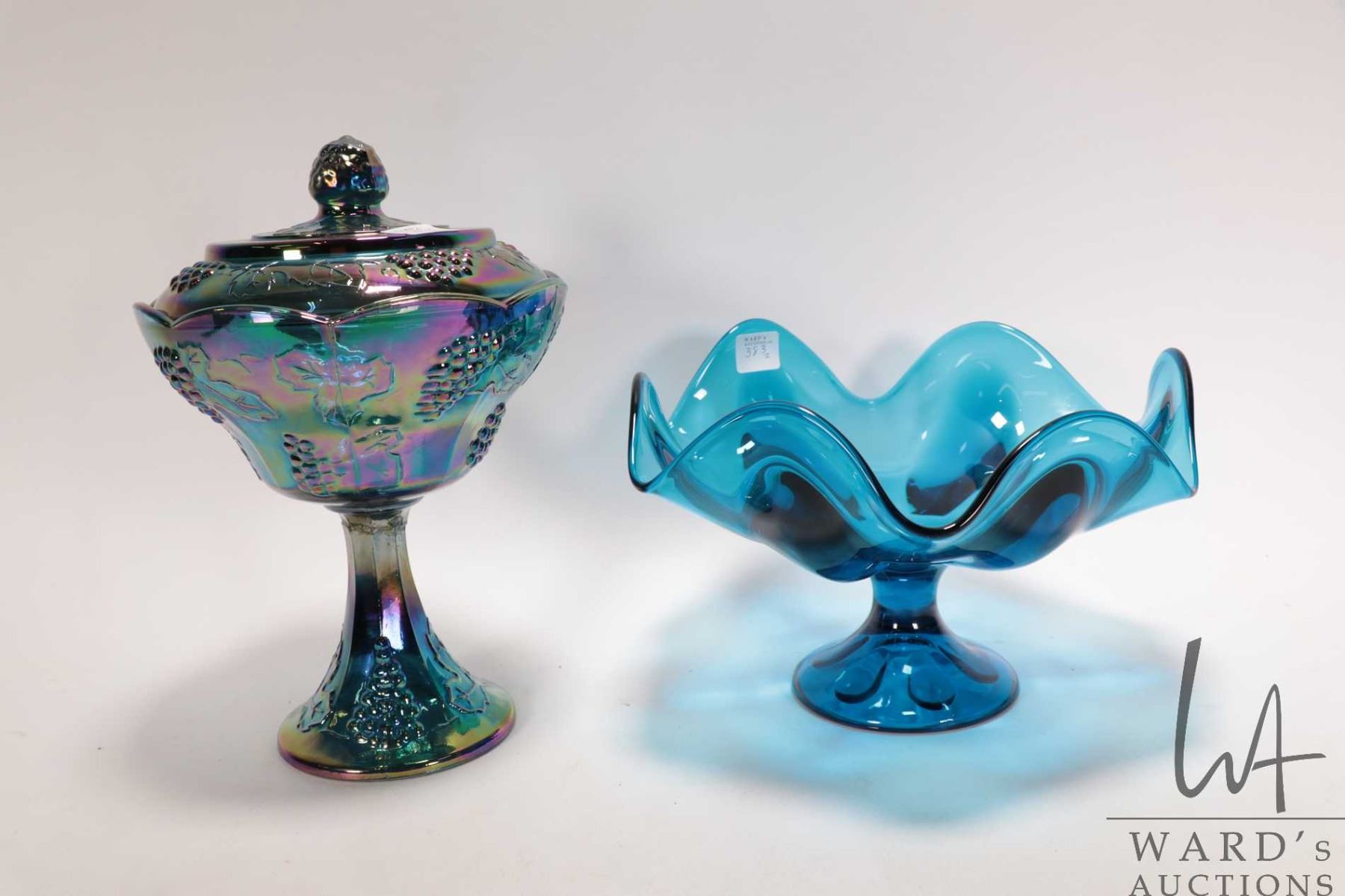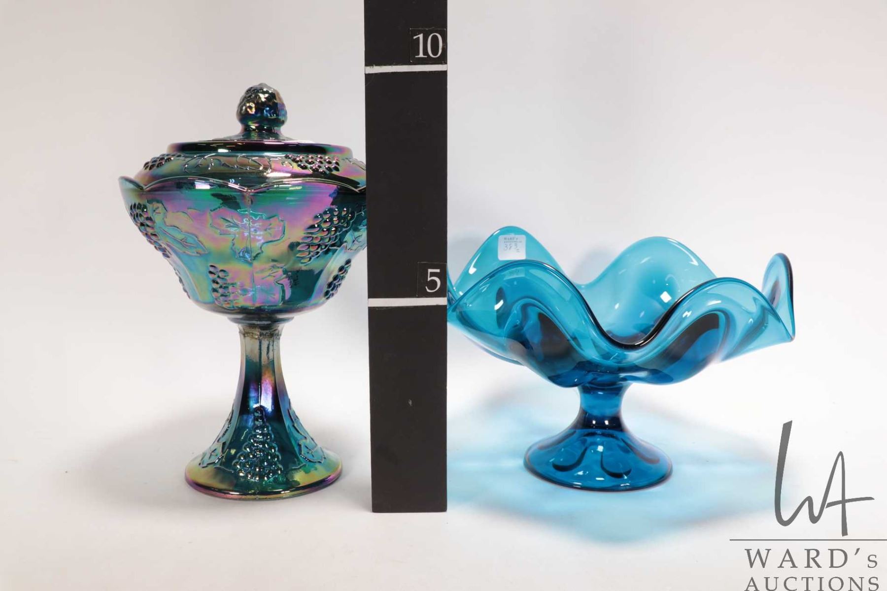 Lot 383 Two pieces of vintage art glass including blue iridescent Carnival glass lidded comport and a fluted