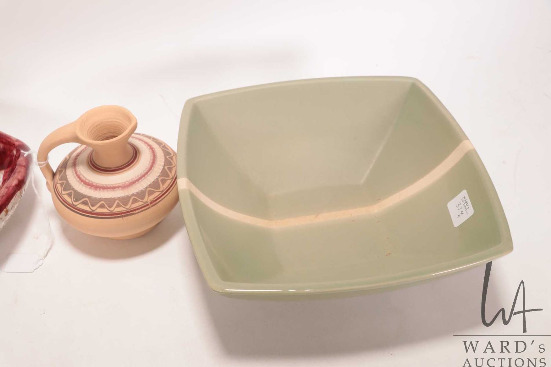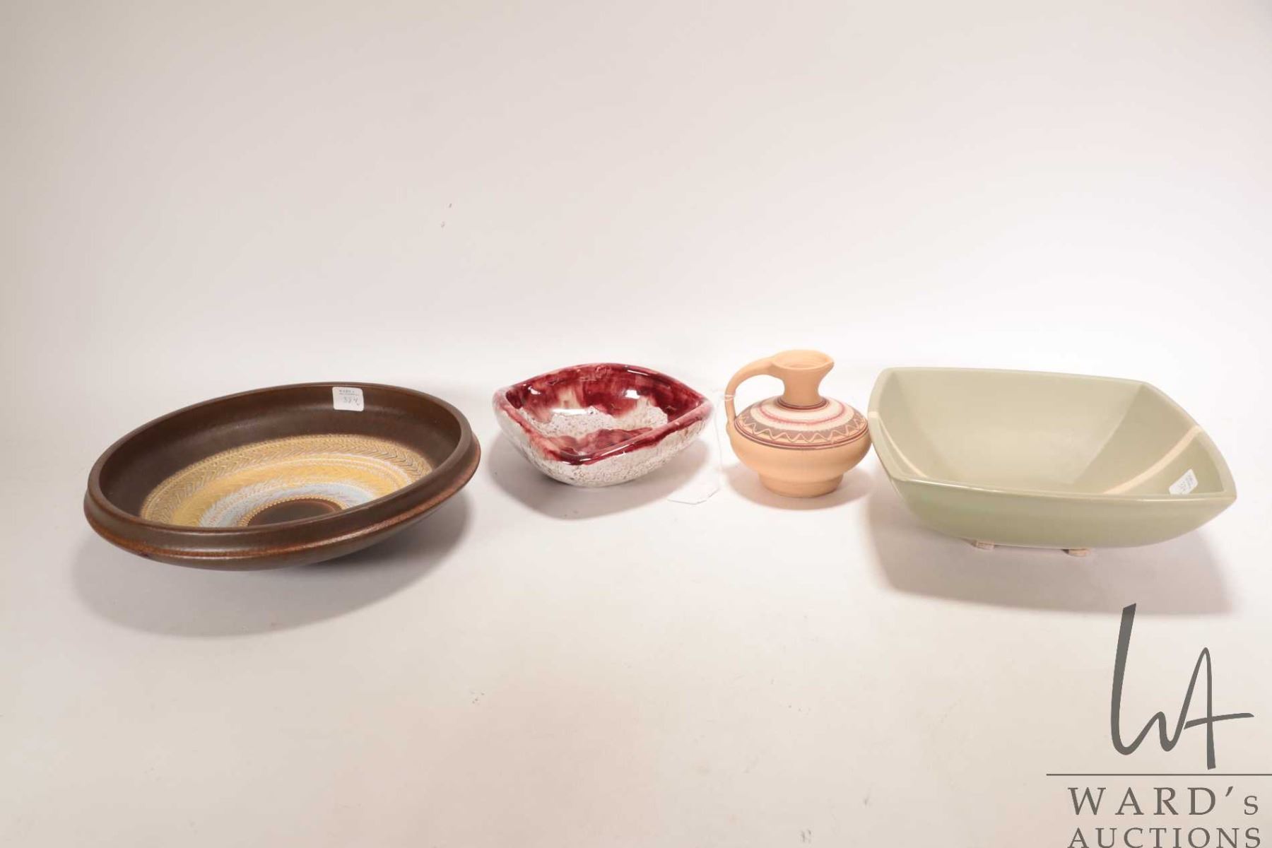 Four pieces of vintage pottery including square footed 9" X 9" bowl, glazed three sided dish, small ewer and a 11" diameter West German bowl, note: small chip repair under edge