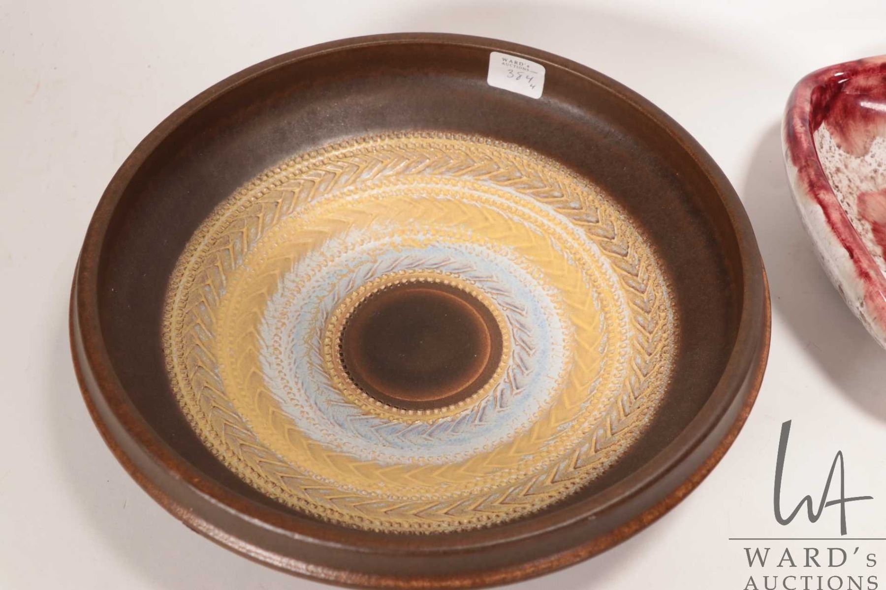 Lot 384 Four pieces of vintage pottery including square footed 9" X 9" bowl, glazed three sided dish, small