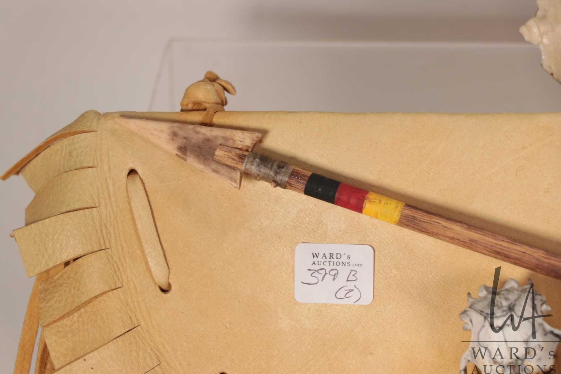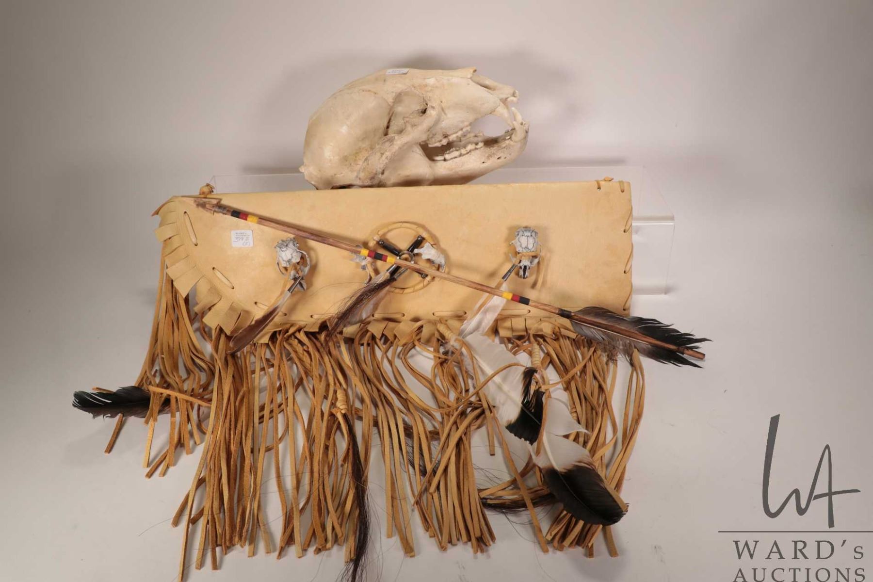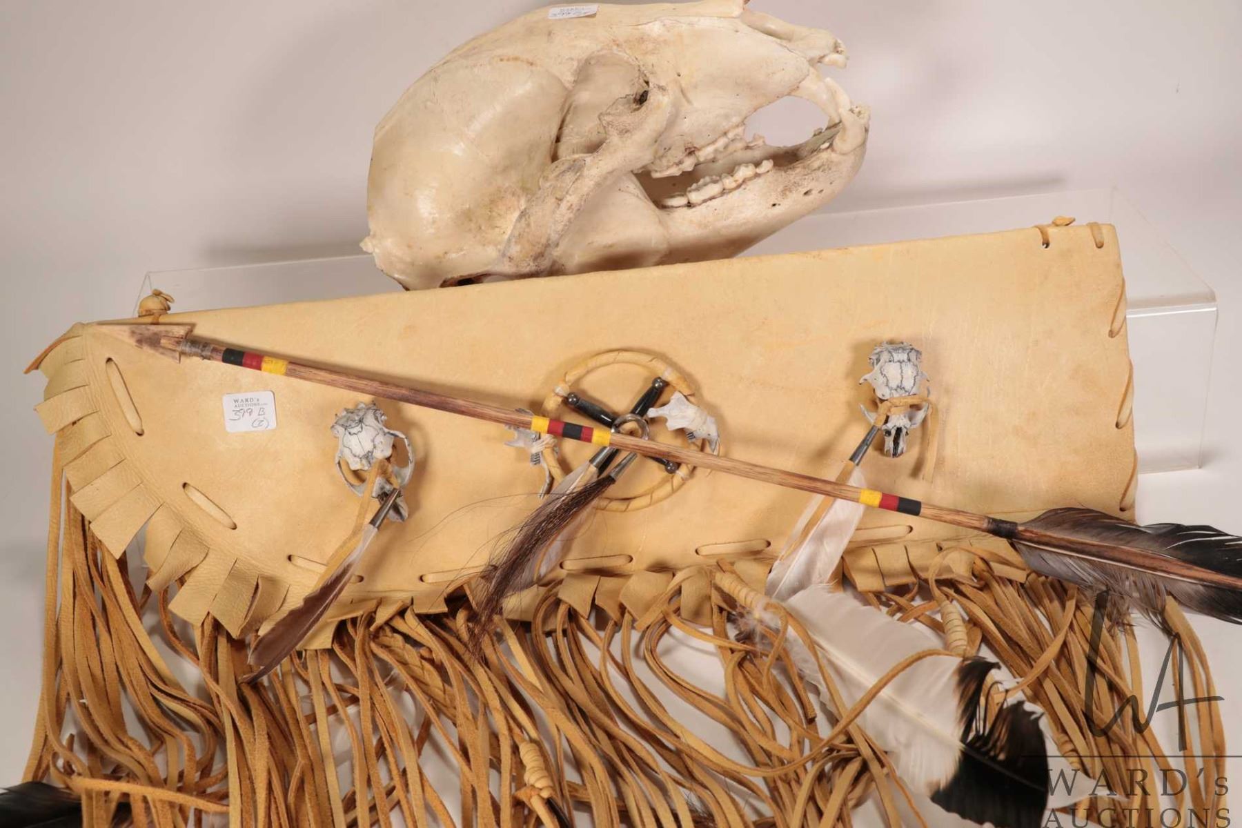 Lot 399b Leather, fringed arrow quiver adorned with rodent skulls and a 11" long black bear skull