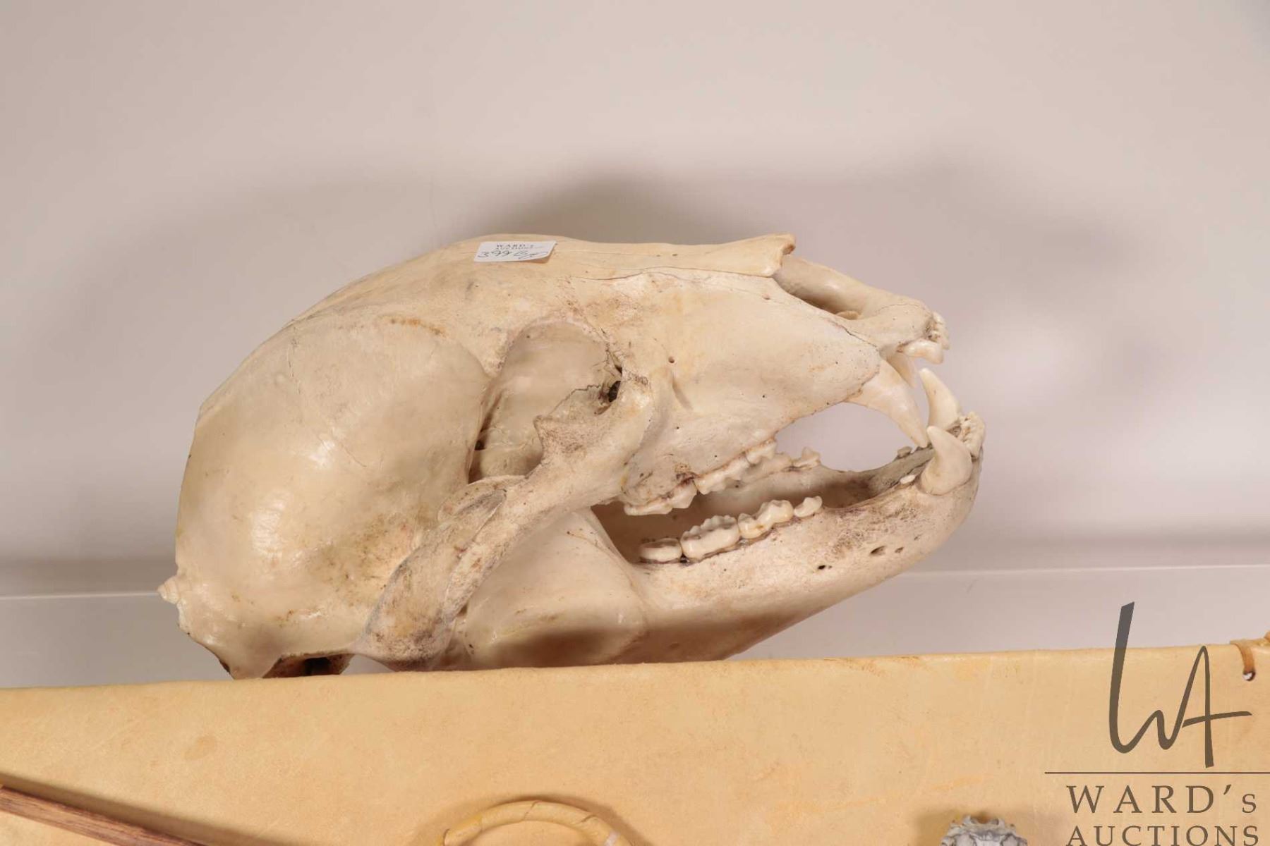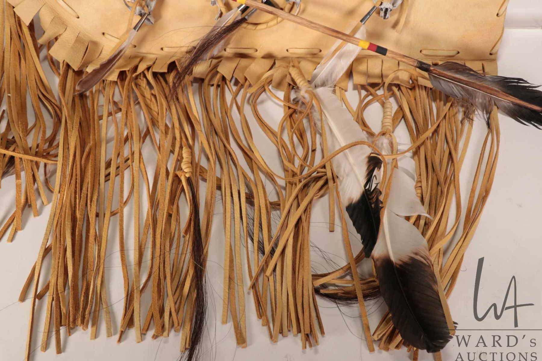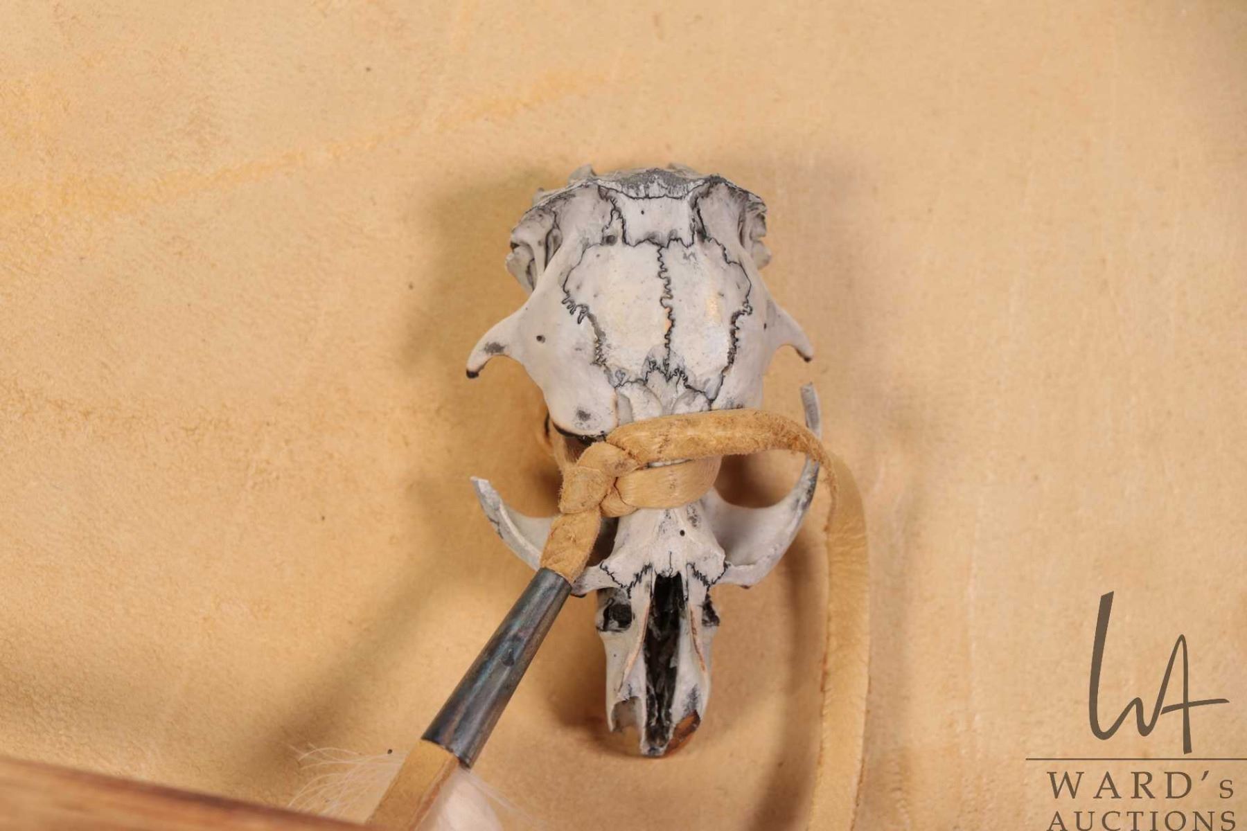 Lot 399b Leather, fringed arrow quiver adorned with rodent skulls and a 11" long black bear skull