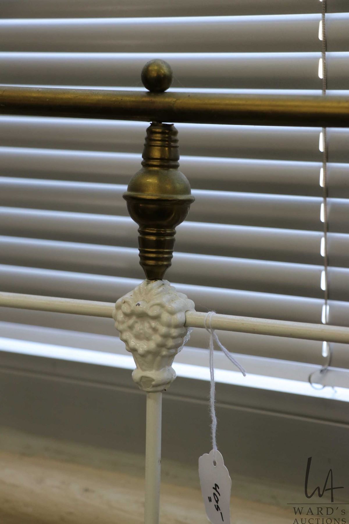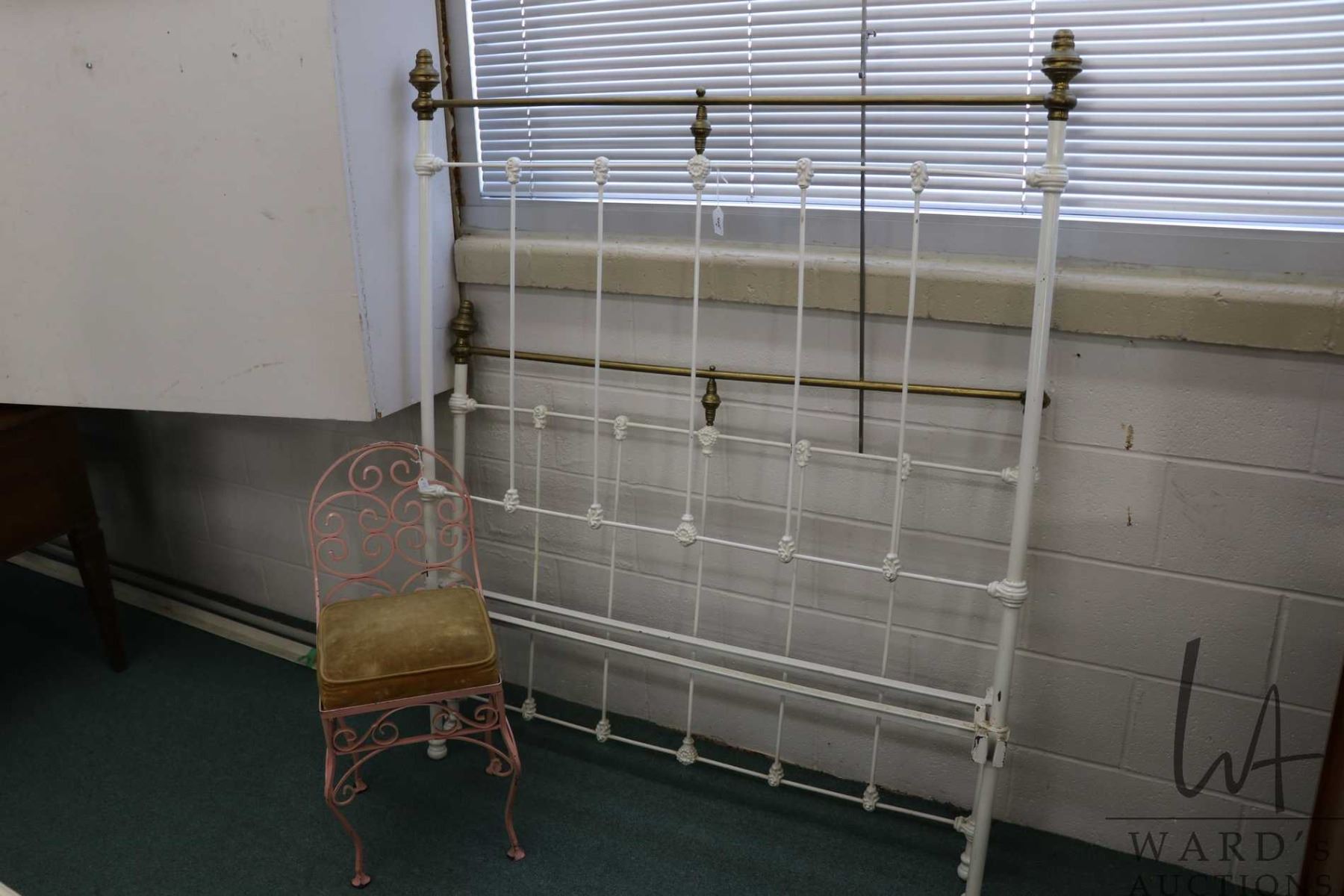 Antique wrought iron chair with upholstered cushion seat 18" in height, suitable for a vanity or child's garden seat and a 46" wide wrought iron and brass bed with rails, note: missing one finial