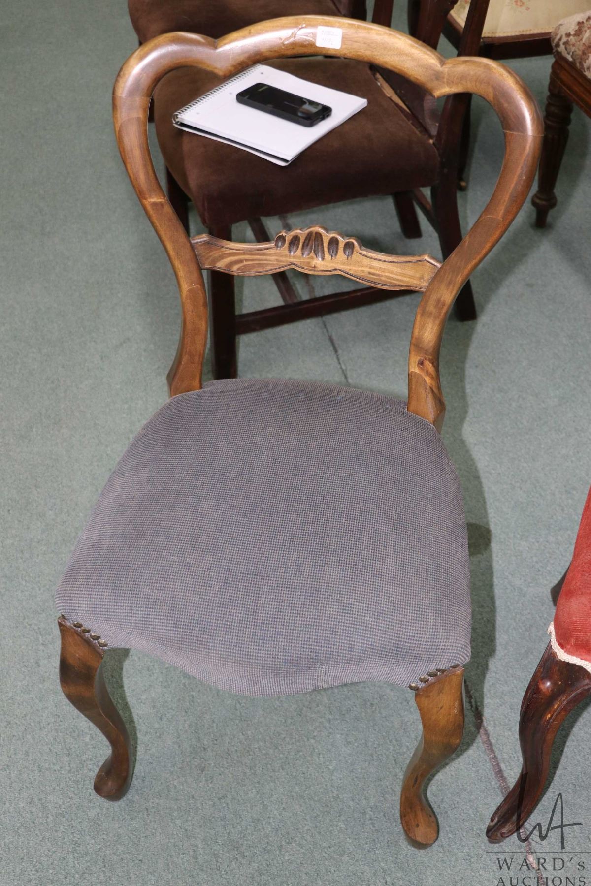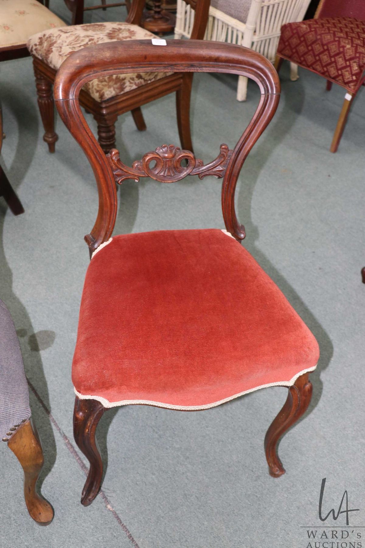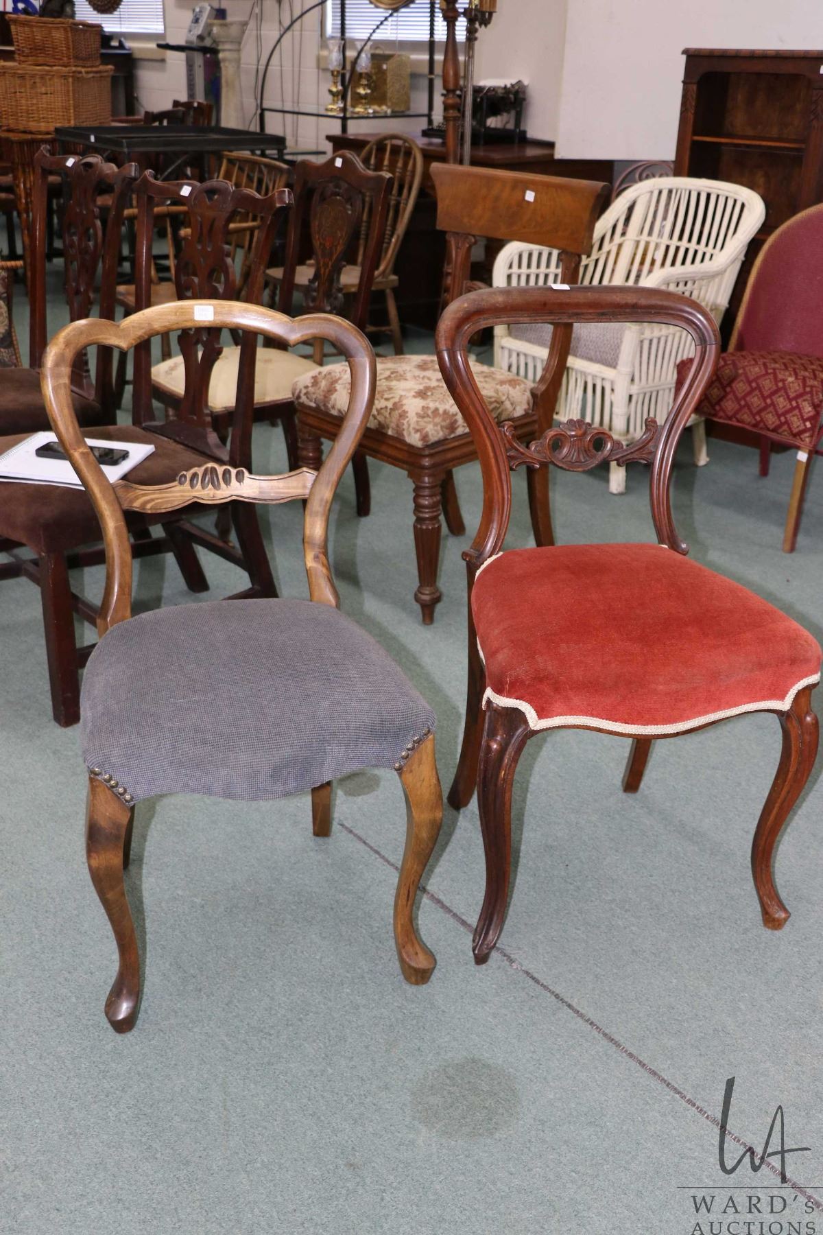 Lot 411 Two antique balloon back chairs, both with curved supports and upholstered seats