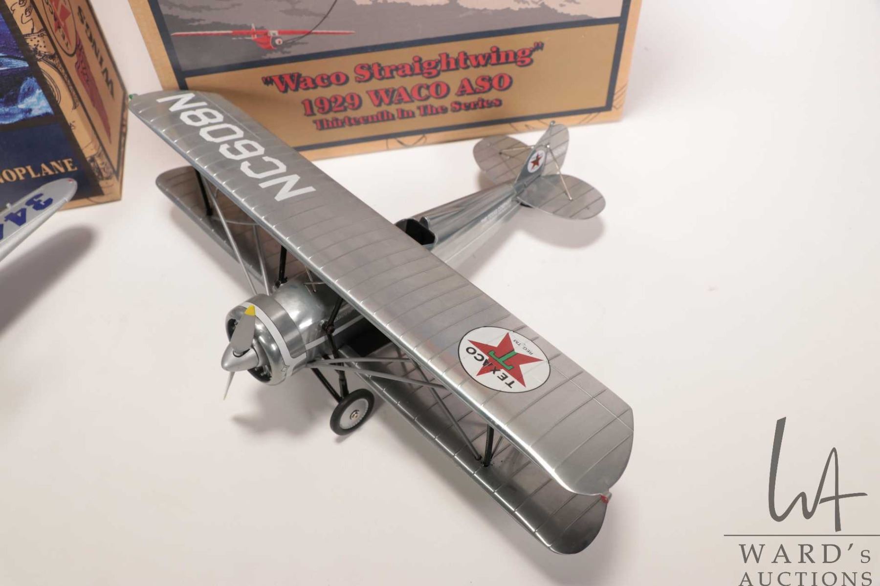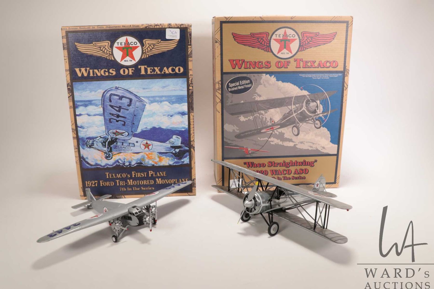 Two Wings of Texaco die cast airplane models including "1927 Ford Tri-Motored Monoplane" and "1929 Waco Straightwing ASO"