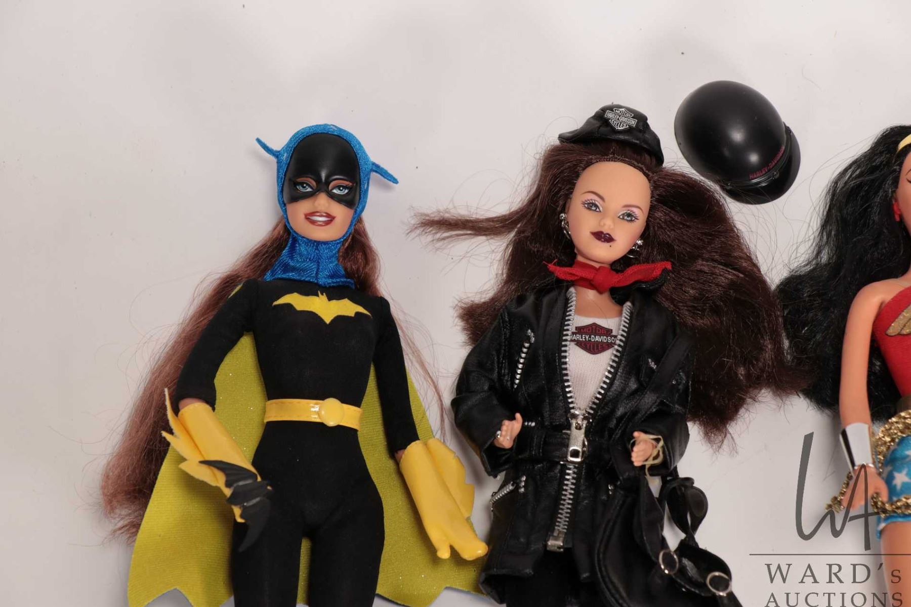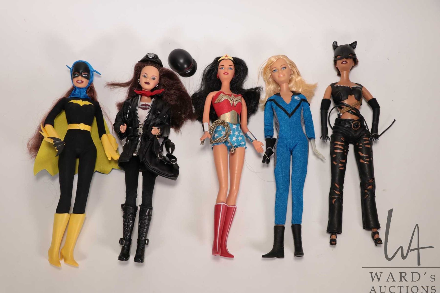 Five collectible Barbie dolls including Batwoman, Wonder Woman, Invisible Woman, Cat Woman, and a Harley Davidson doll