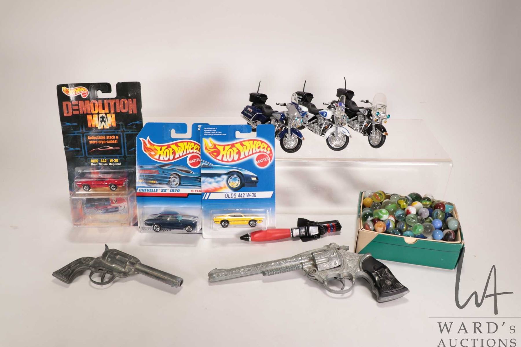 Selection of collectibles including 3 Maisto Harley Davidson police motorbikes, 2 vintage revolver style cap guns including Daisy and Kit Carson, 3 die cast Hot Wheels including Demolition Man Olds 442, 1970 Chevelle SS, and an Olds 442 W-30, a Lego Star Wars themed Darth Vader pen, and a collection of marbles