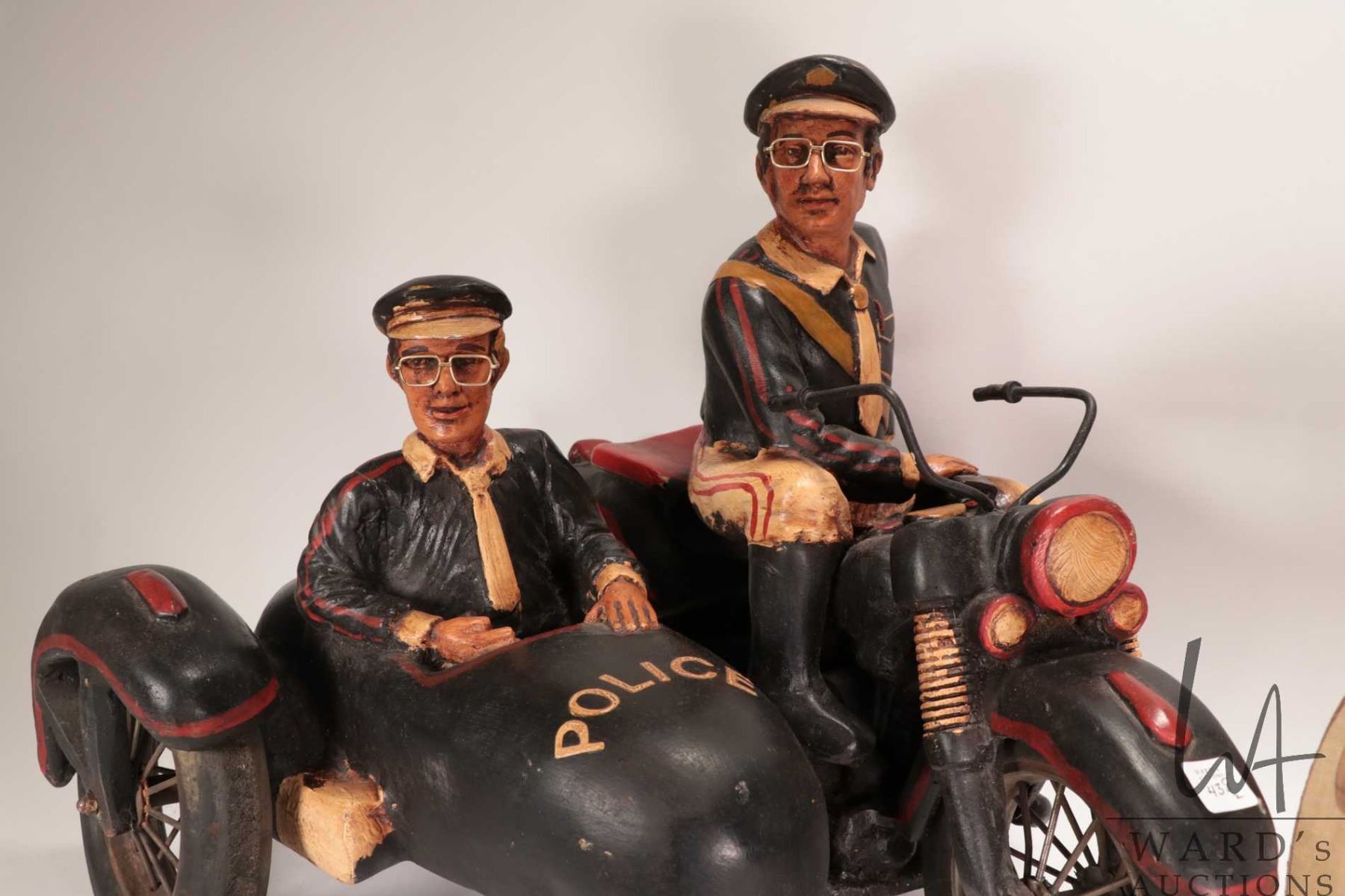 Lot 438 Vintage collectible police motorcycle with side car sculpture, 16" tall and 19" long, and a small vi