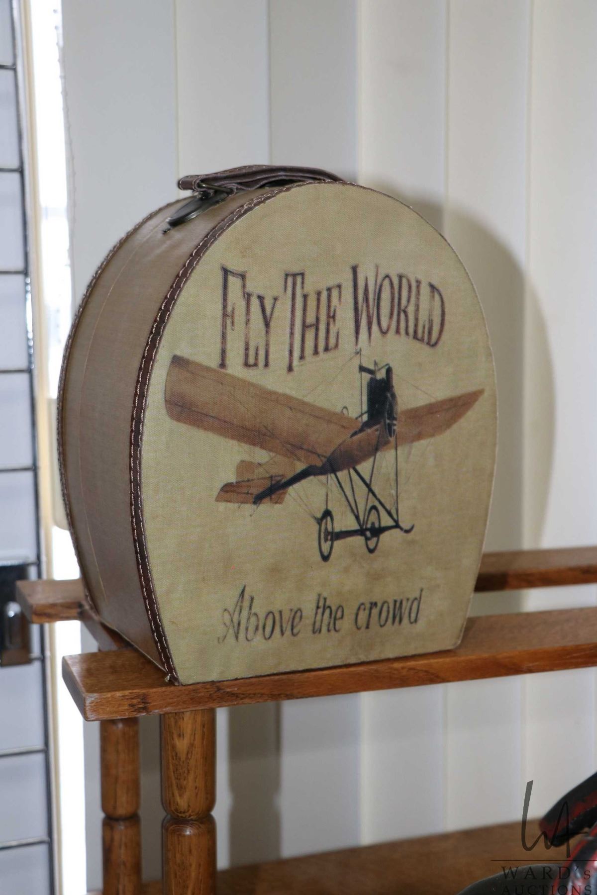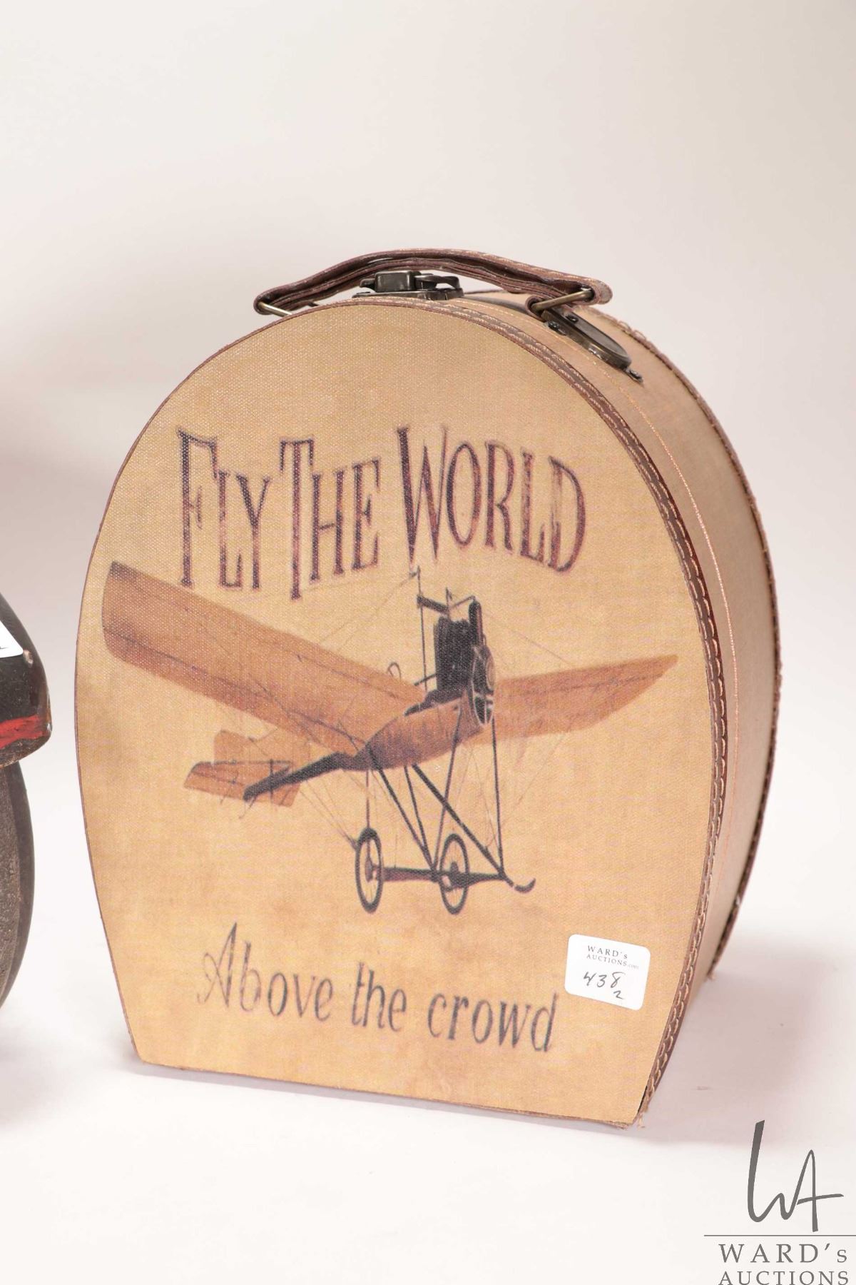 Vintage collectible police motorcycle with side car sculpture, 16" tall and 19" long, and a small vintage "Fly the World" decorative train case replica