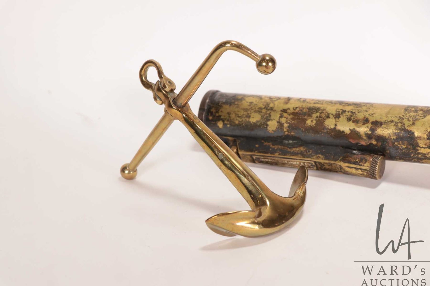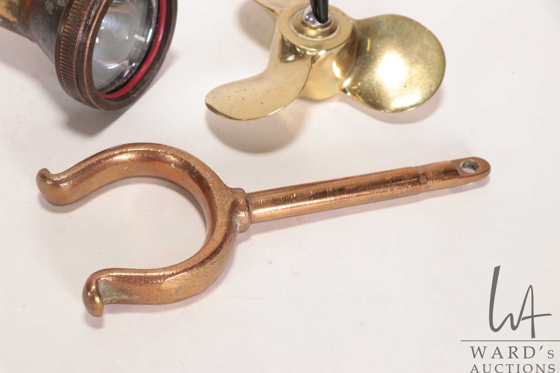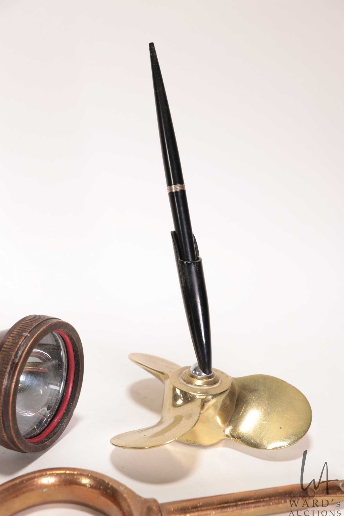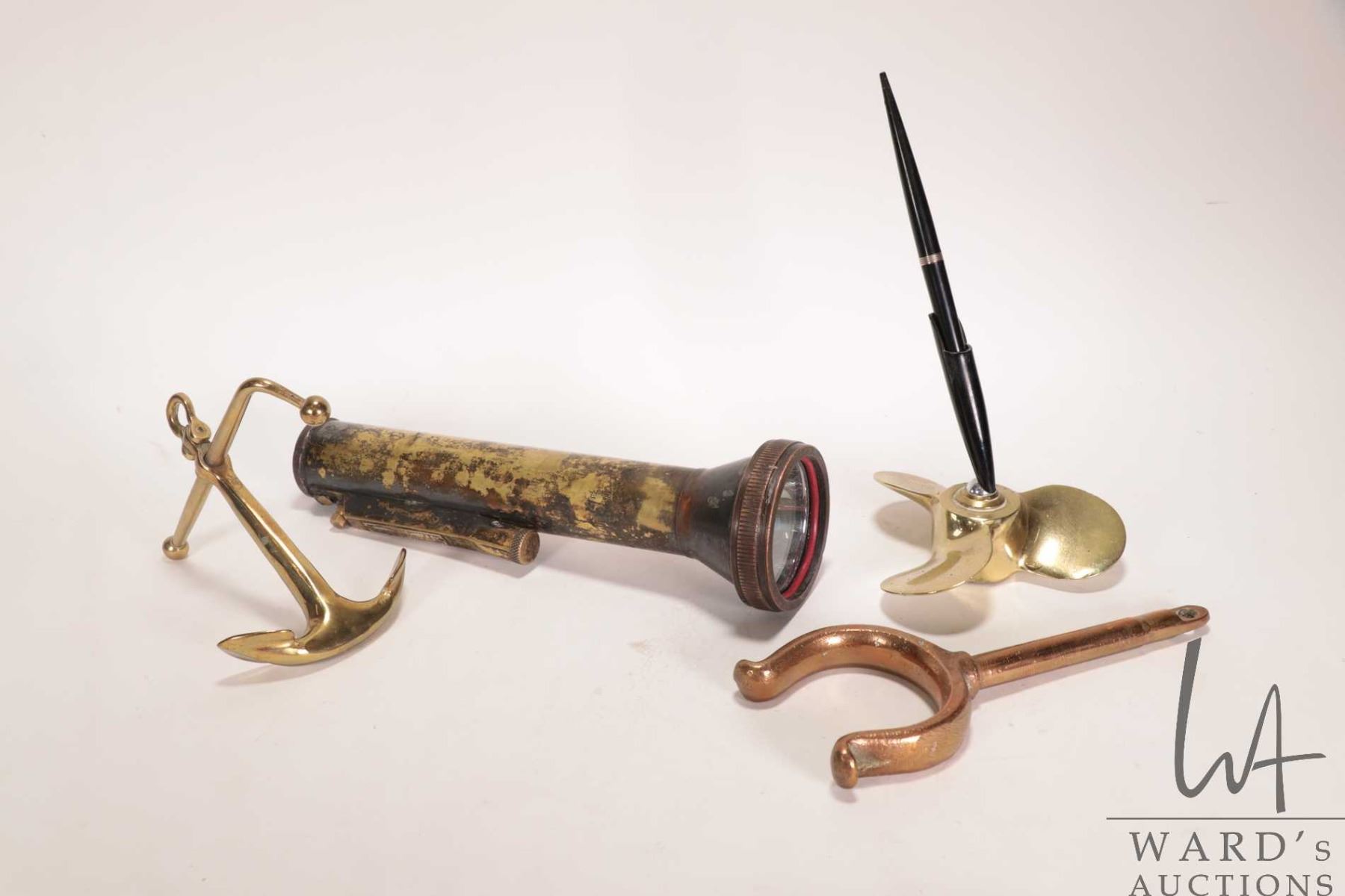 A selection of naval theme items including an antique brass Shimwell Alexander and Co. signal light, a brass propeller styled pen holder, an anchor motif paper weight, and a brass oar stand