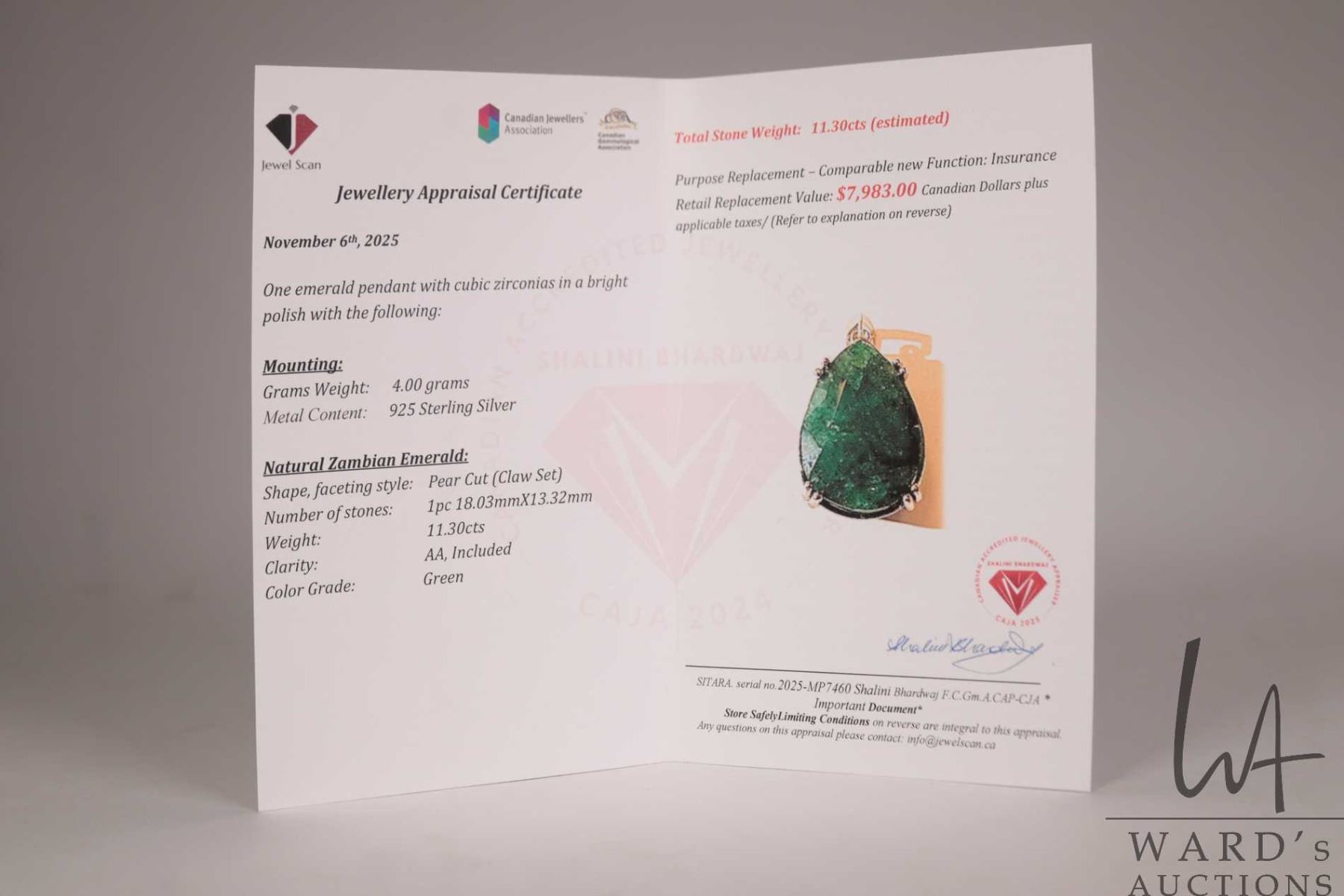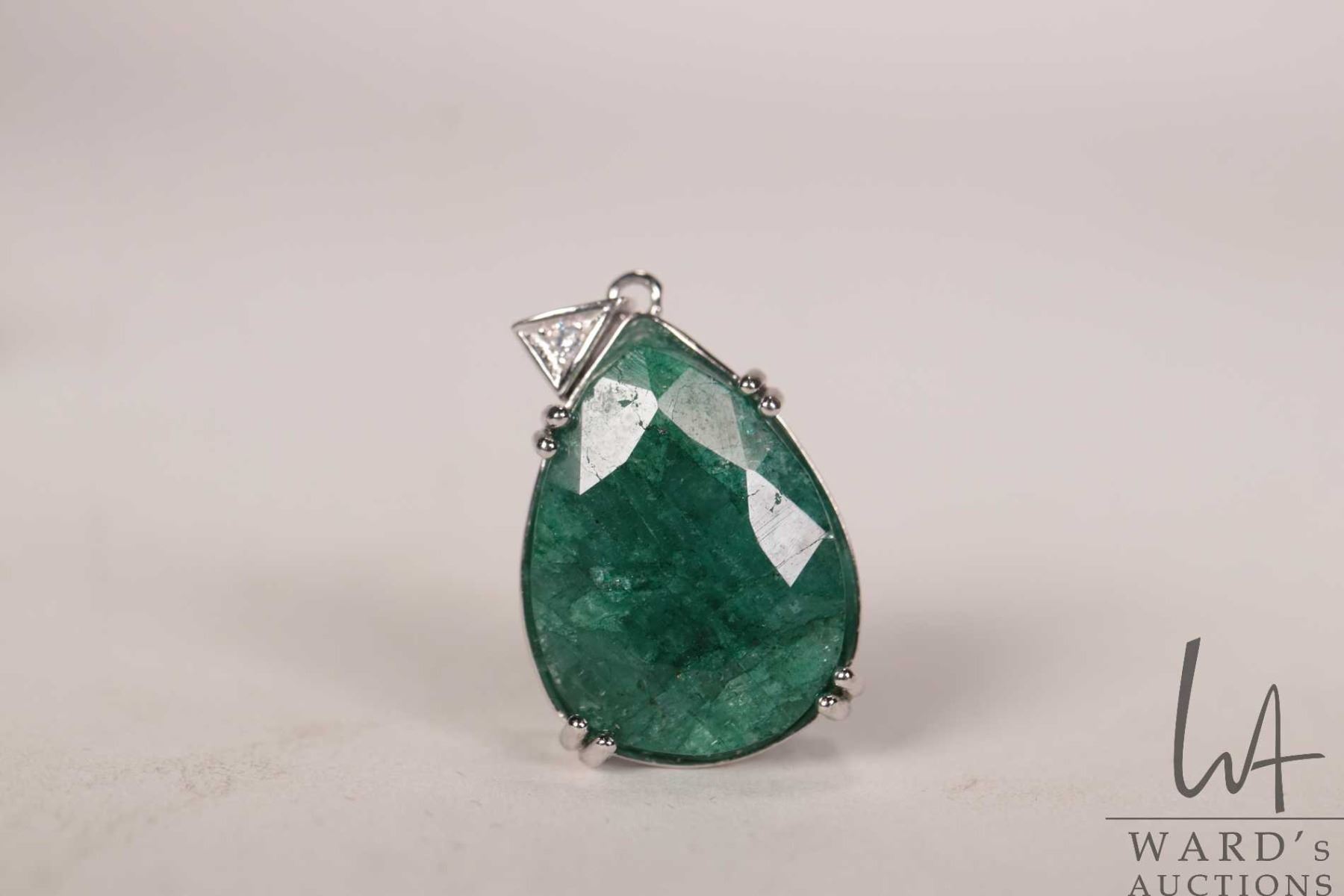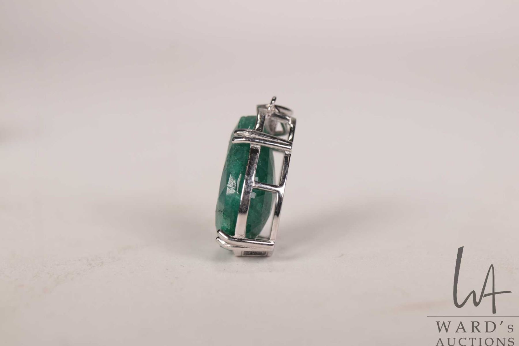 Lot 444 11.30 ct. emerald pear shaped gemstone in stelring silver pendant mount with certificate provided by