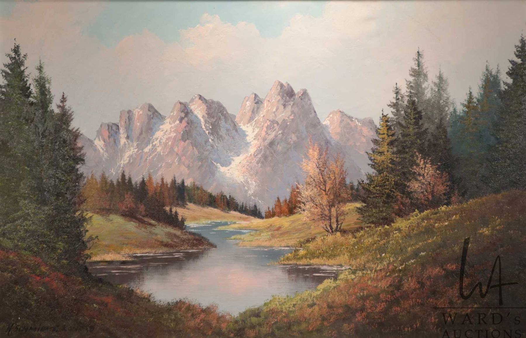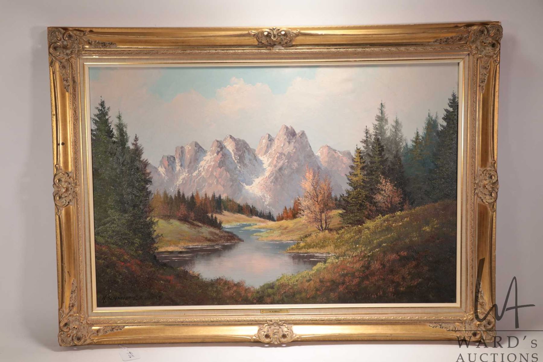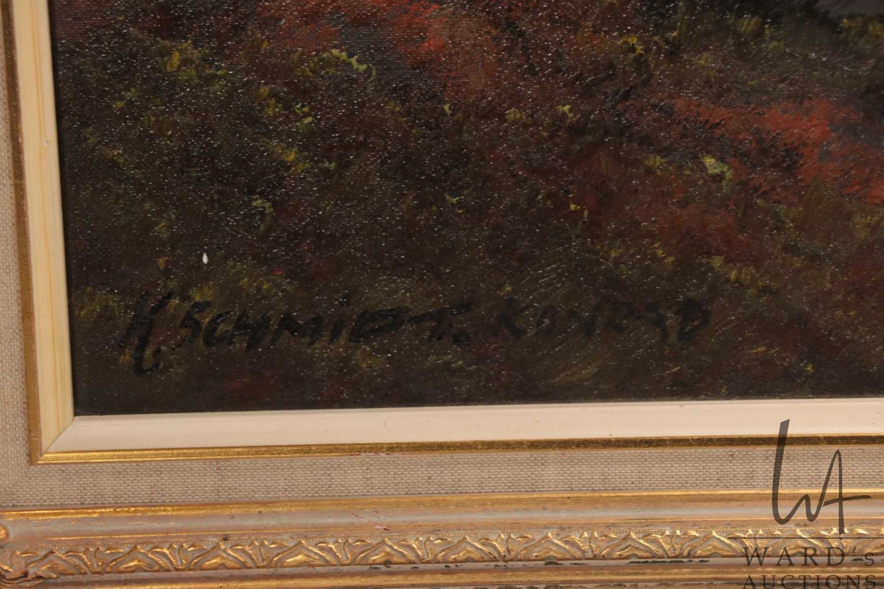 Lot 456 K. Schmidt. Konrad, gilt framed oil on canvas painting of a mountain creek scene 23" x 35"