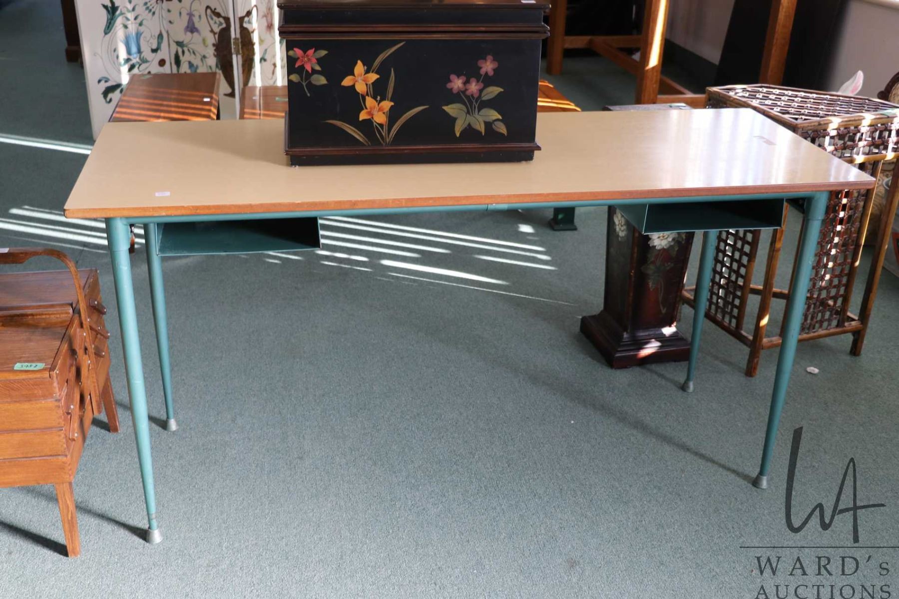 Lot 469 Vintage metal school desk with laminated top and two book storage sections, 30" in height X 60" L X
