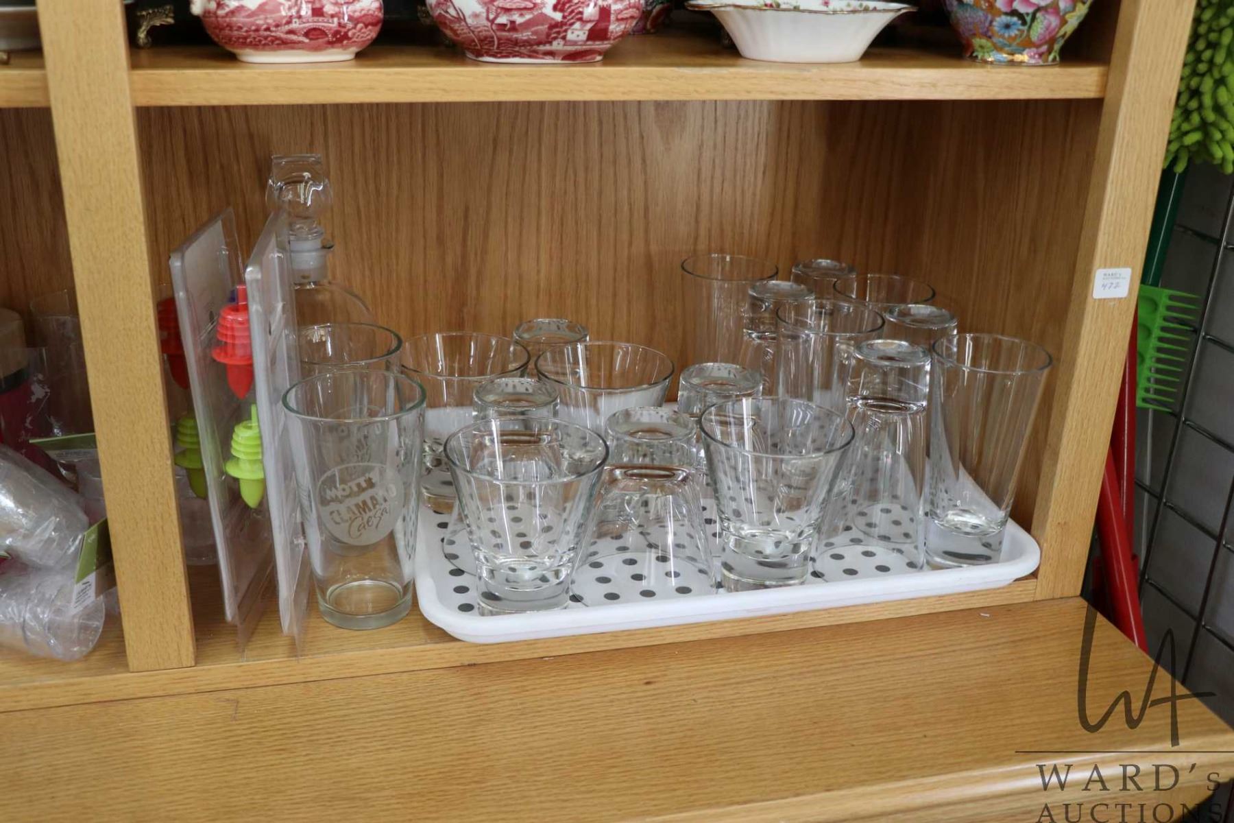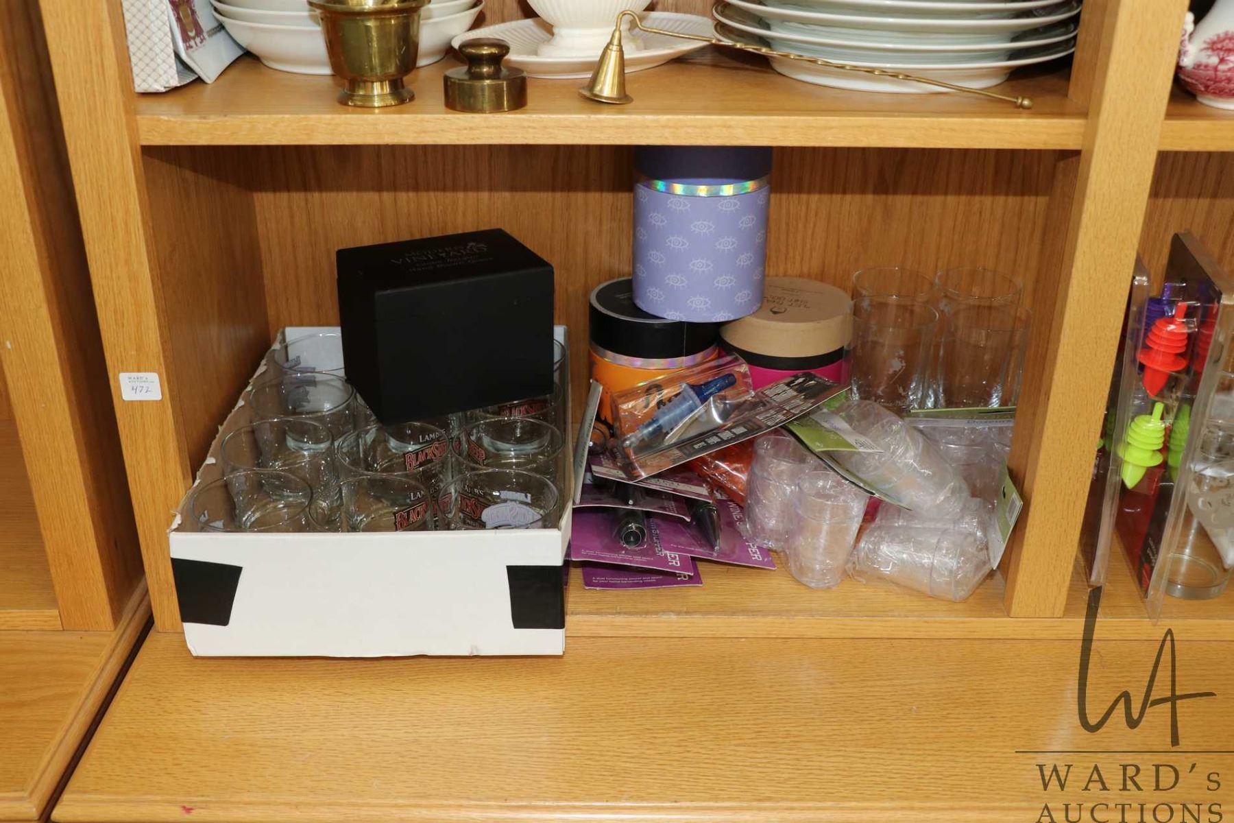 Lot 472 Shelf lot of new glassware including eight each of tall and short drinking glasses, twelve Lamb's Bl