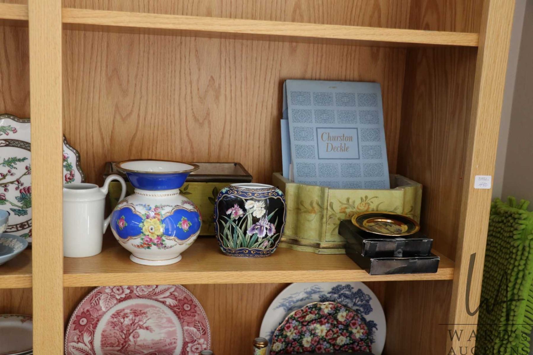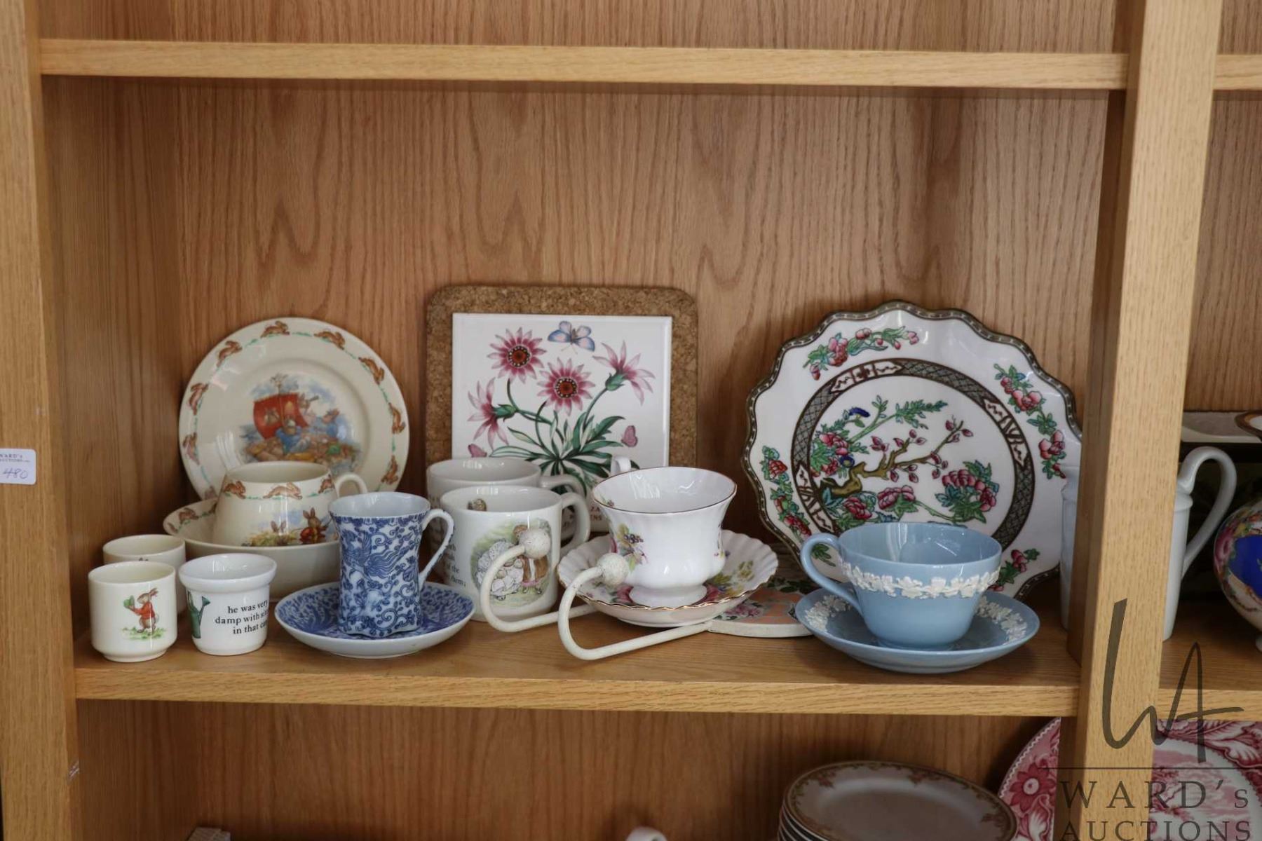 Lot 480 Shelf lot of collectibles including Coalport India Tree cake comport, Royal Doulton Bunnykins and We