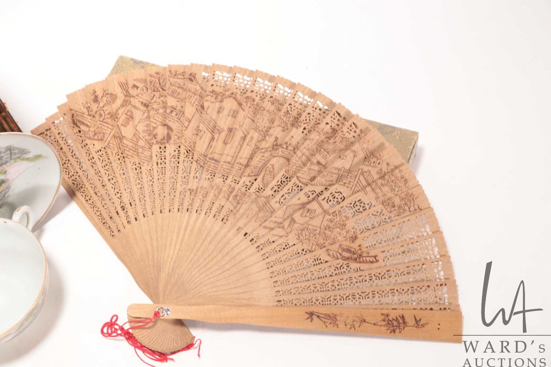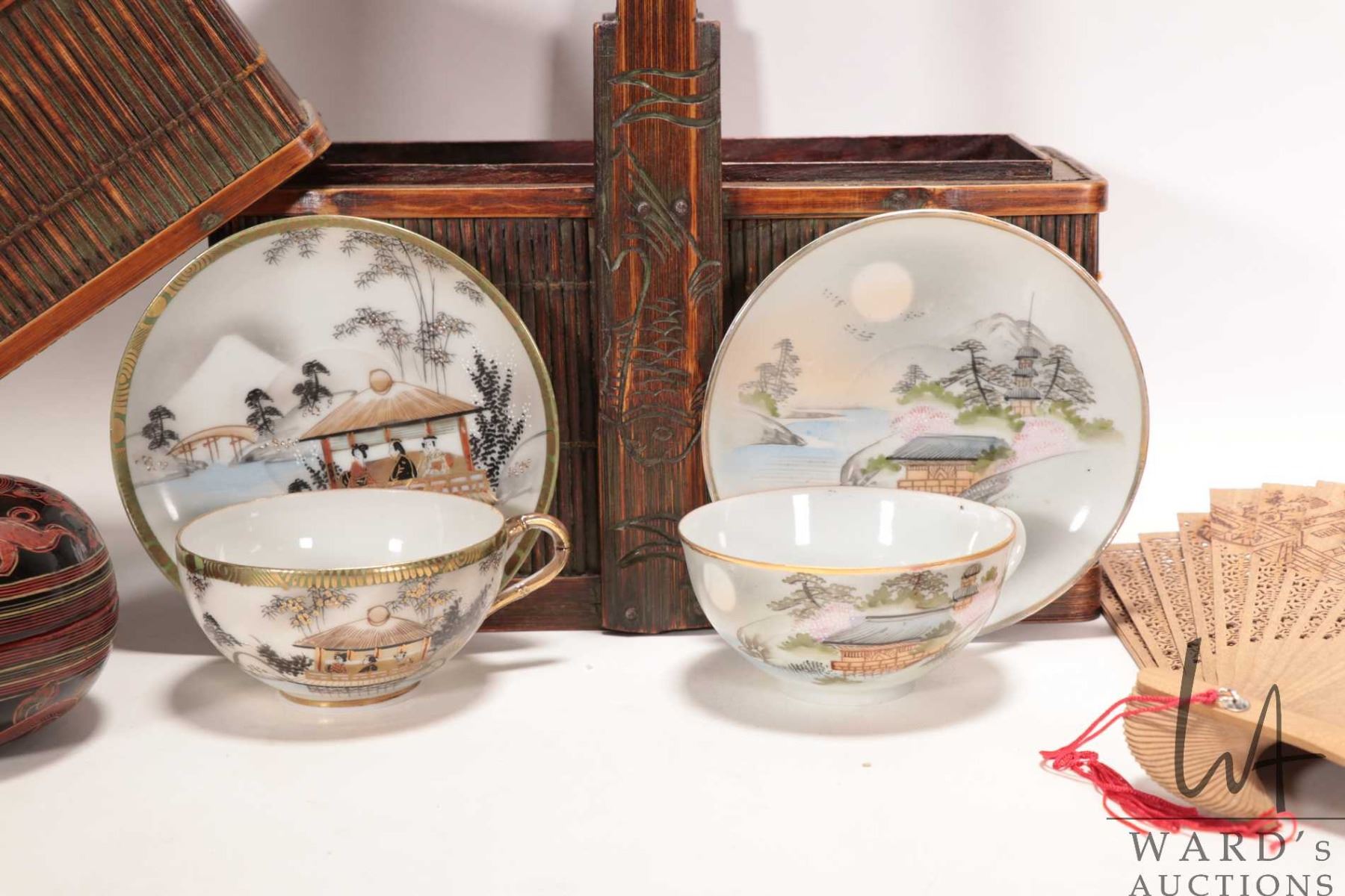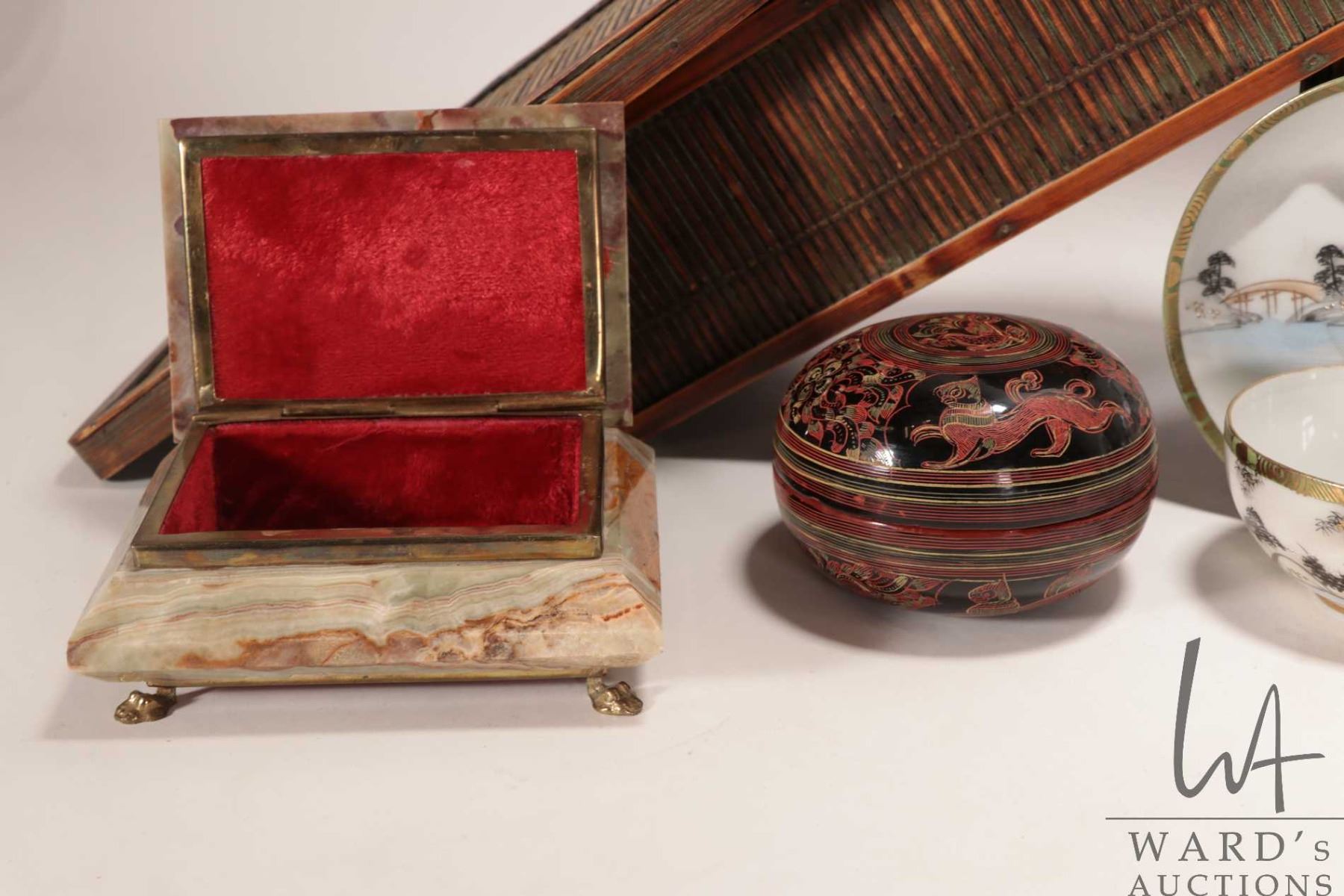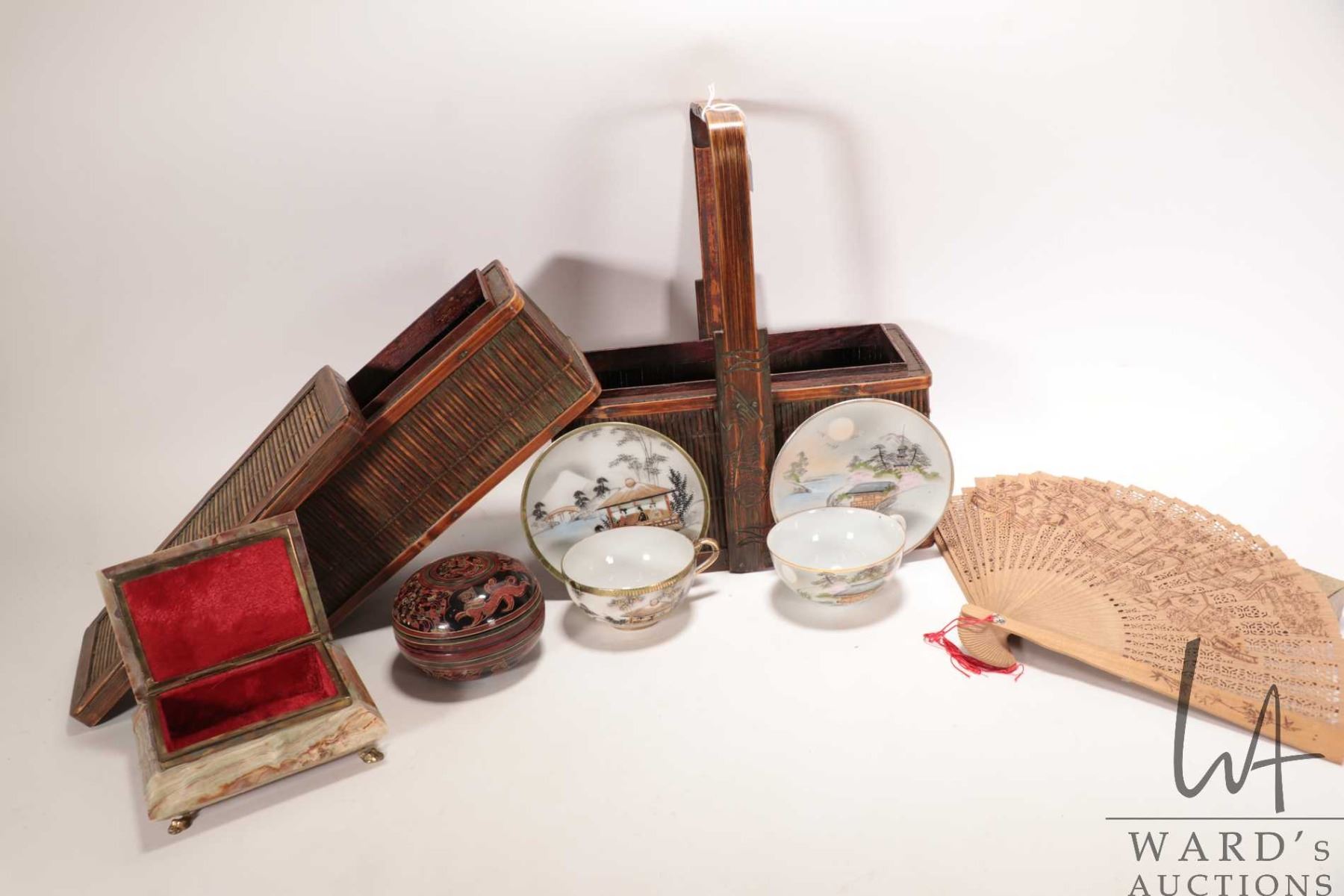 Vintage Chinese two tier wedding basket, 11" X 10" X 5", two Japanese Kutani-style tea cups and saucers, Burmese lacquer lidded box, vintage Chinese sandalwood filigree hand fan in fitted box and a green onyx marble jewellery box with brass fittings