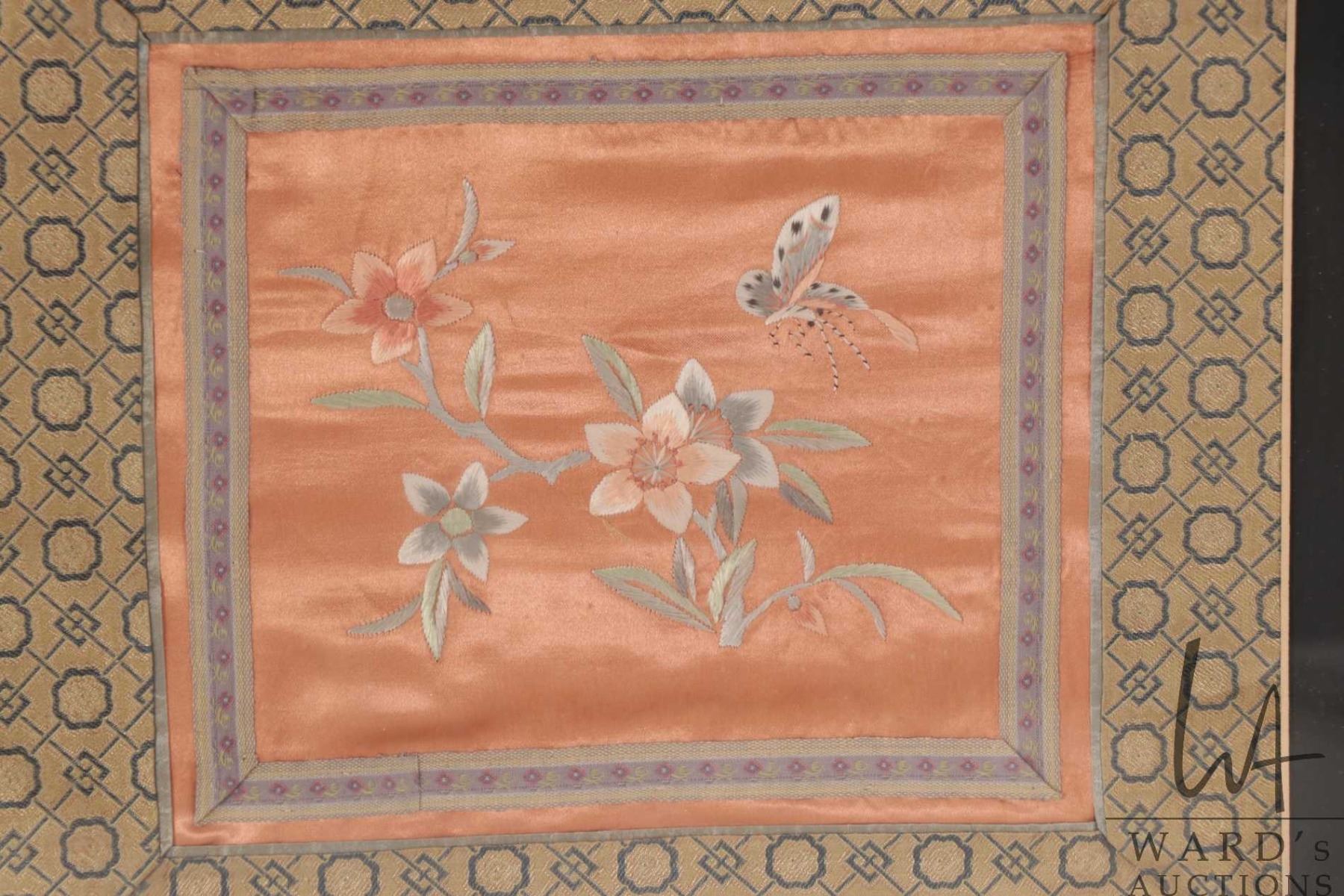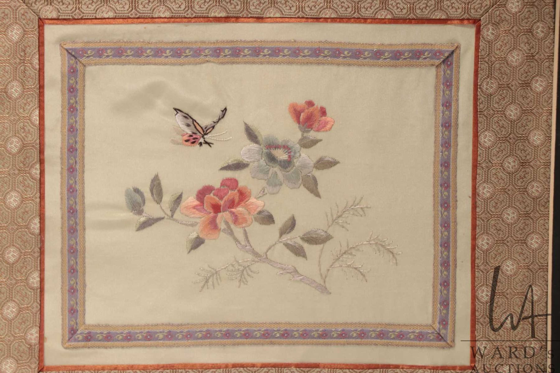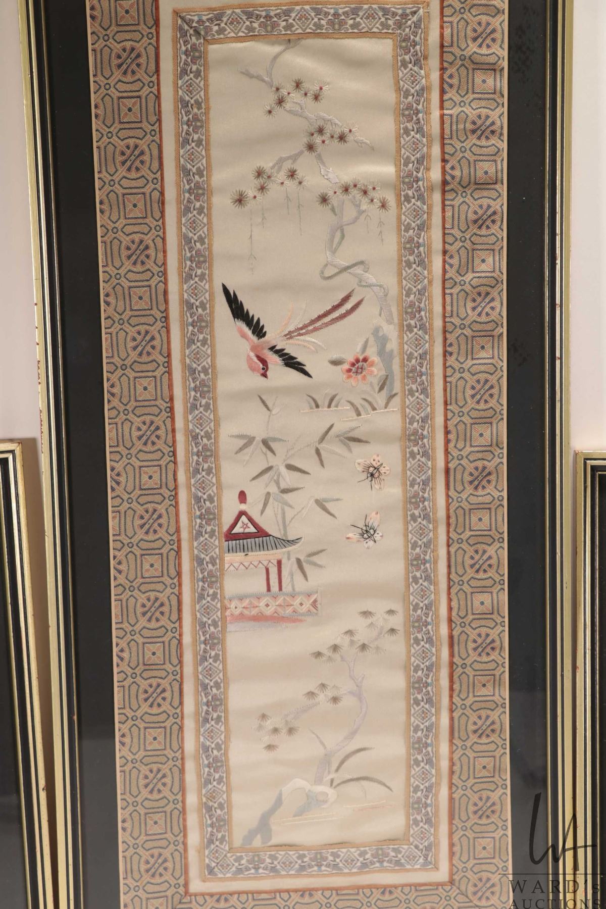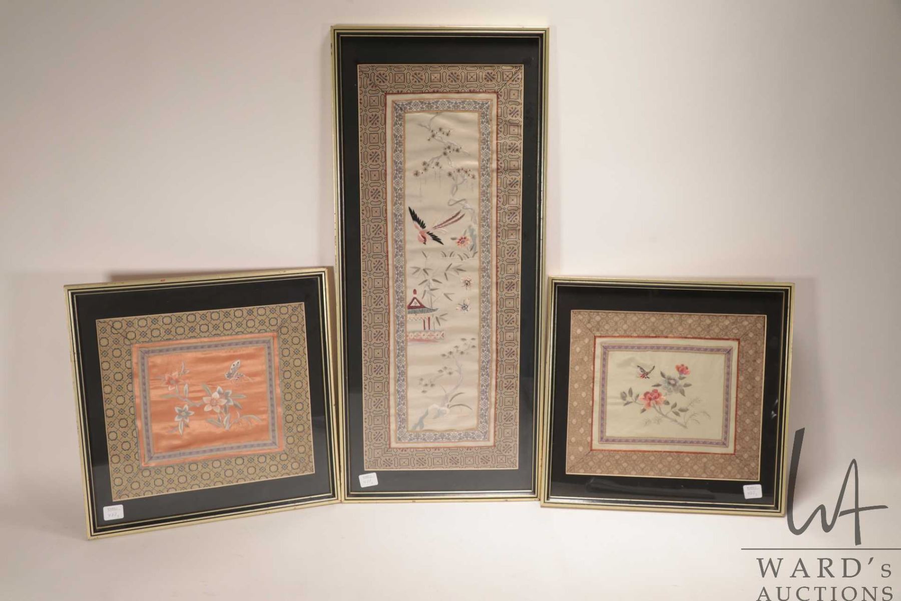 Lot 482 Three framed vintage Chinese silk embroidered panels including two 13" X 13" and a 26" X 11 1/2"