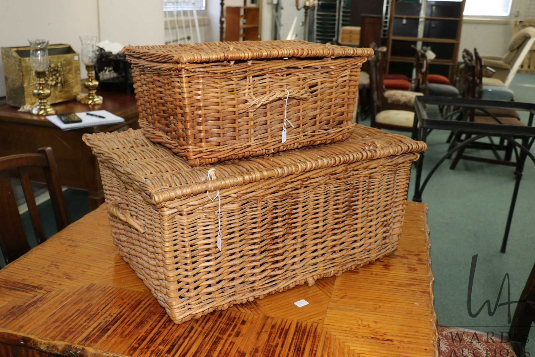 Lot 484 Two vintage wicker picnic baskets including 23" X 11" X 15", and 16" X 8" X 11"