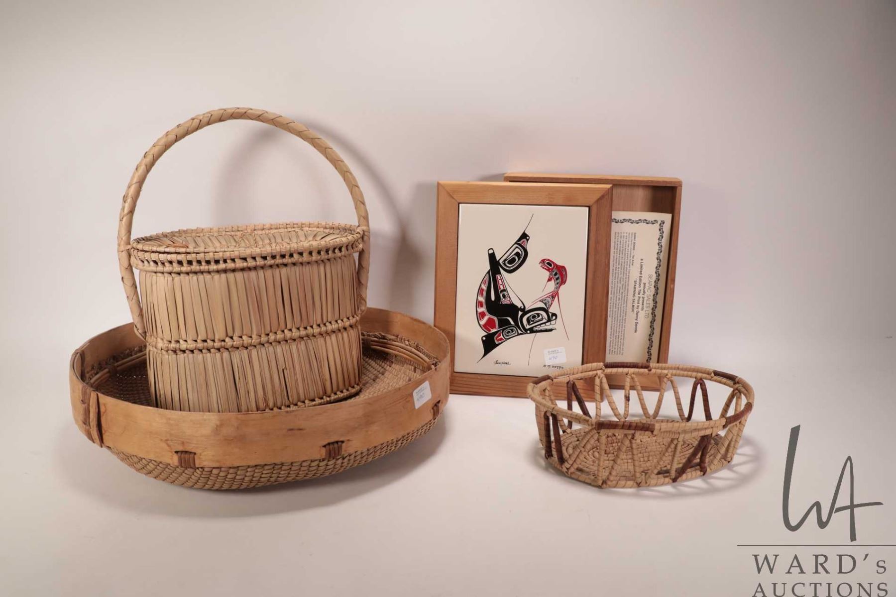Selection of woven baskets and a glazed tiled top cedar box "Survival" by D. M. Dennis10" X 8 1/4"