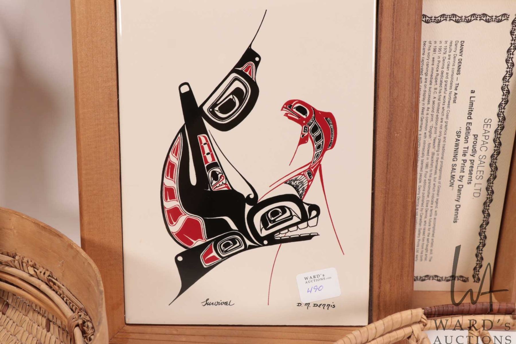 Lot 490 Selection of woven baskets and a glazed tiled top cedar box "Survival" by D. M. Dennis10" X 8 1/4"