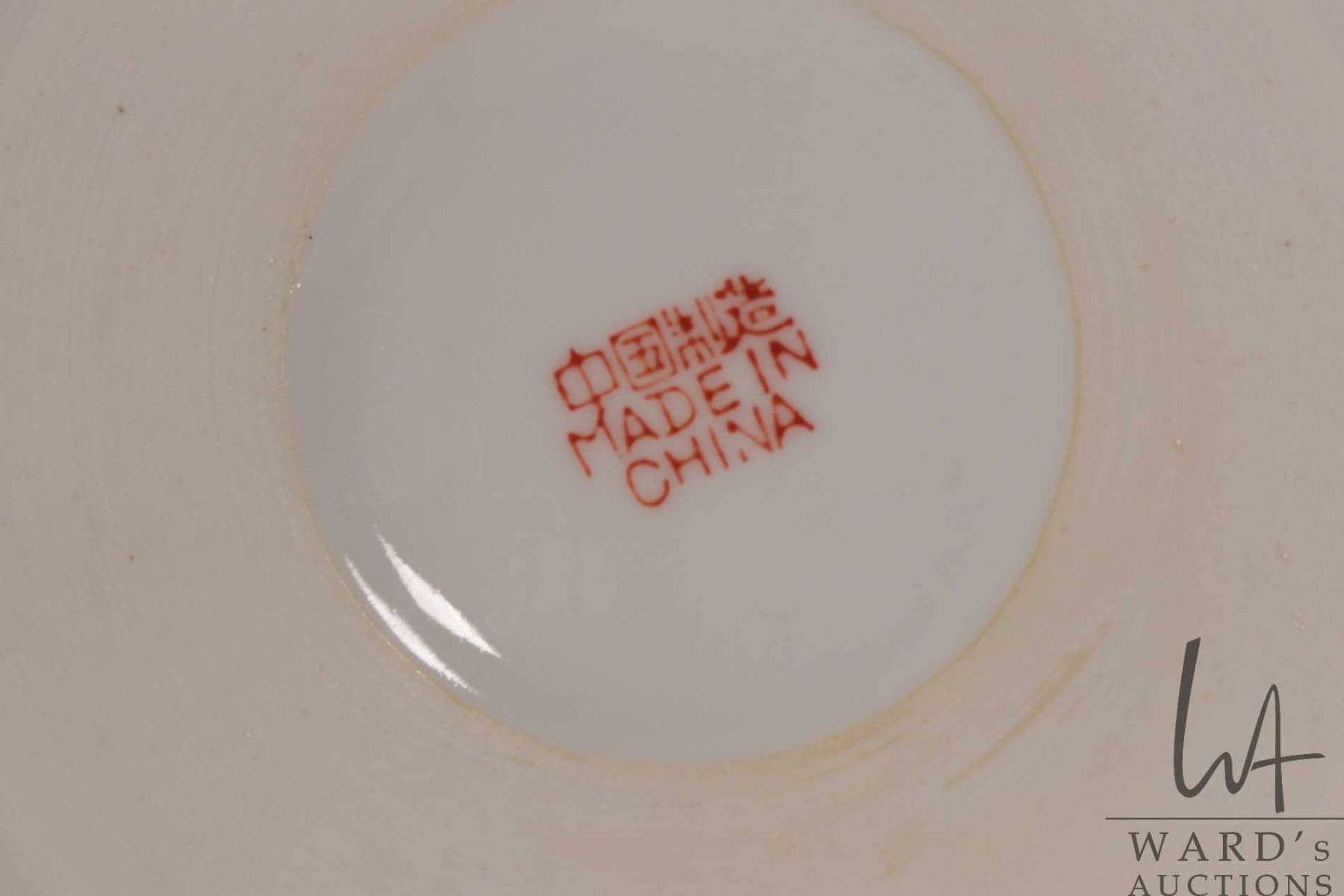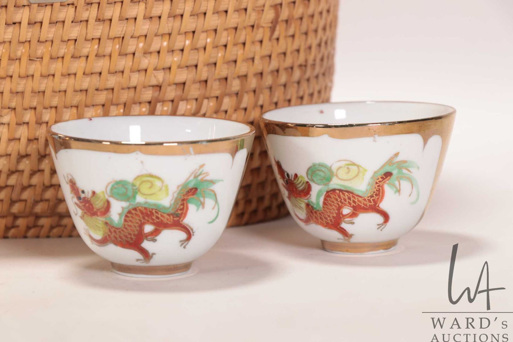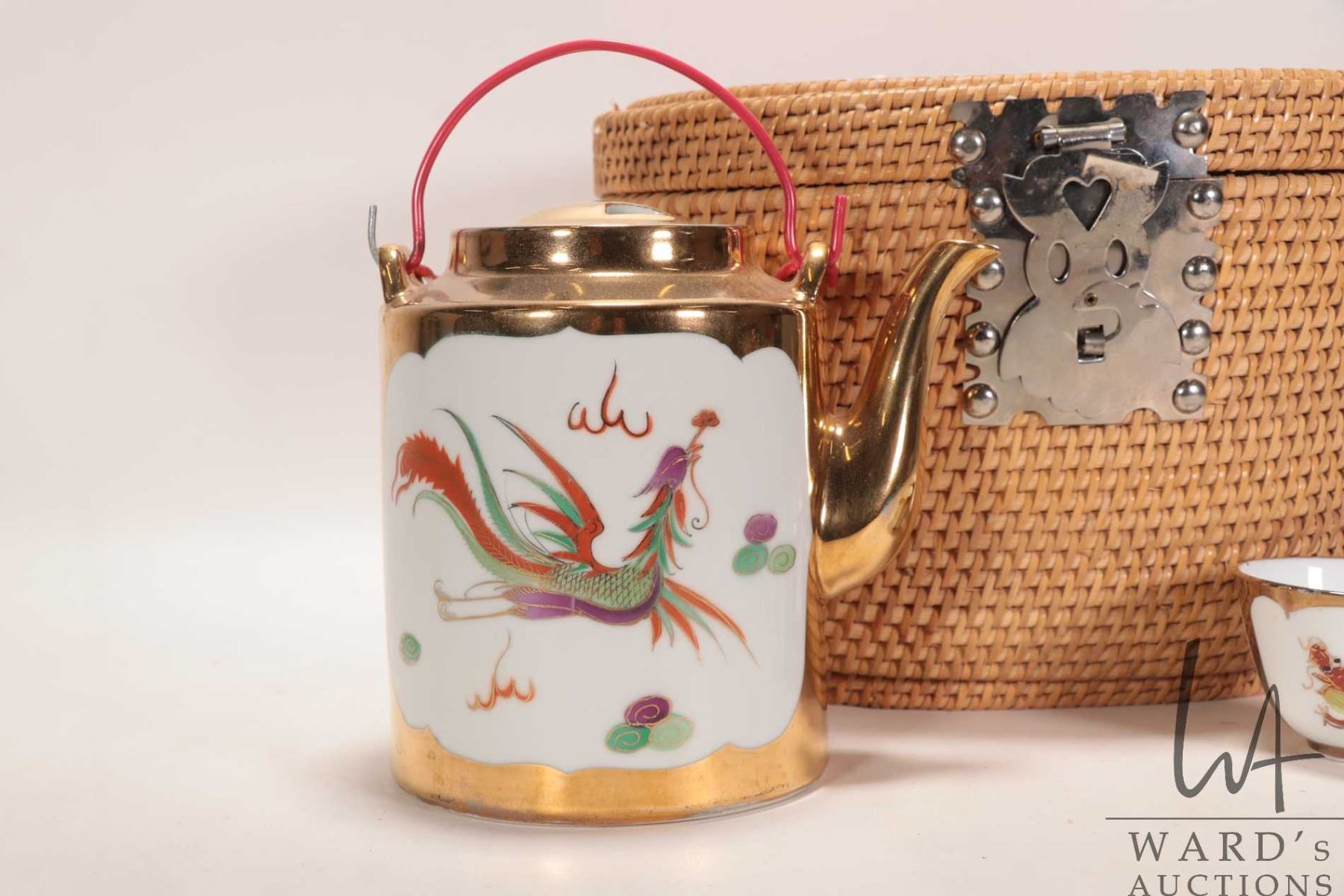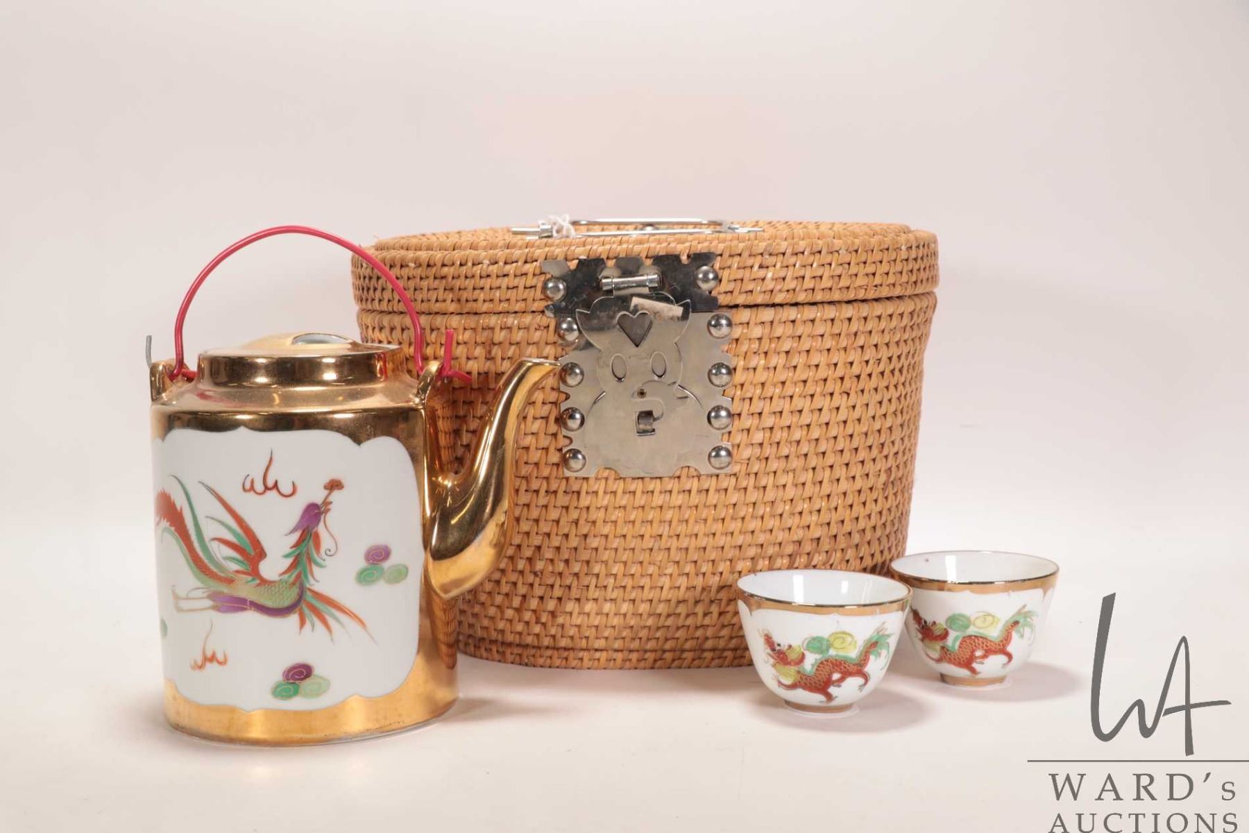 Lot 492 Vintage Chinese wicker tea basket with teapot and two cups