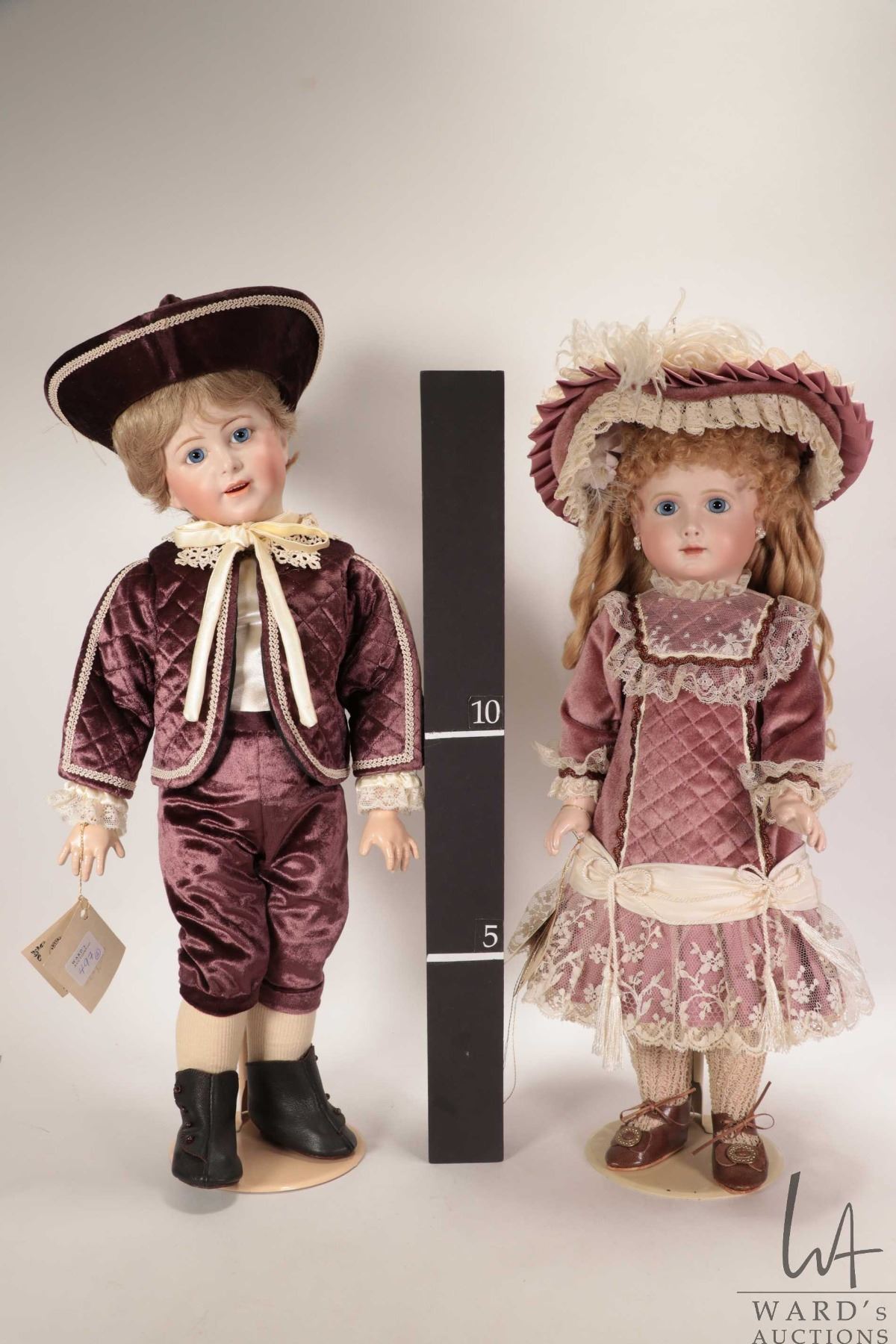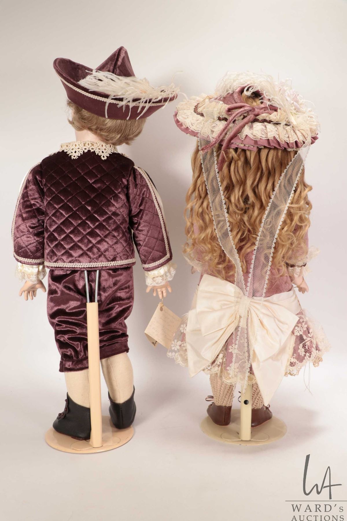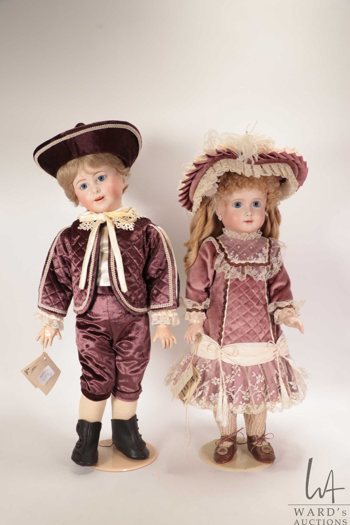 Two handmade reproduction dolls including A. T. 14 "Rentelle" with bisque head, threaded blue glass eyes, on five piece composition body, beautifully dressed with knitted socks, leather shoes, costume and hat plus a reproduction S.F.B.J. 238 with bisque head, threaded blue glass eyes, mohair wig, on five piece composition body, beautifully costumed. Both by doll artist Connie Drake and both approximately 18" in height