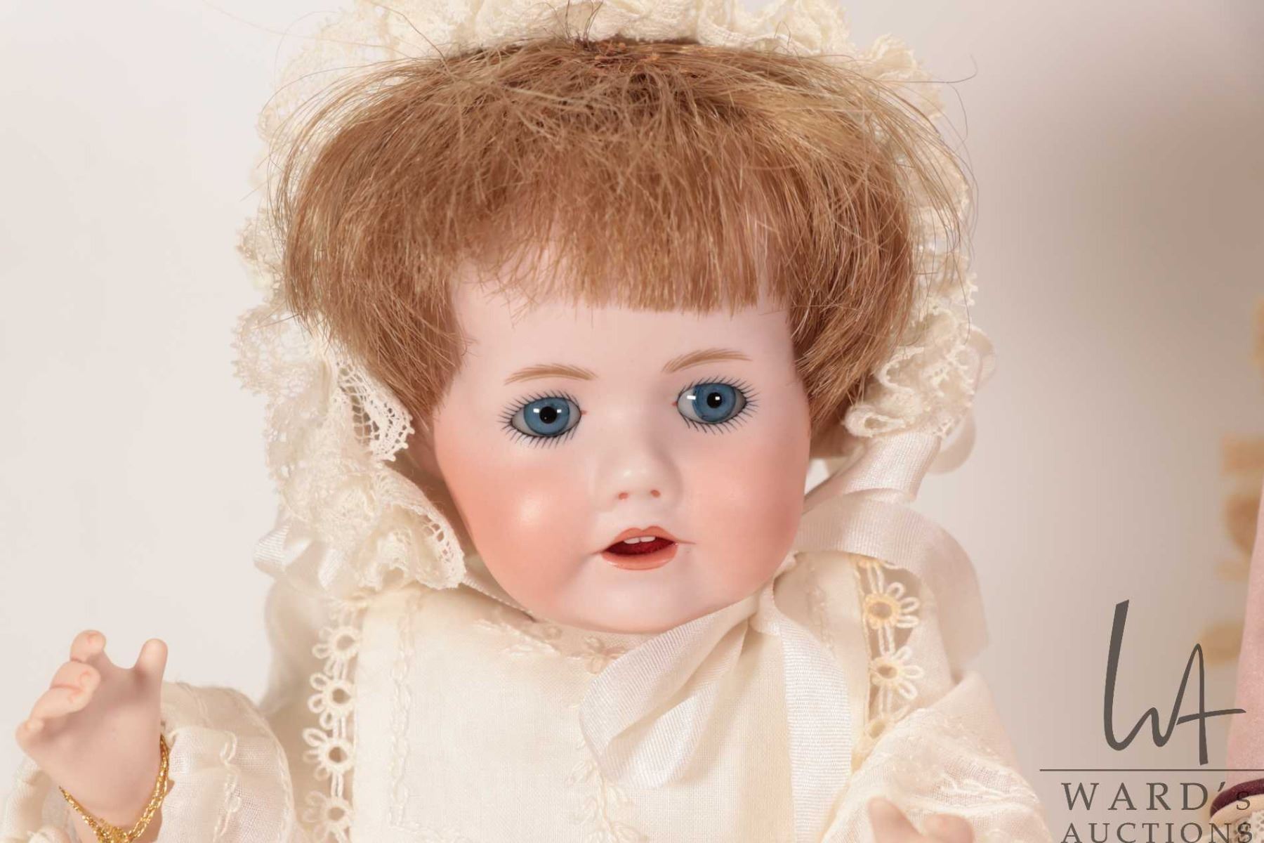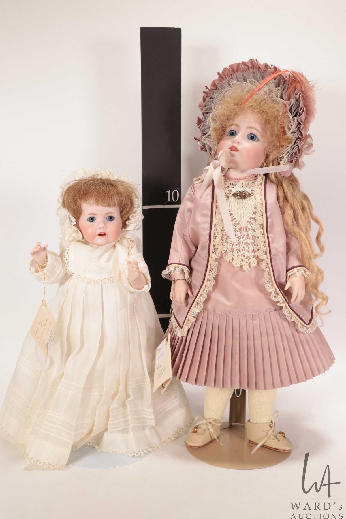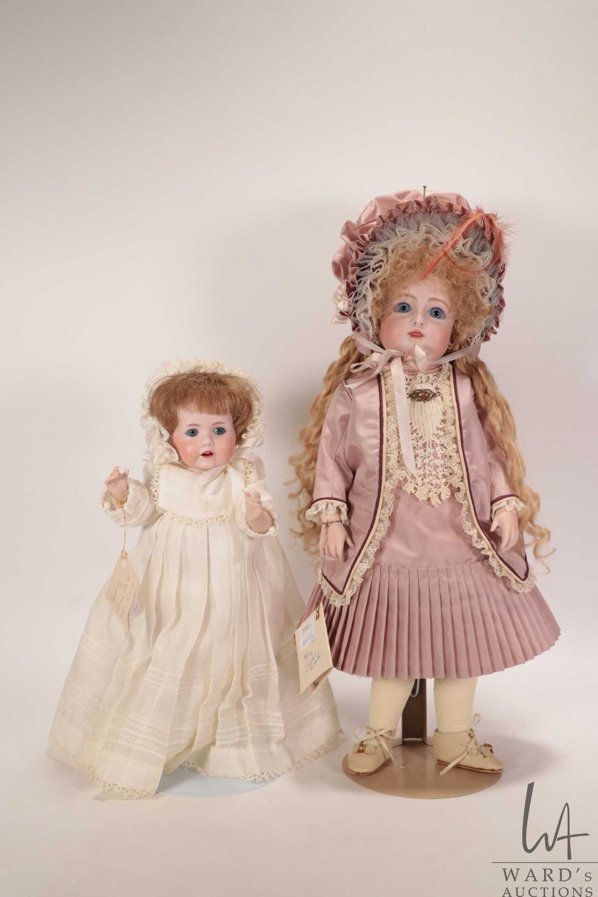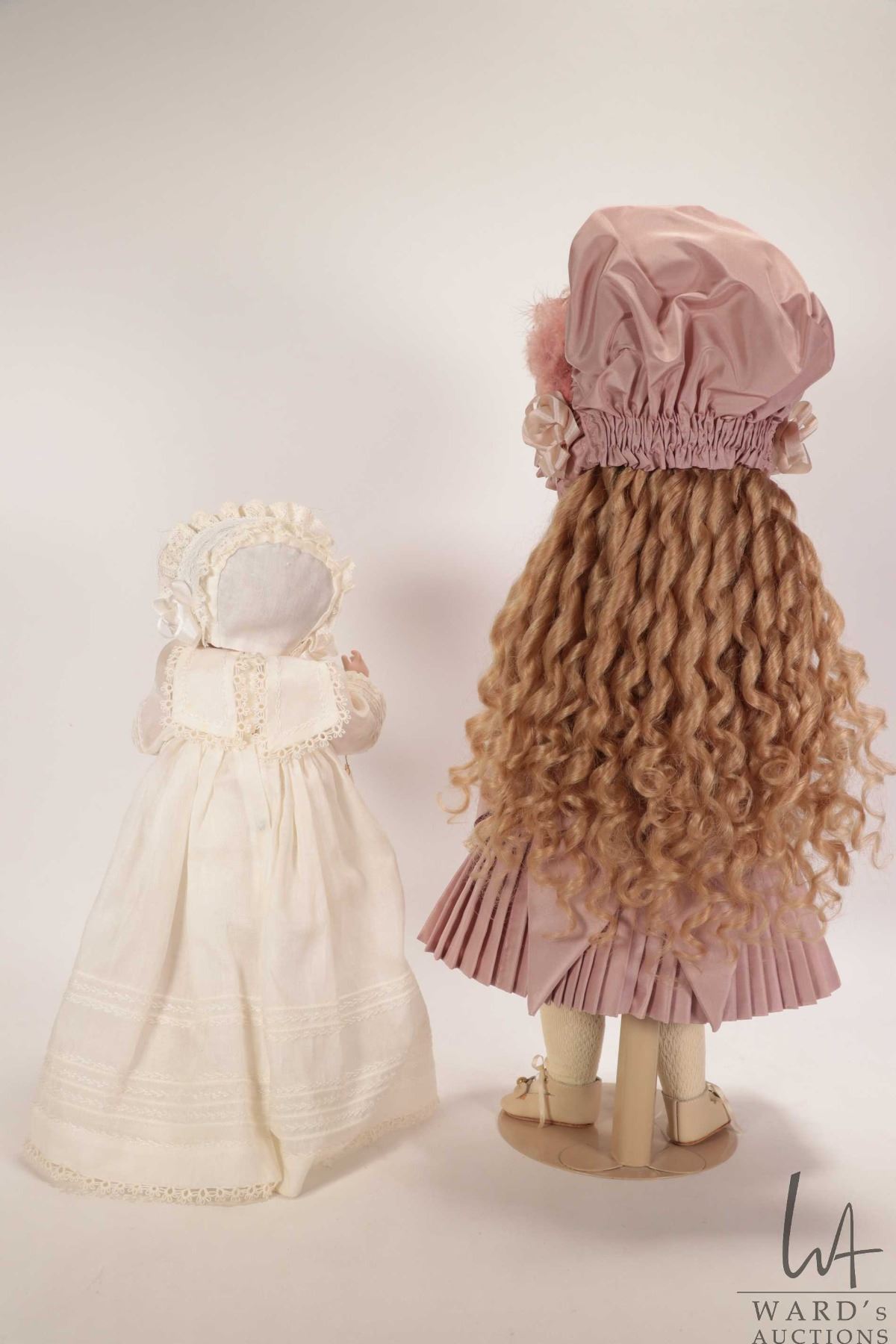 Two handmade reproduction dolls including Circle Dot Bru "Estelle", bisque head with threaded blue glass eyes, mohair wig, on composition body with bisque forearms, beautiful silk costume and hat, 14" in height plus a reproduction "Hilda" all bisque doll with glass eyes and handmade cotton christening gown, 11" in height. Both dolls by doll artist Connie Drake