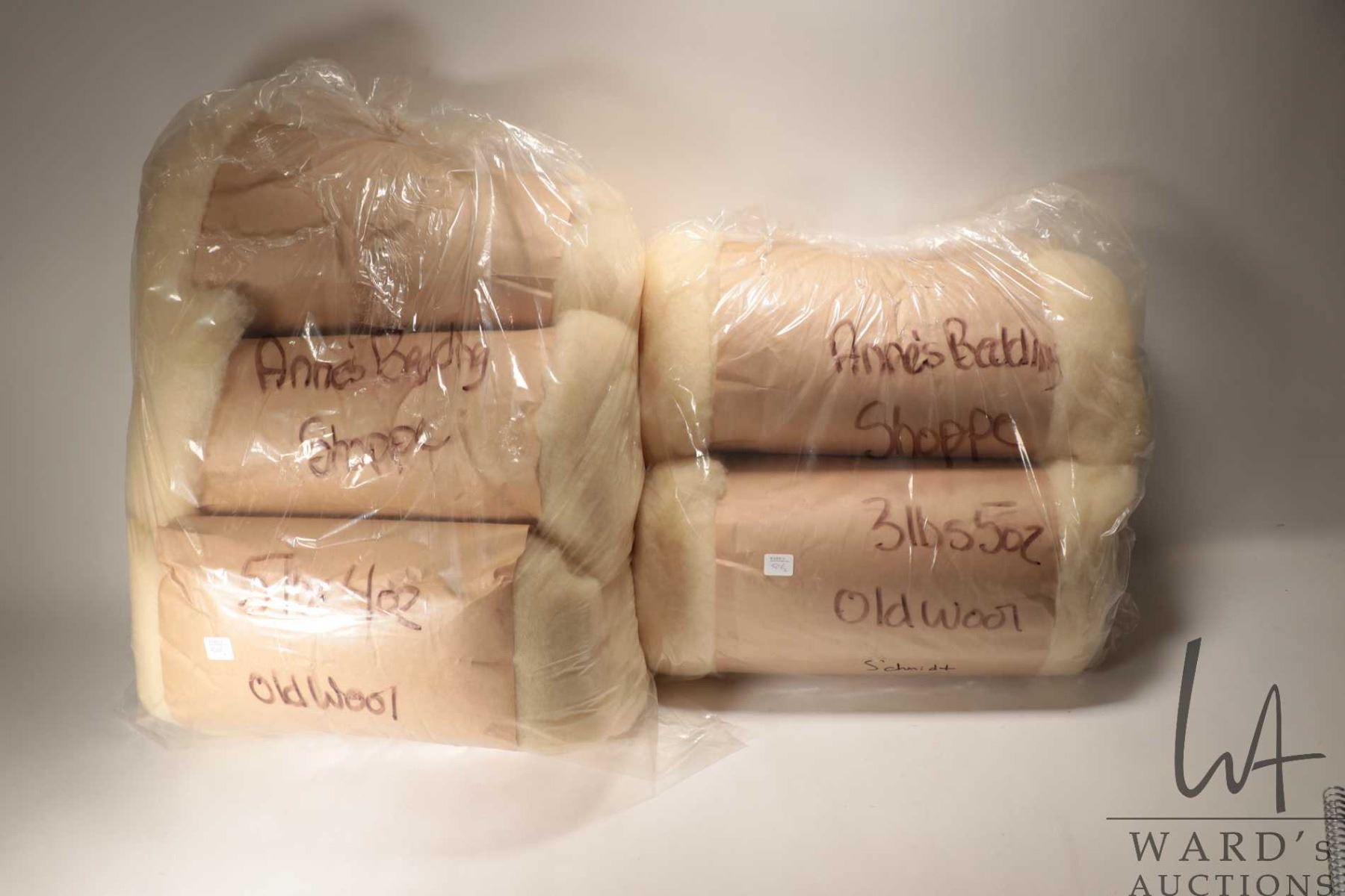 Two bags of wool batting including bag containing four rolls totaling 5 lbs. 4 oz and a bag containing two rolls totaling 3 lbs. 5 oz.