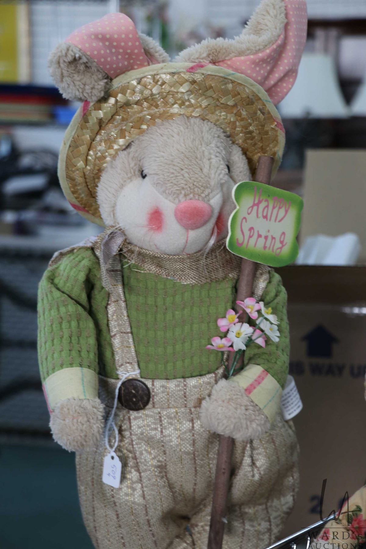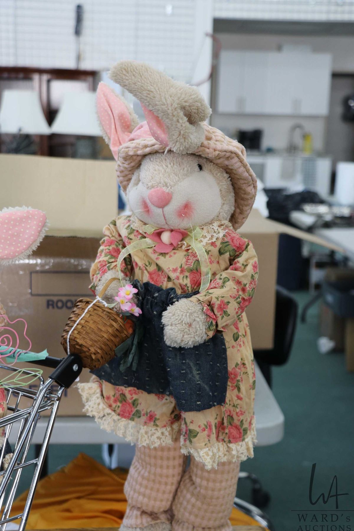 Lot 509 Three decor Easter rabbits including 24" mum and dad plus baby and a metal miniature shopping cart